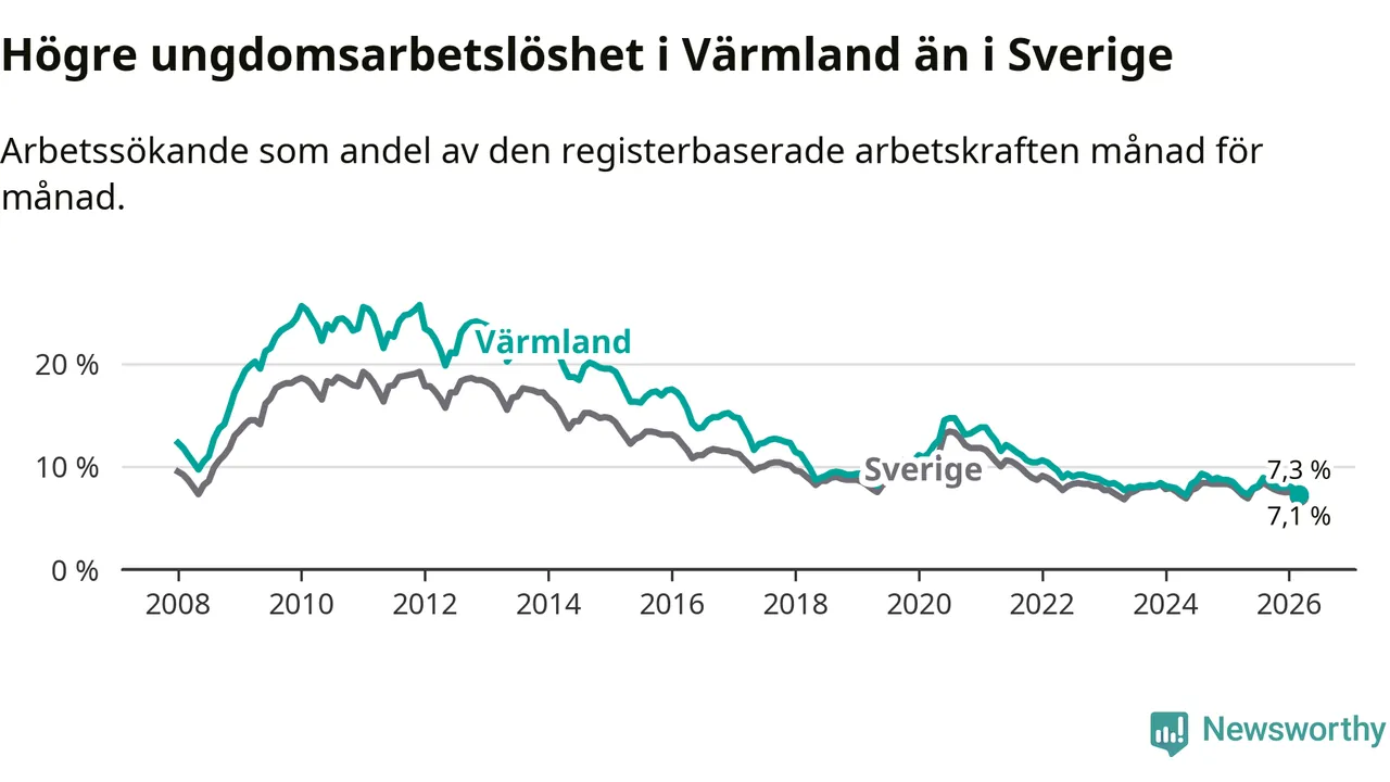Medan Värmland har lägre total arbetslöshet än Sverige, ligger ungdomsarbetslösheten 0,2 procentenheter högre i Värmland.