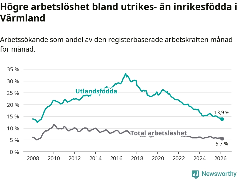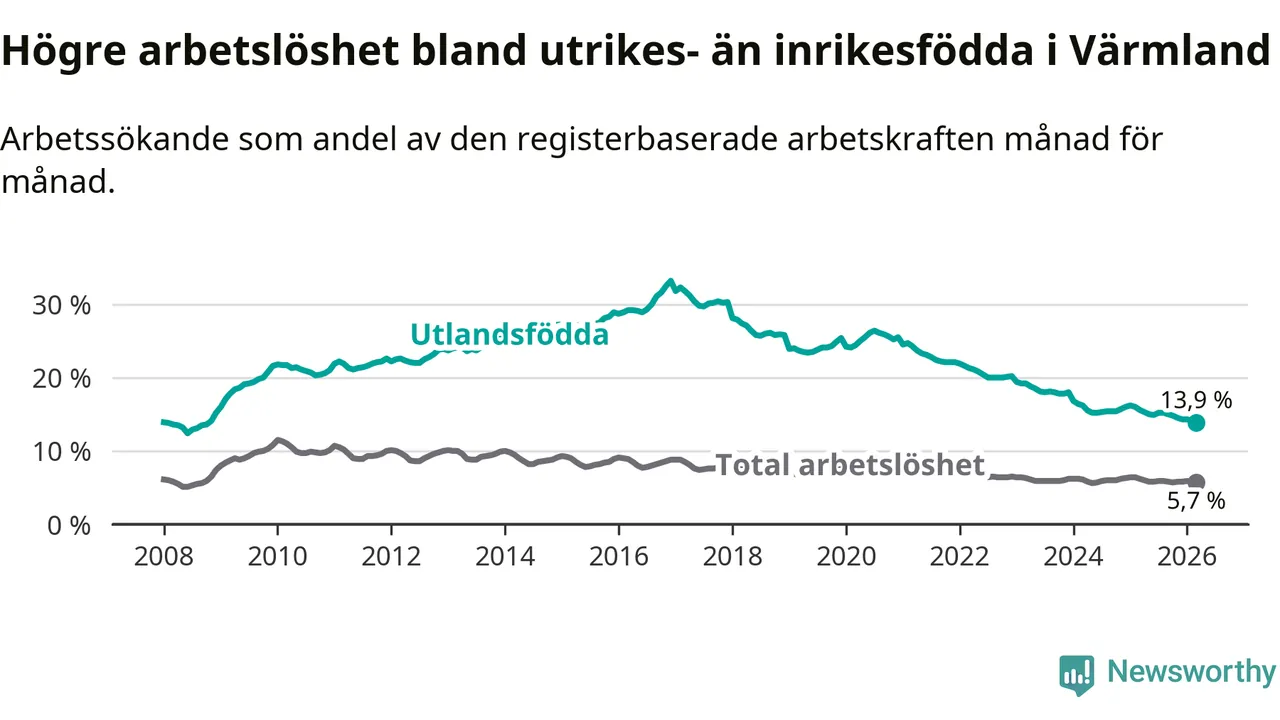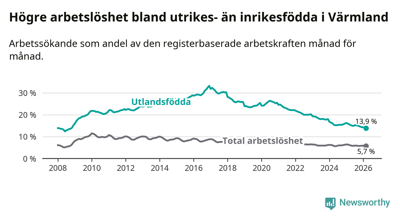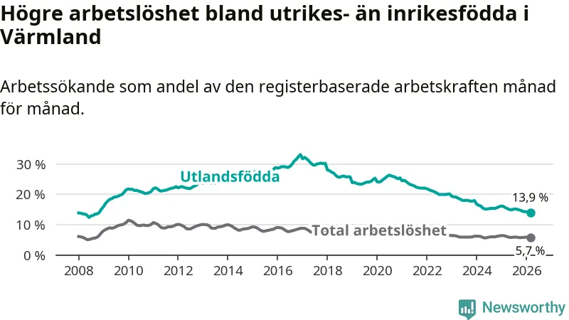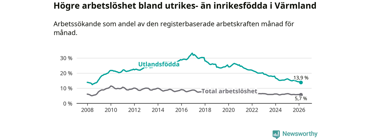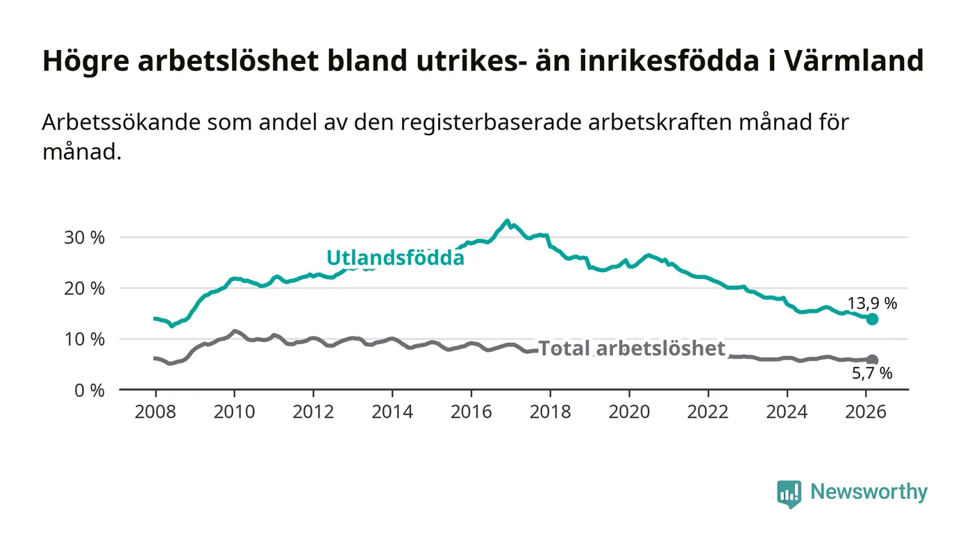 Arbetslösheten bland utlandsfödda var 13,9 procent i Värmland under mars månad, motsvarande 3 041 av 21 878 personer. Det är 1,7 procentenheter färre än vid samma tidpunkt i fjol (−322 om man räknar personer). Därmed har de utlandsföddas arbetslöshet varit lägre än vid samma tidpunkt i fjol i över fem år i sträck. Sedan februari 2021 har arbetslösheten bland utlandsfödda minskat från 24,7 till 13,9 procent. Den nuvarande arbetslöshetsnivån är den lägsta sedan oktober 2008.