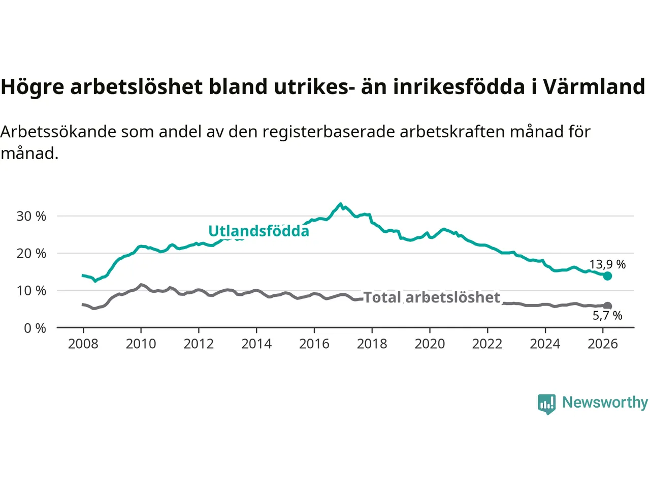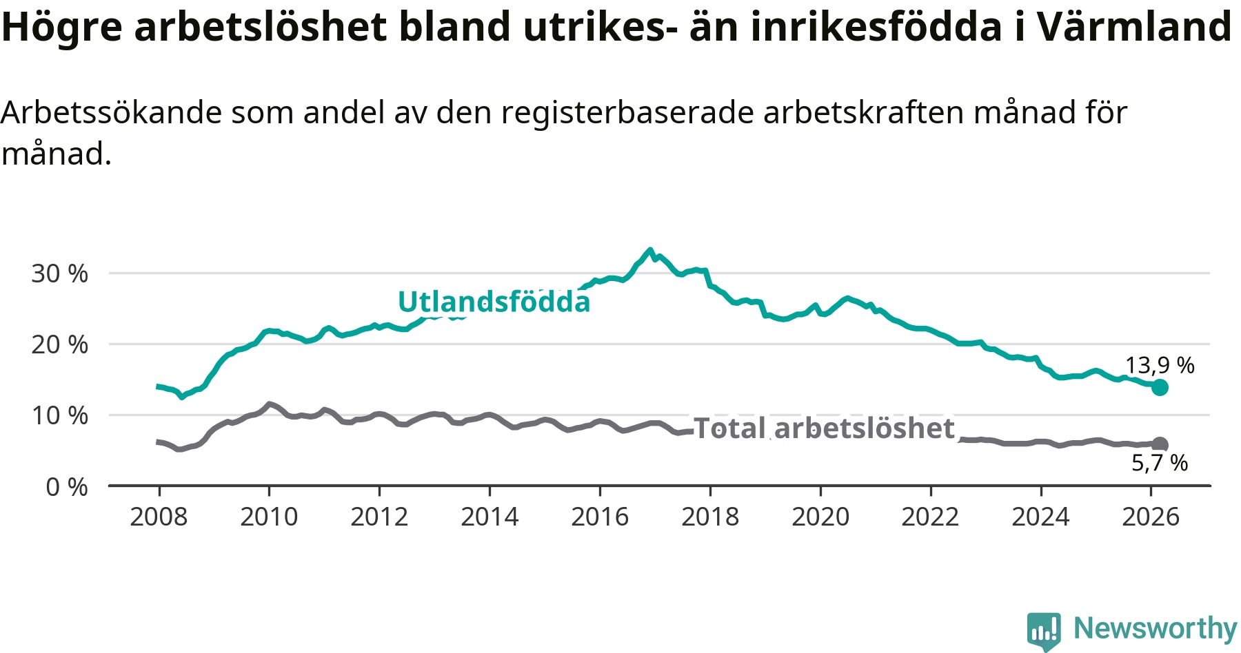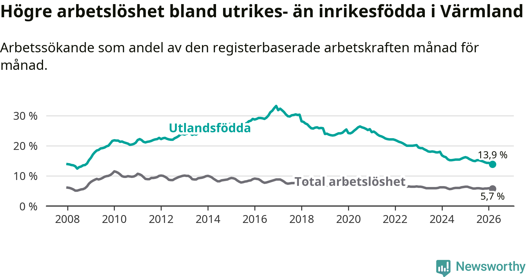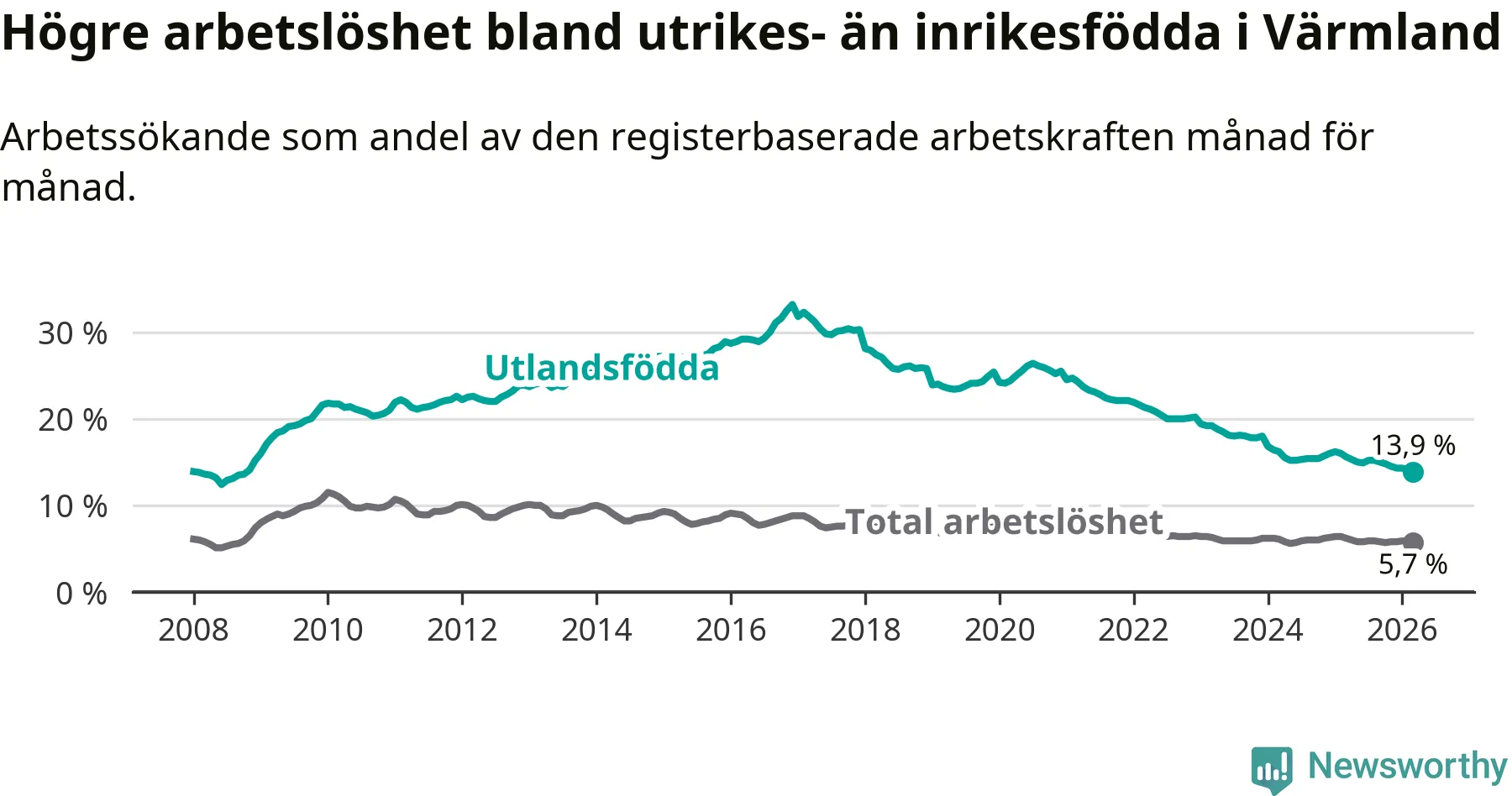 Arbetslösheten bland utlandsfödda var 13,9 procent i Värmland under mars månad, motsvarande 3 041 av 21 878 personer. Det är 1,7 procentenheter färre än vid samma tidpunkt i fjol (−322 om man räknar personer). Därmed har de utlandsföddas arbetslöshet varit lägre än vid samma tidpunkt i fjol i över fem år i sträck. Sedan februari 2021 har arbetslösheten bland utlandsfödda minskat från 24,7 till 13,9 procent. Den nuvarande arbetslöshetsnivån är den lägsta sedan oktober 2008.