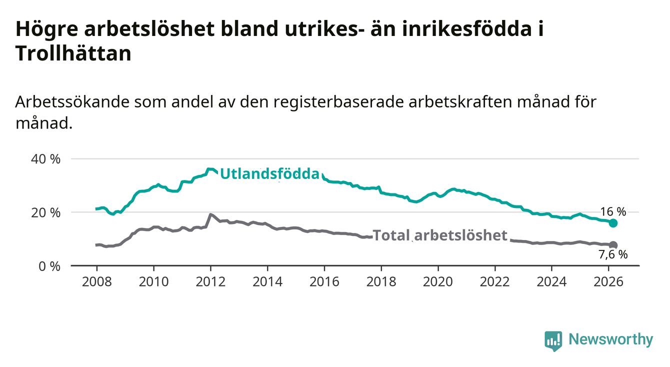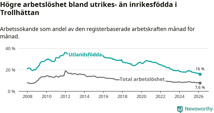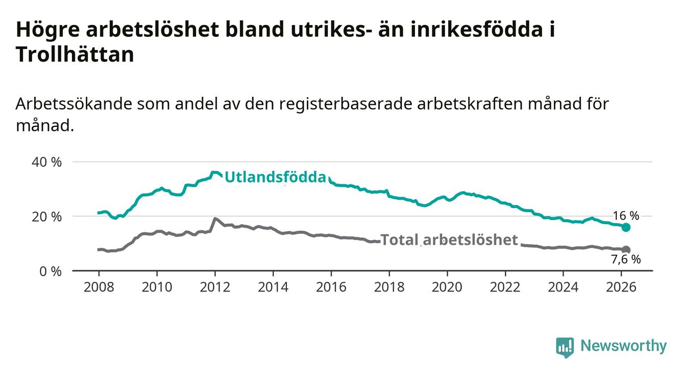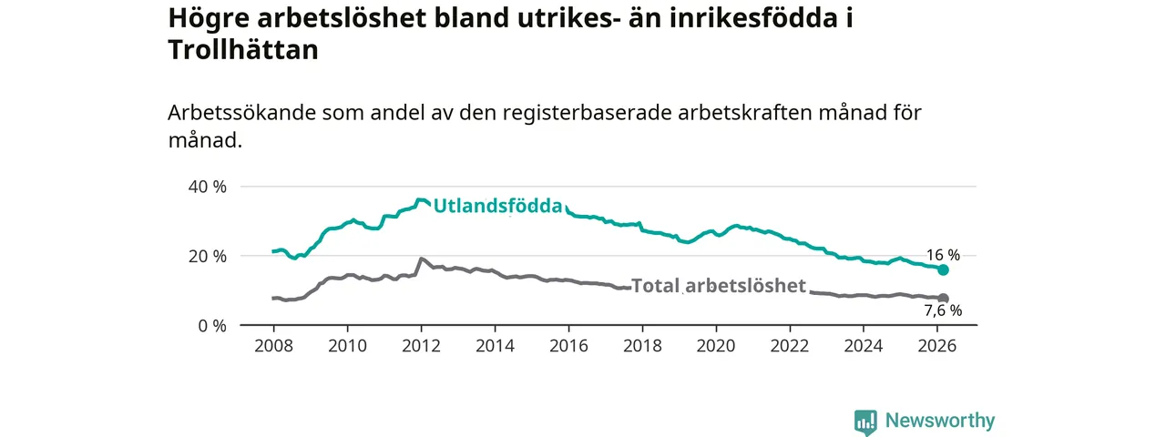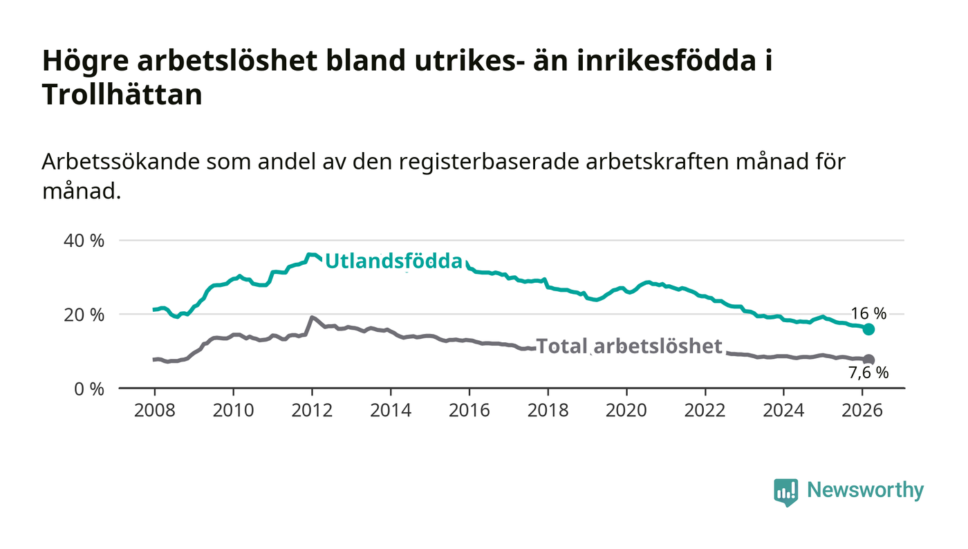 Arbetslösheten bland utlandsfödda var 16,0 procent i Trollhättan under mars månad, motsvarande 1 274 av 7 963 personer. Det är 2,6 procentenheter färre än vid samma tidpunkt i fjol (−184 om man räknar personer). Därmed är de utlandsföddas arbetslöshet lägre än vid samma tidpunkt i fjol för tionde månaden i följd. Sedan maj 2025 har arbetslösheten bland utlandsfödda minskat från 17,8 till 16,0 procent. Den nuvarande arbetslöshetsnivån är den lägsta sedan januari 2008.