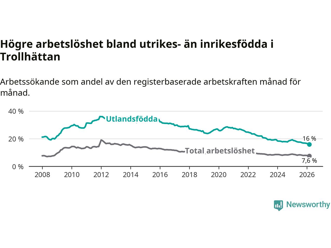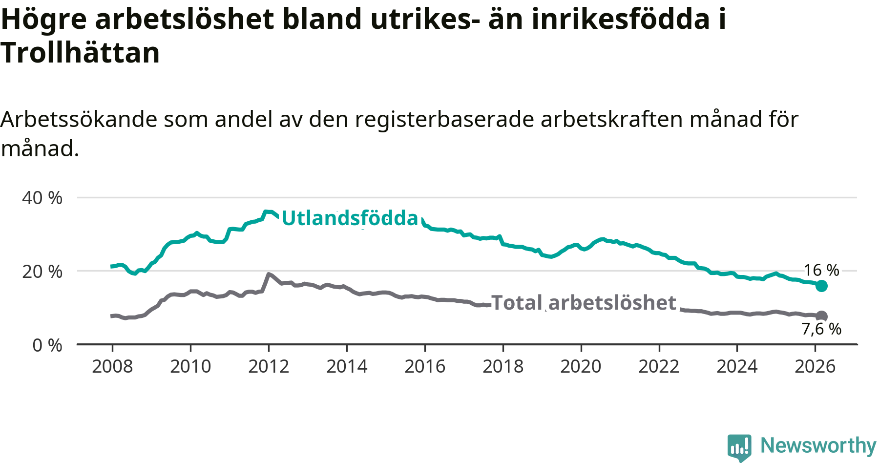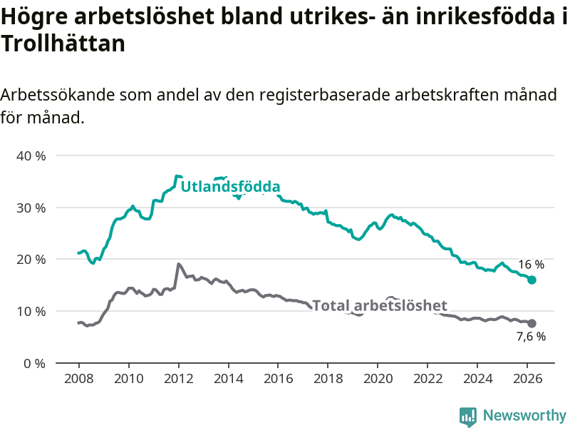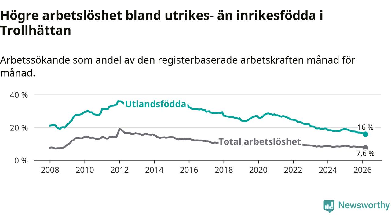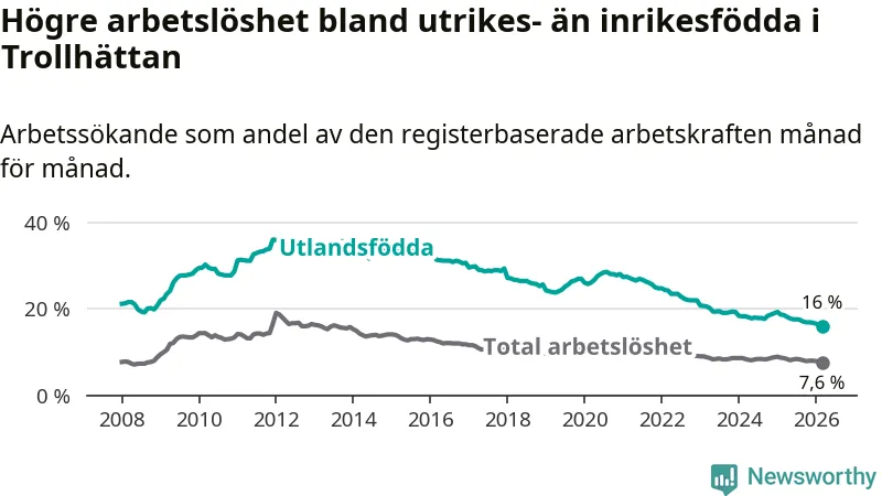 Arbetslösheten bland utlandsfödda var 16,0 procent i Trollhättan under mars månad, motsvarande 1 274 av 7 963 personer. Det är 2,6 procentenheter färre än vid samma tidpunkt i fjol (−184 om man räknar personer). Därmed är de utlandsföddas arbetslöshet lägre än vid samma tidpunkt i fjol för tionde månaden i följd. Sedan maj 2025 har arbetslösheten bland utlandsfödda minskat från 17,8 till 16,0 procent. Den nuvarande arbetslöshetsnivån är den lägsta sedan januari 2008.
