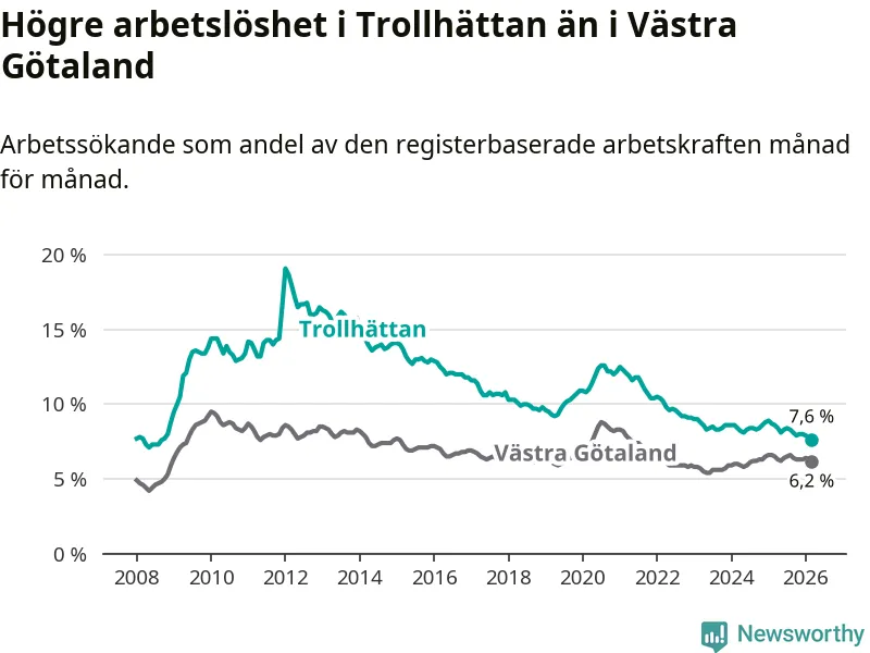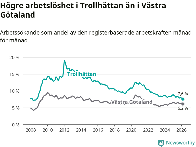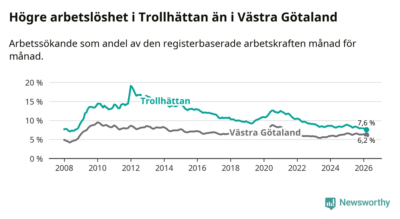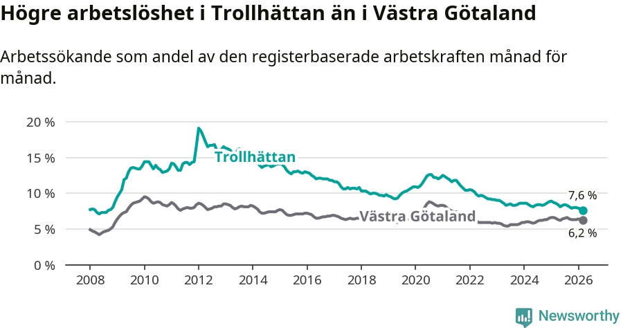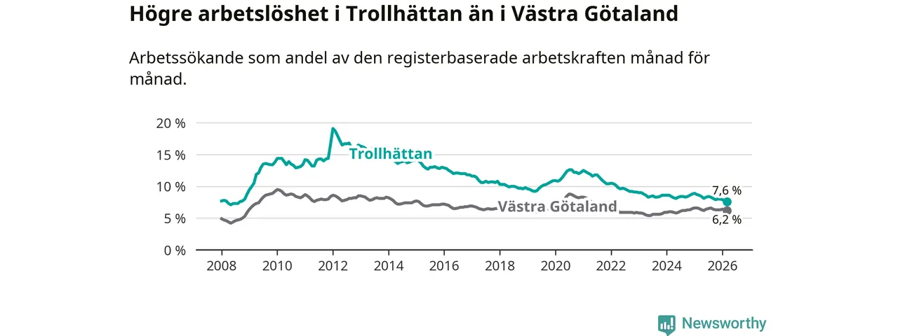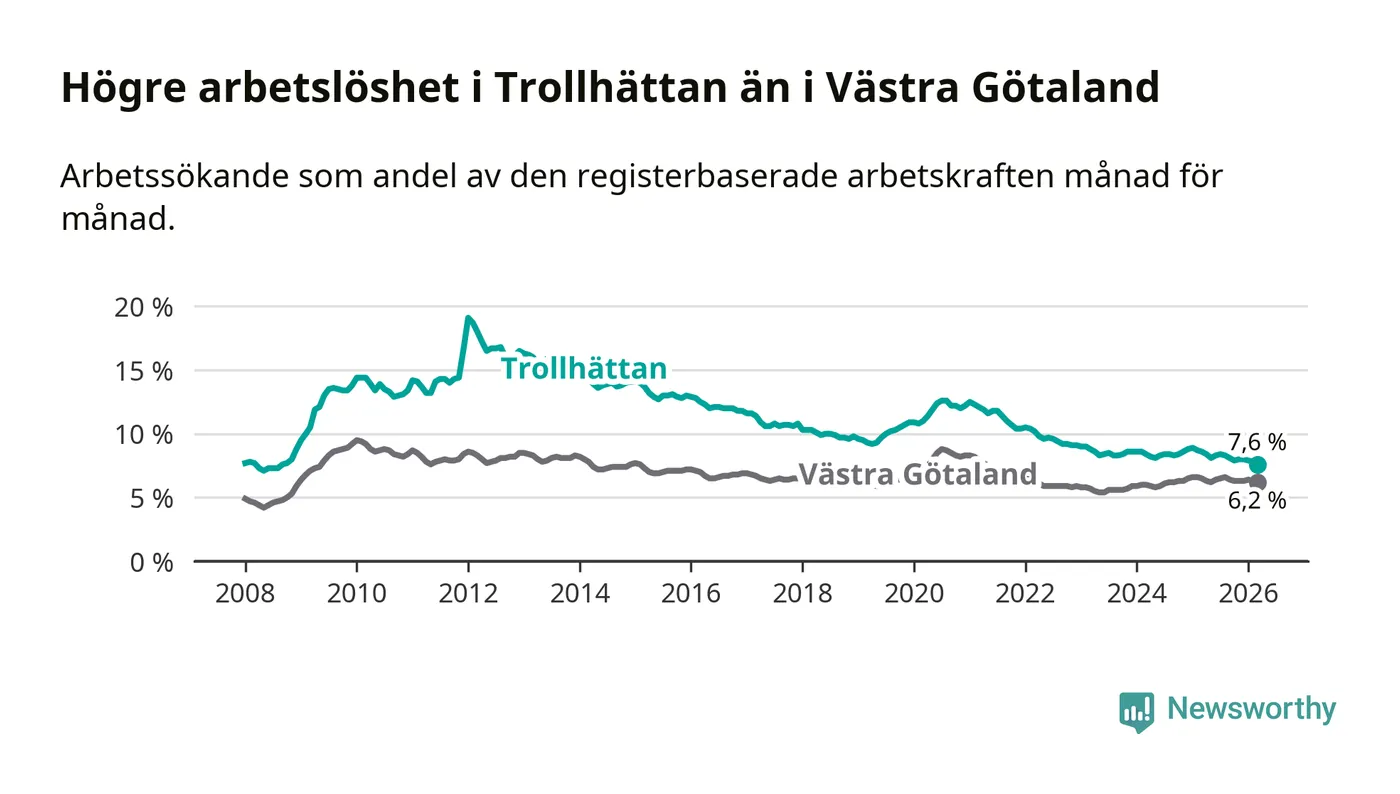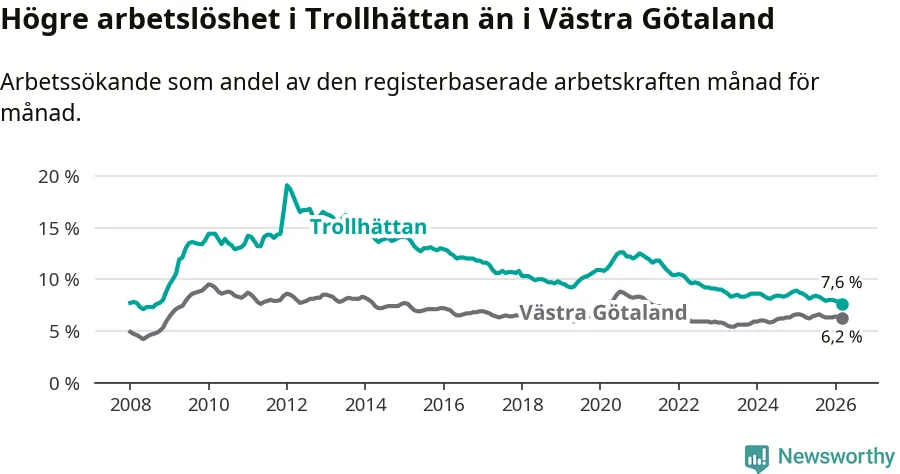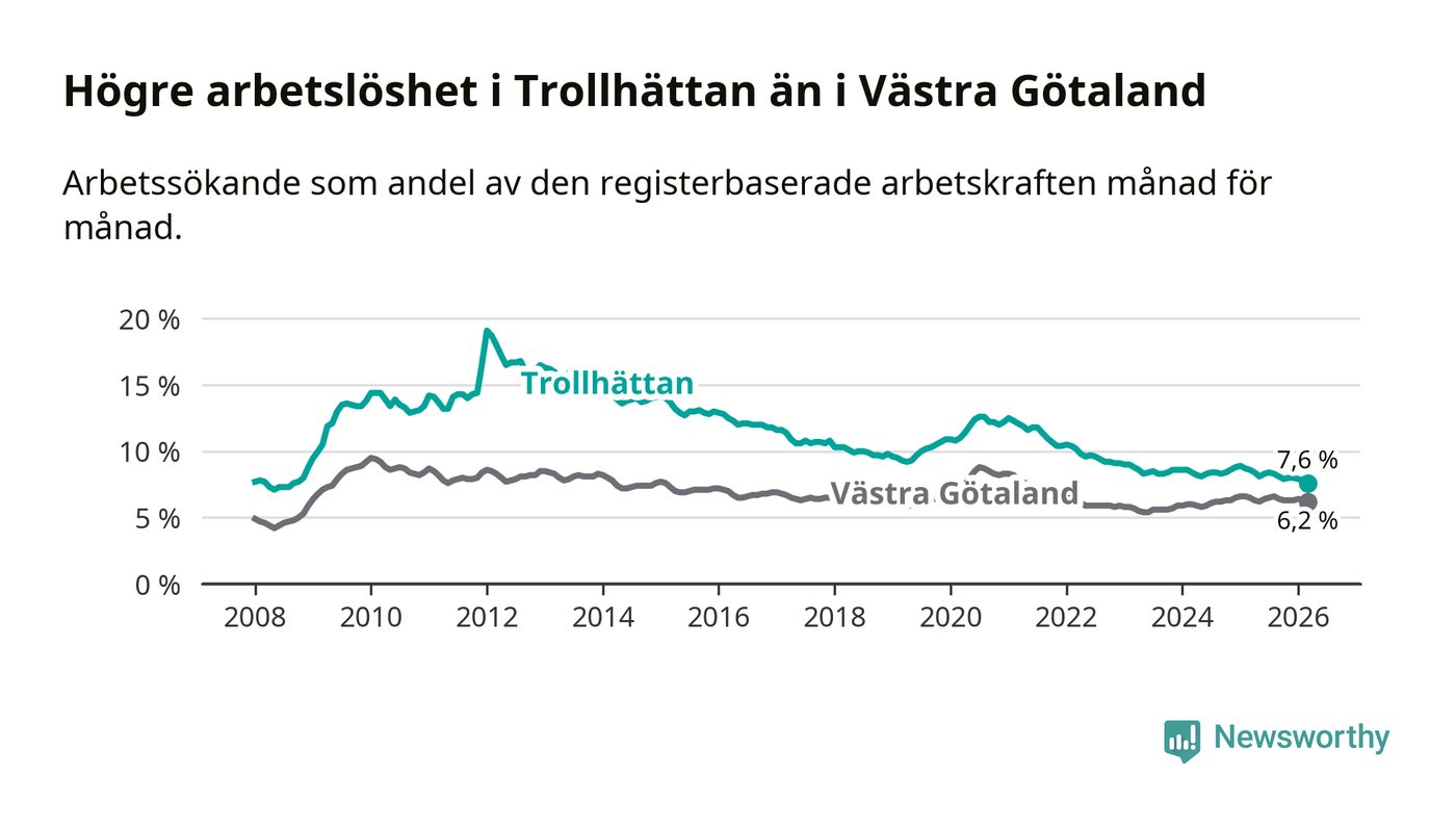 Under mars månad rapporterade Trollhättans kommun en total arbetslöshet på 7,6 procent. Det är en minskning jämfört med samma tidpunkt i fjol (−1,0 procentenheter). Även i Västra Götalands län sjunker arbetslösheten .