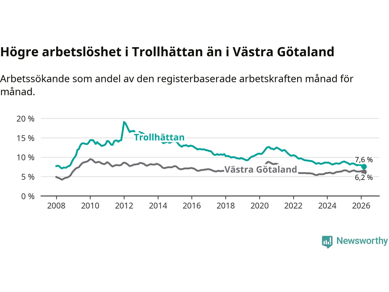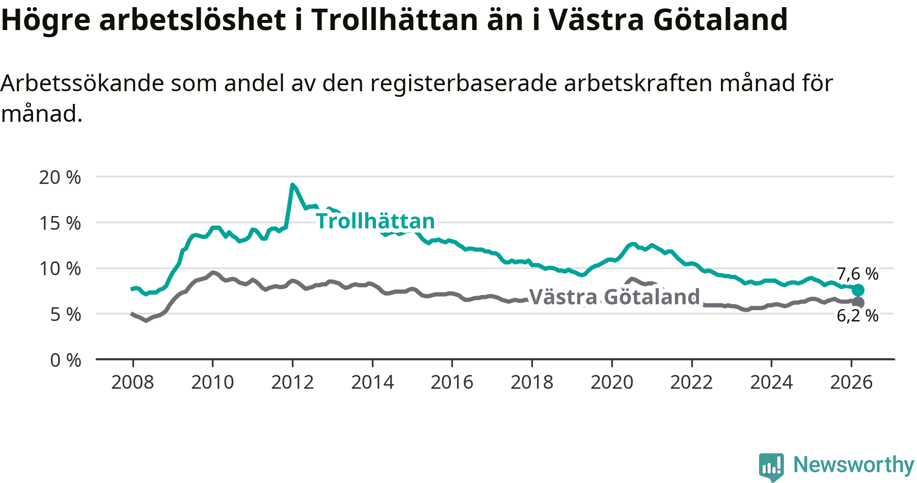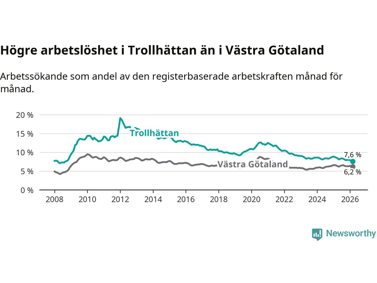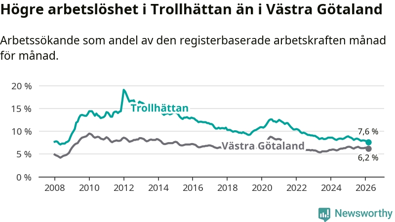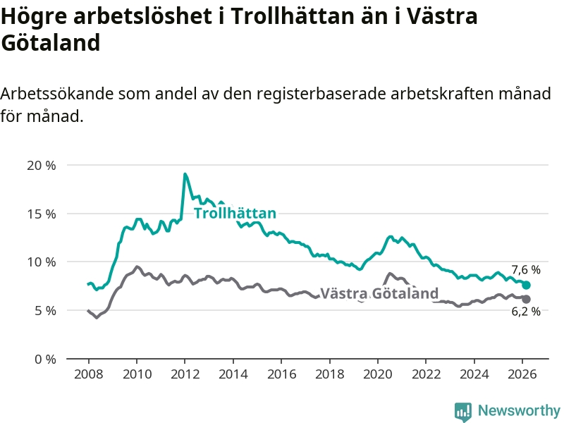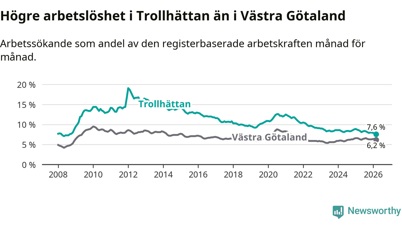 Under mars månad rapporterade Trollhättans kommun en total arbetslöshet på 7,6 procent. Det är en minskning jämfört med samma tidpunkt i fjol (−1,0 procentenheter). Även i Västra Götalands län sjunker arbetslösheten .