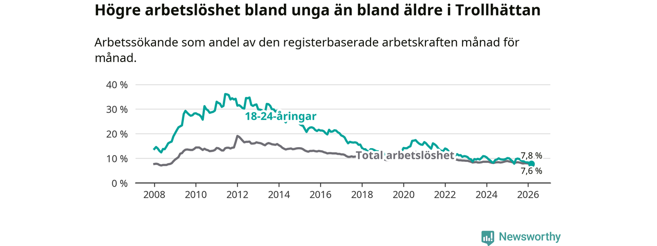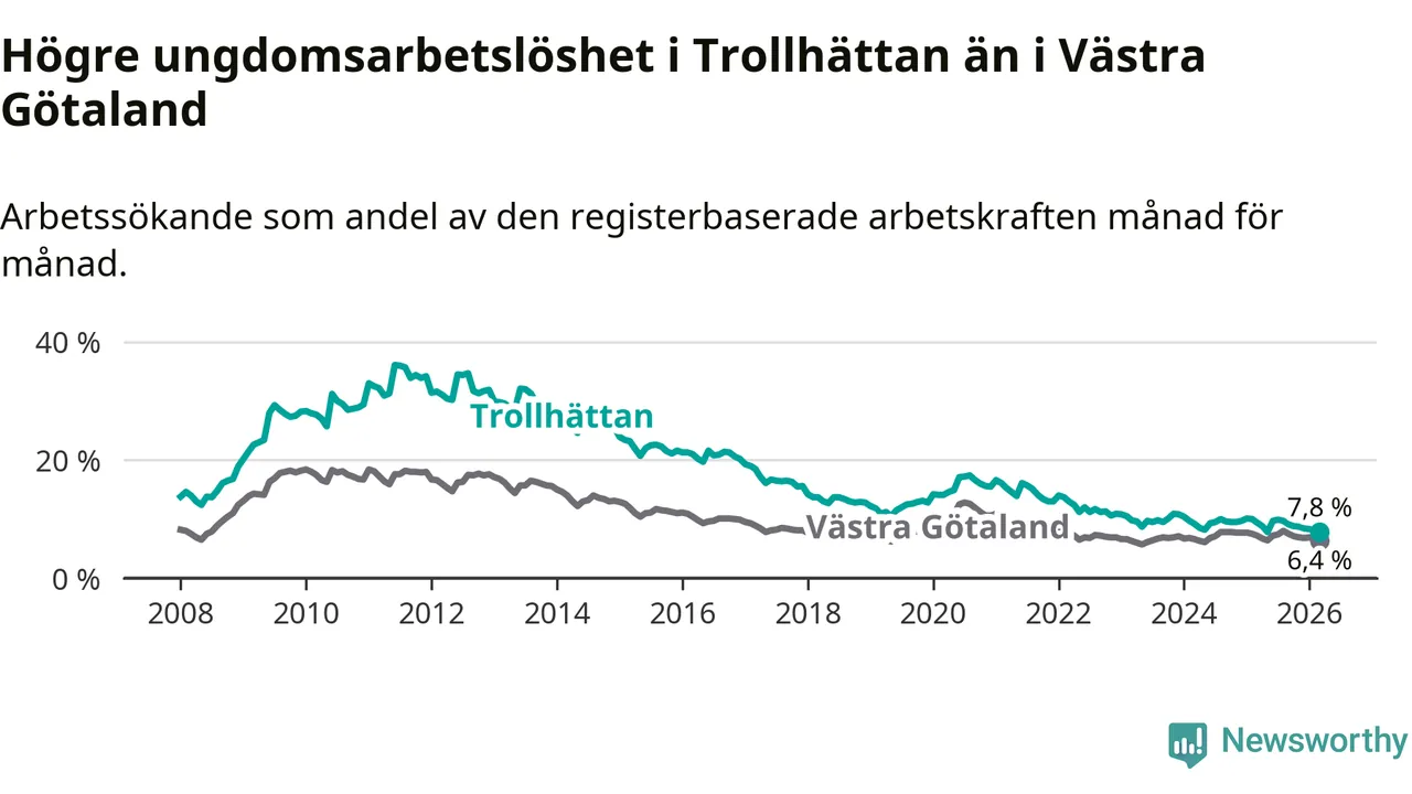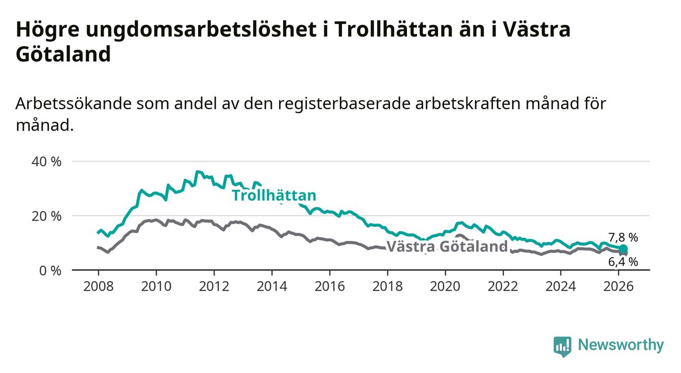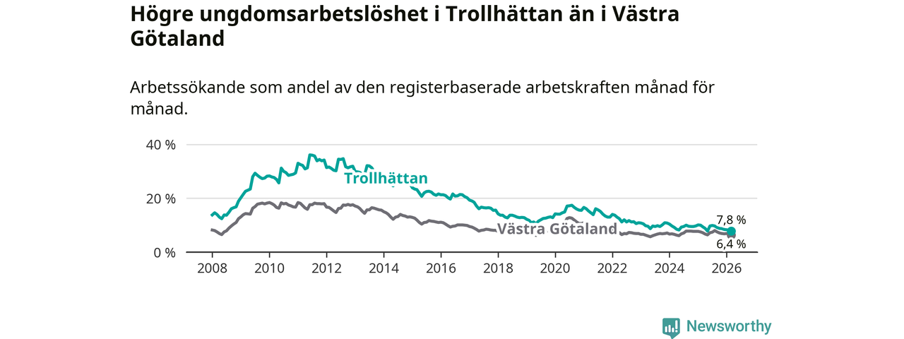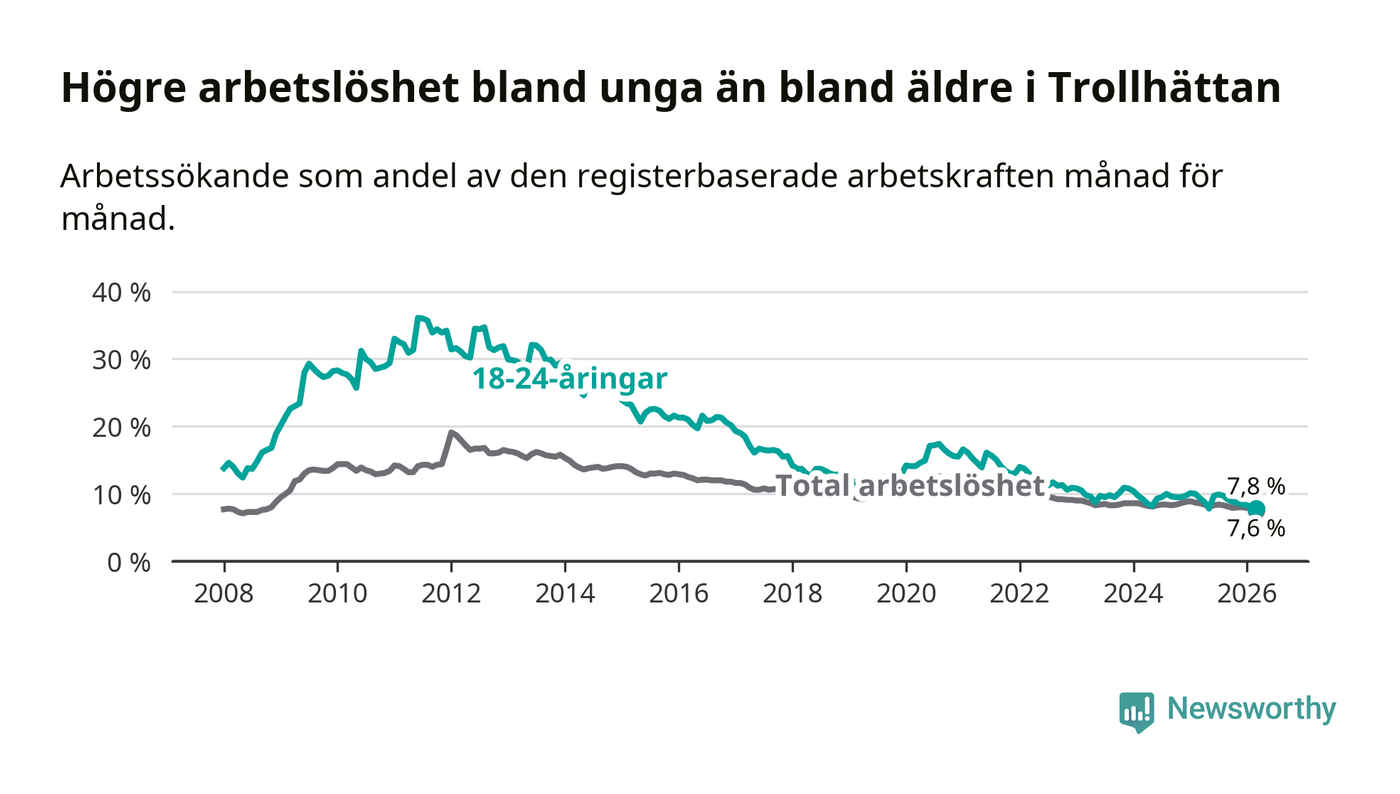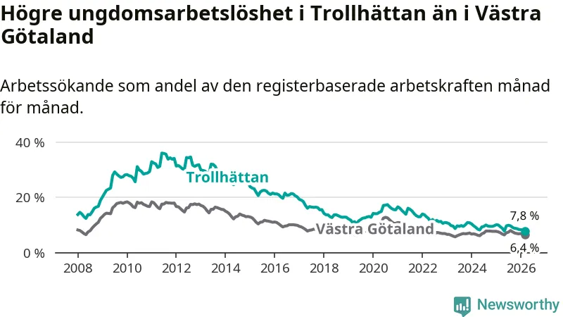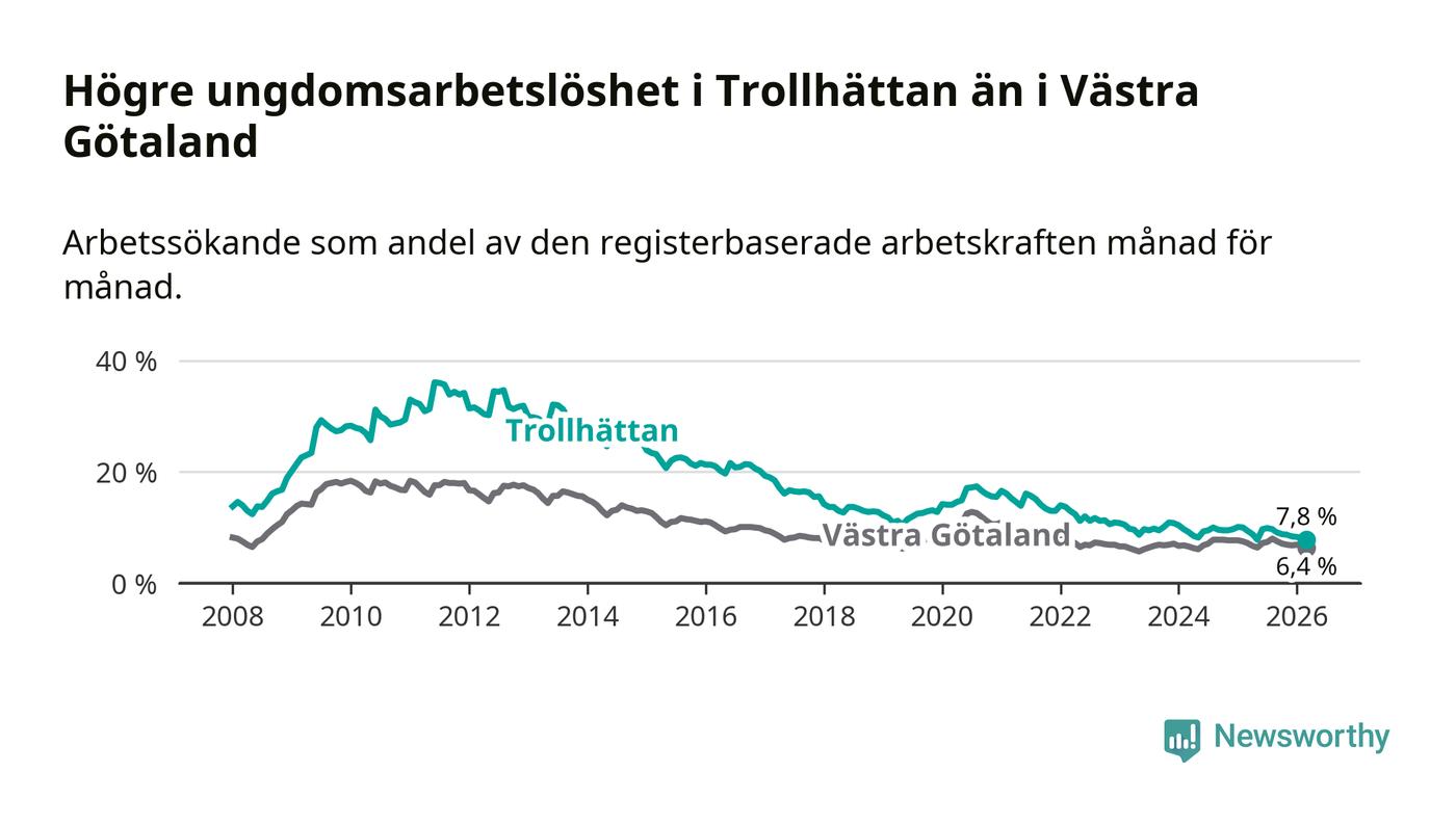 I och med den senaste månadens nedgång har de ungas arbetslöshet i Trollhättan sjunkit åtta månader i följd (ner från 9,9 procent i juli 2025 till 7,8 procent nu).