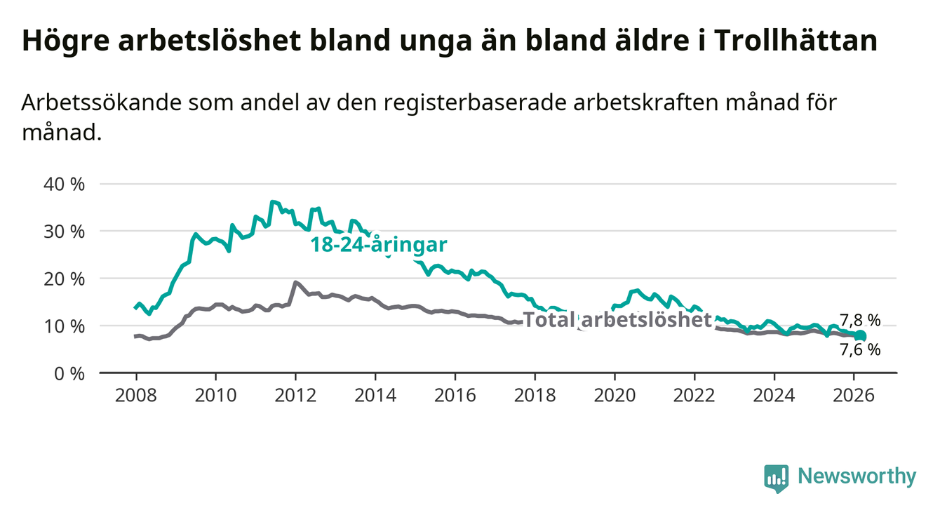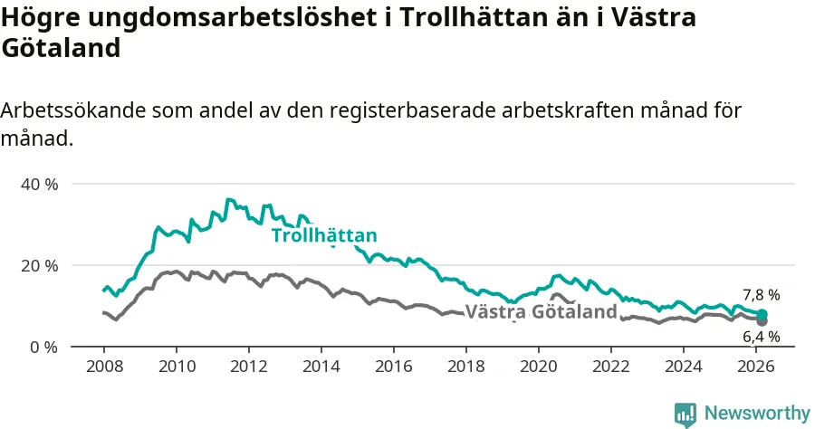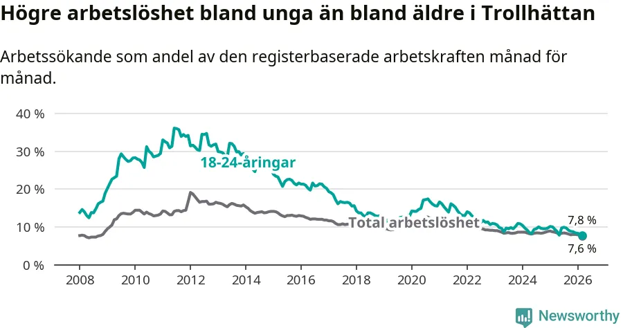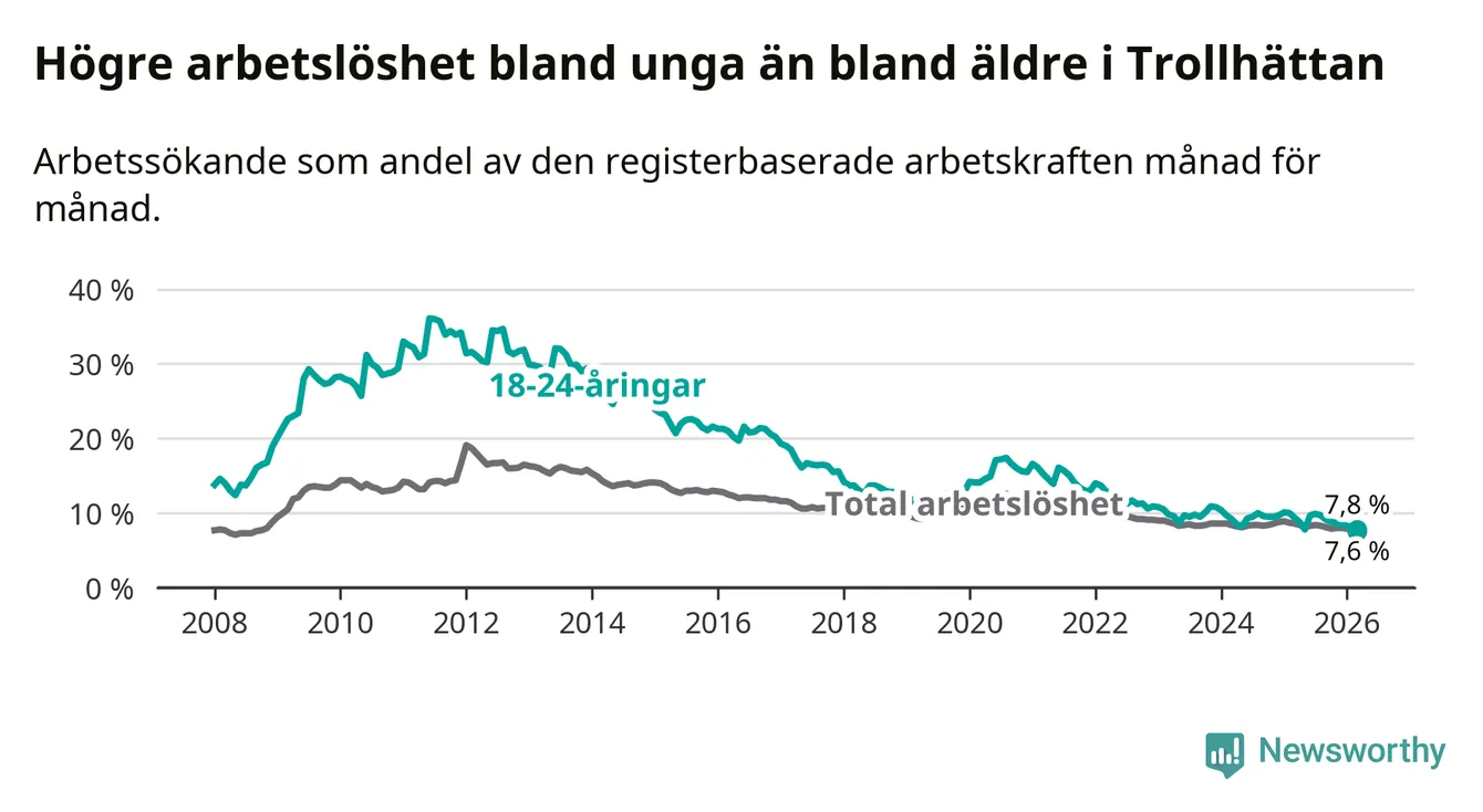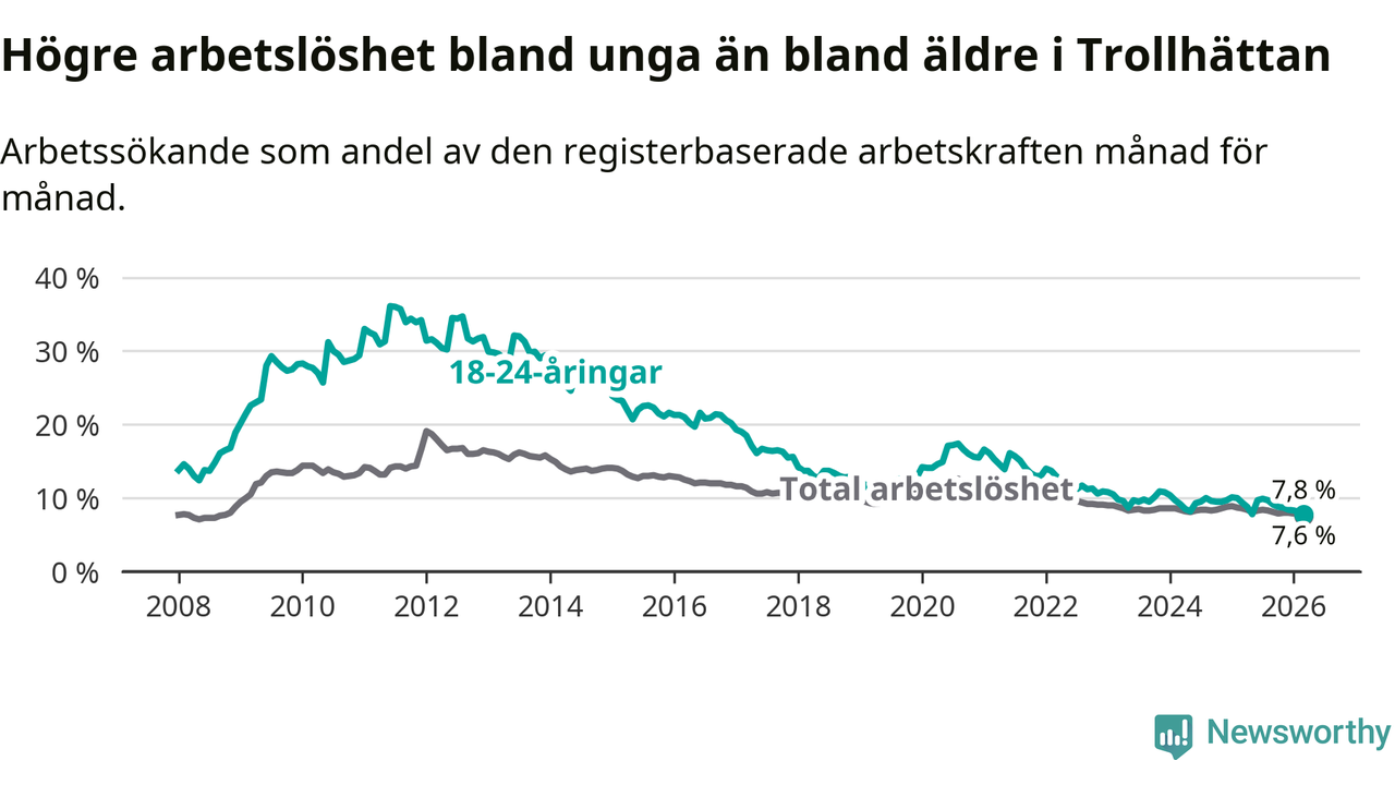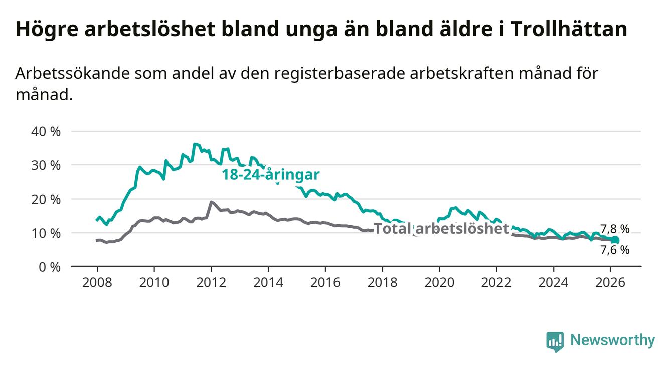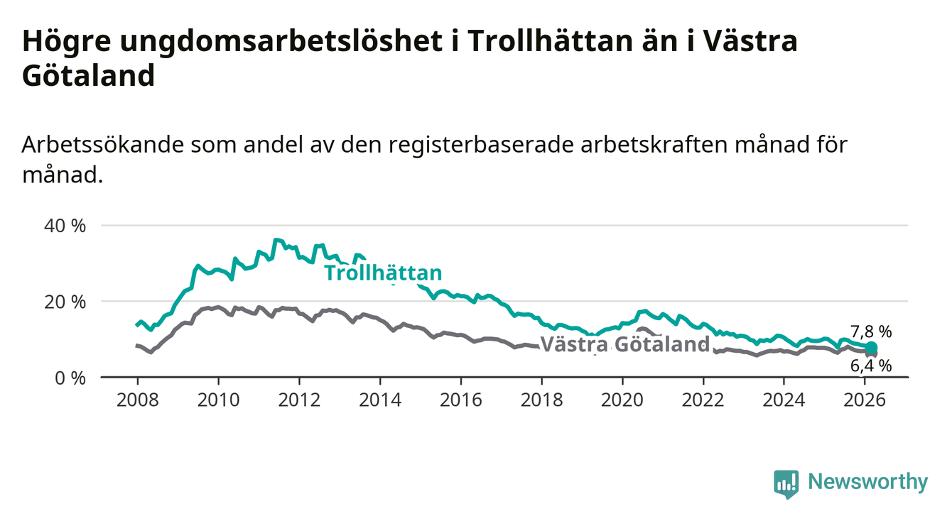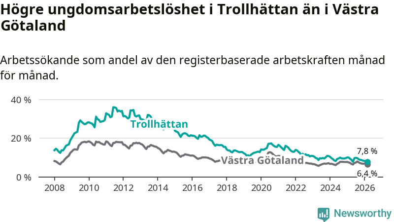 I och med den senaste månadens nedgång har de ungas arbetslöshet i Trollhättan sjunkit åtta månader i följd (ner från 9,9 procent i juli 2025 till 7,8 procent nu).
