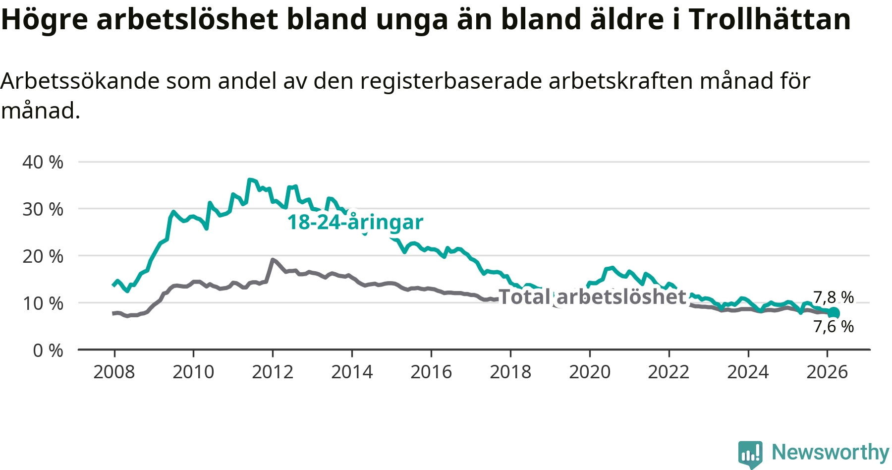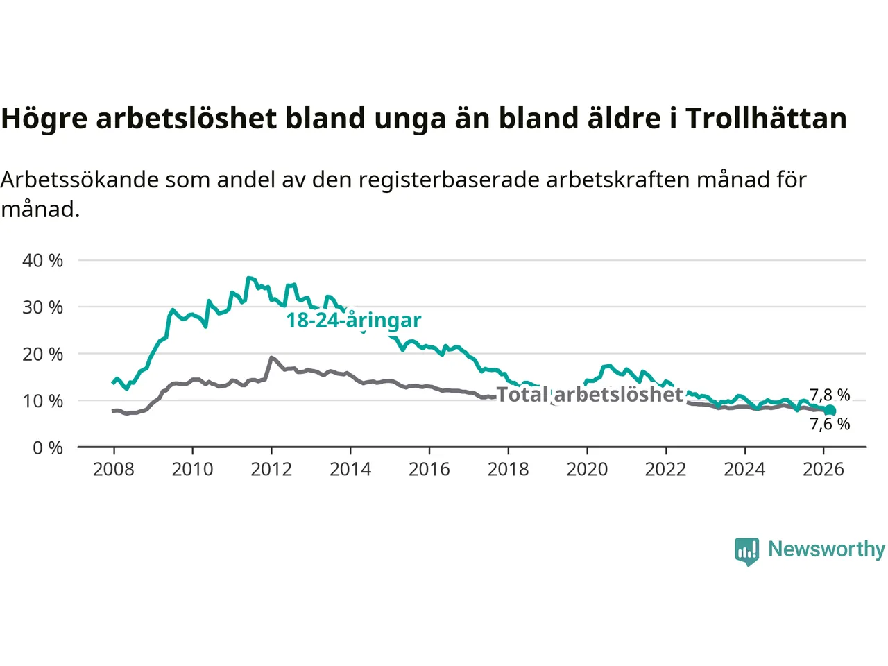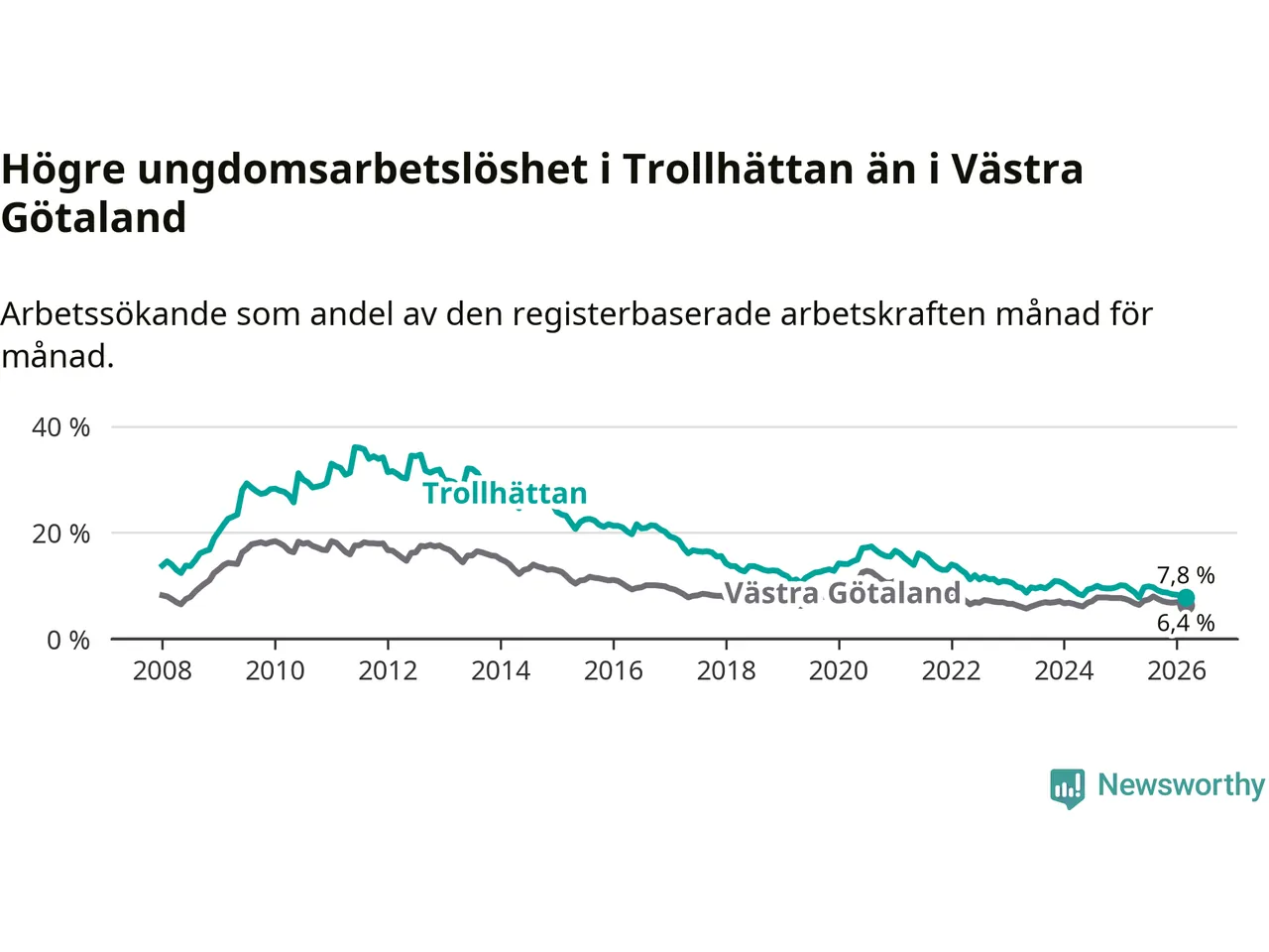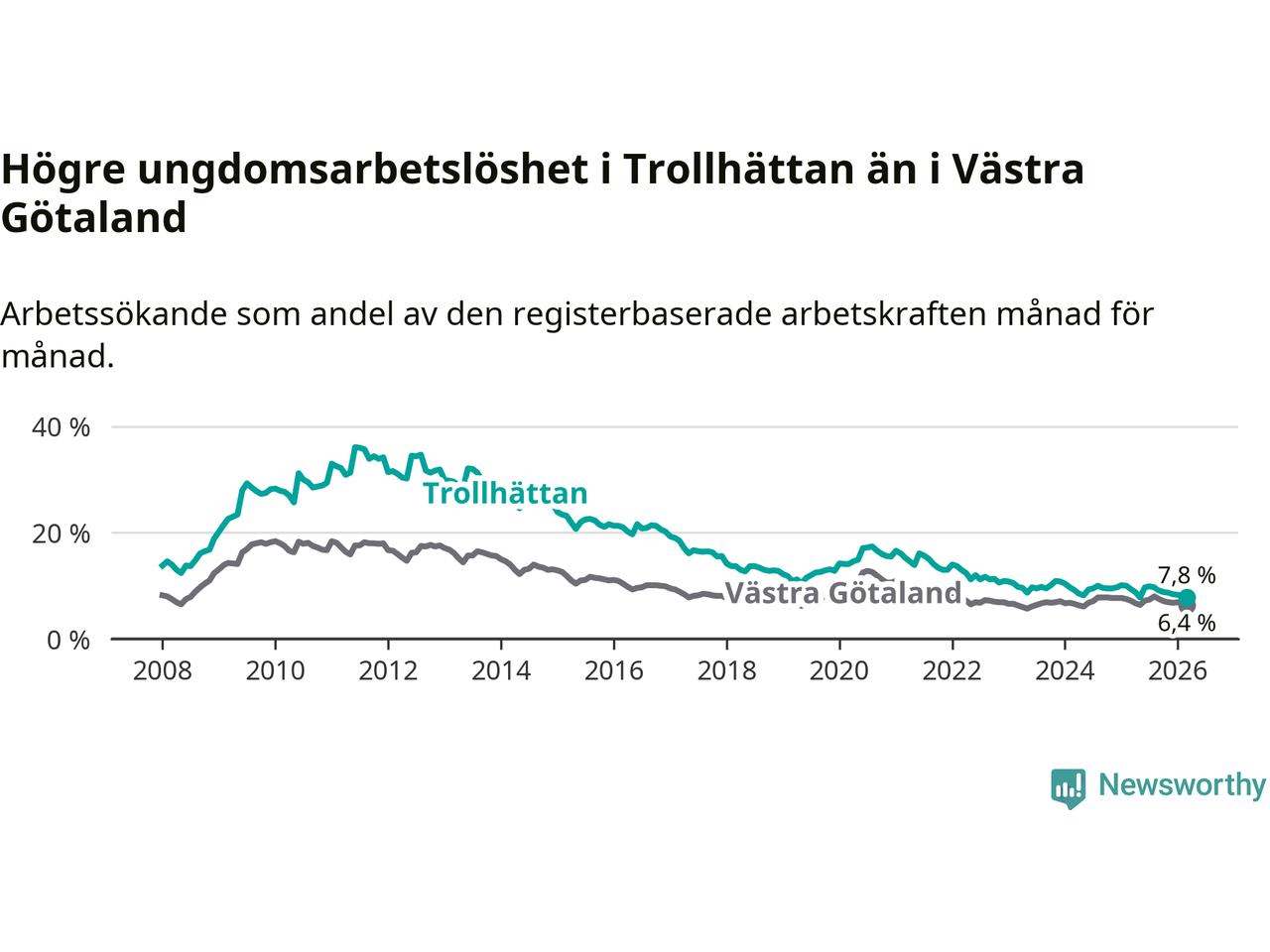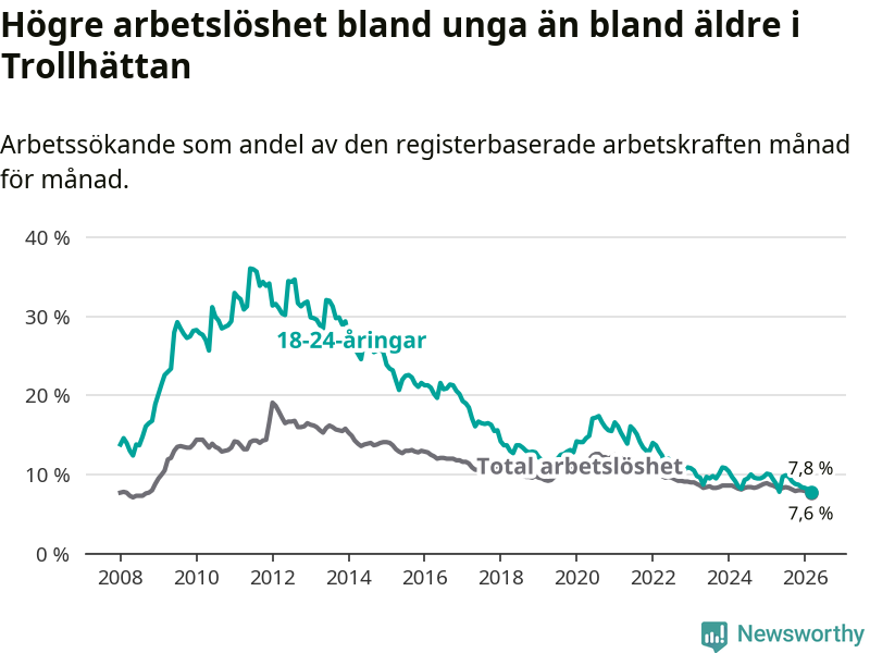 I och med den senaste månadens nedgång har de ungas arbetslöshet i Trollhättan sjunkit åtta månader i följd (ner från 9,9 procent i juli 2025 till 7,8 procent nu).