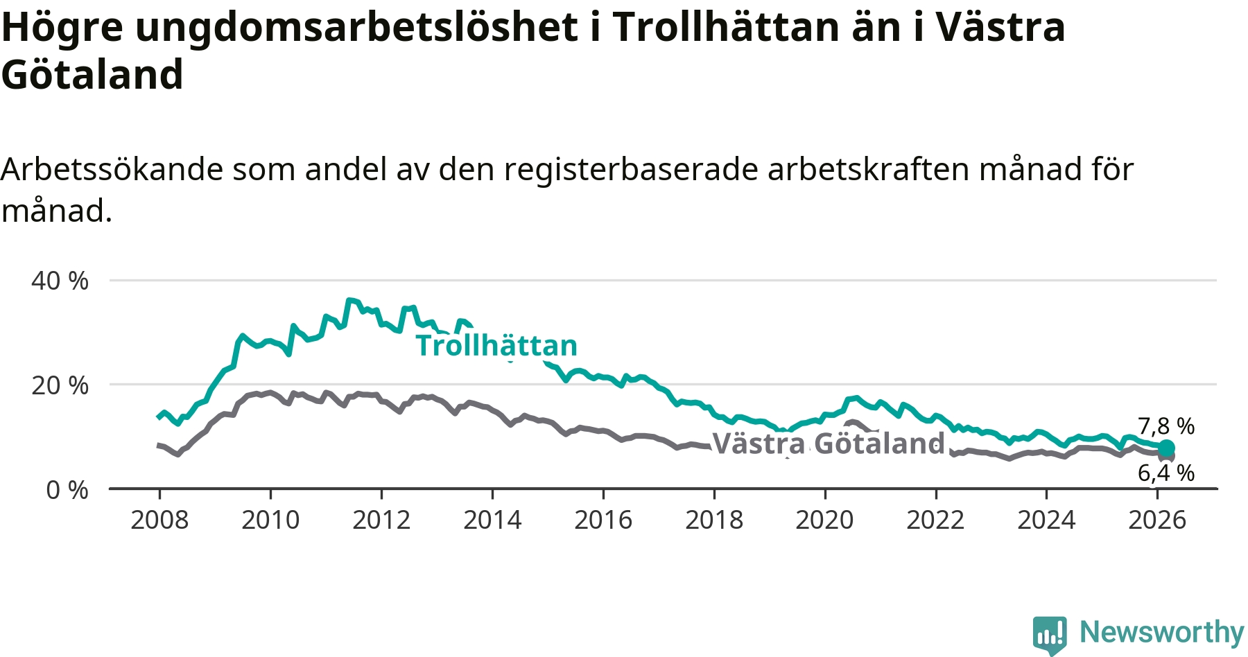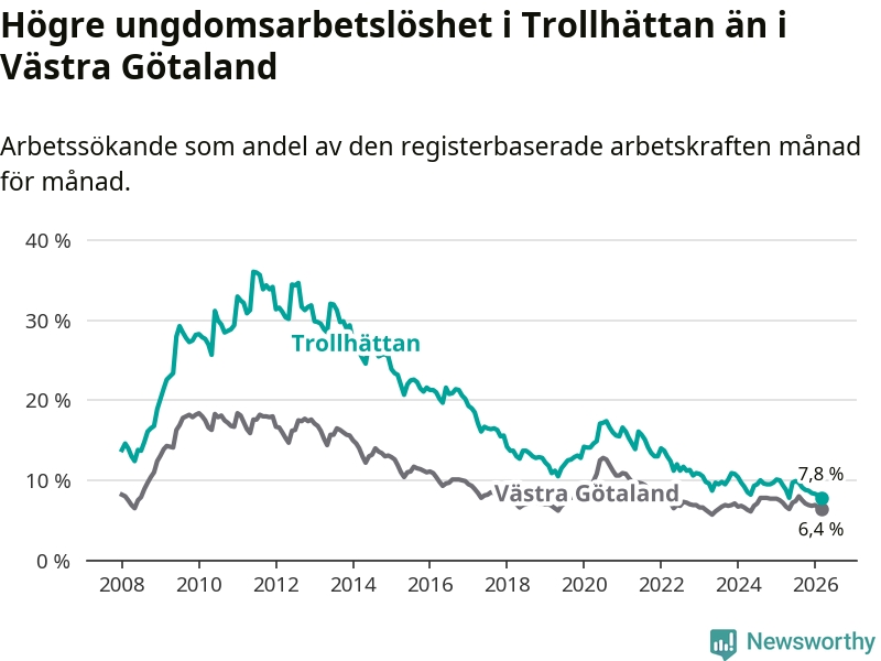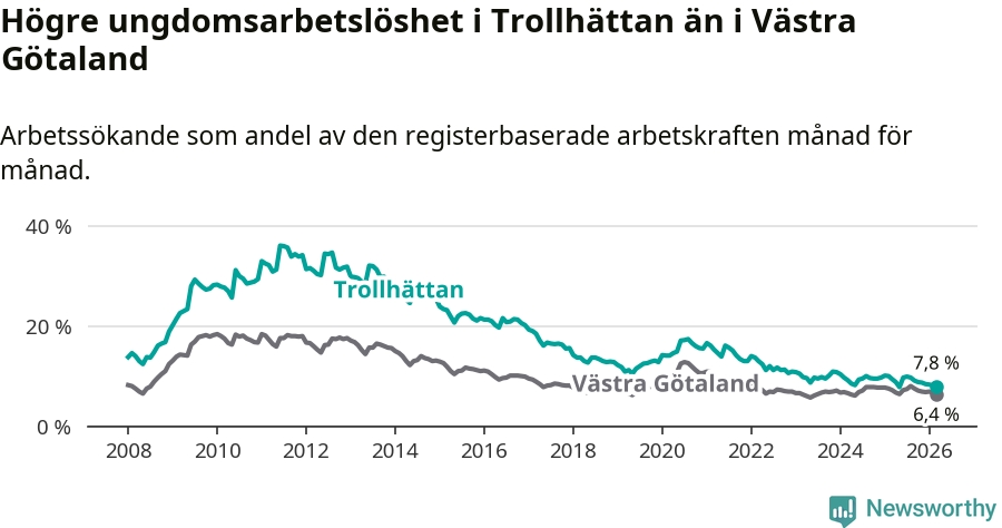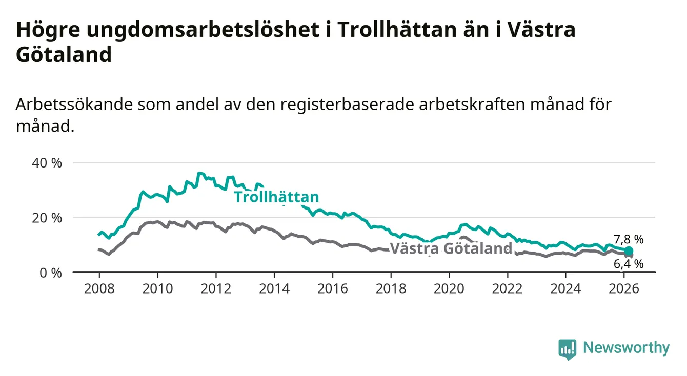 Precis som den totala arbetslösheten ligger ungdomsarbetslösheten i Trollhättan högre än i Västra Götaland som helhet. Skillnaden mellan kommunen och länet är 1,4 procentenheter.