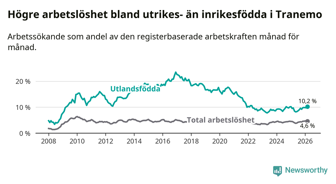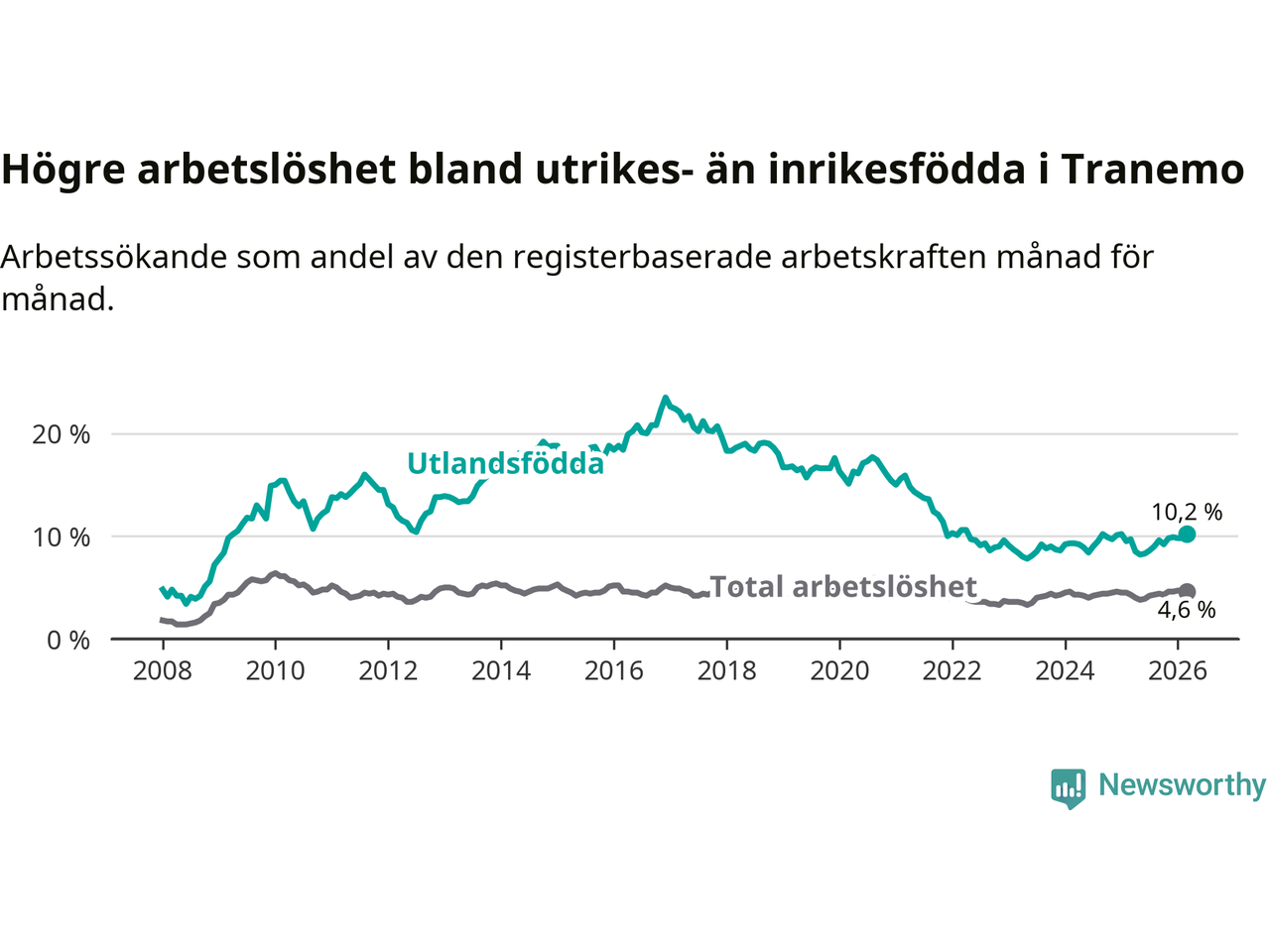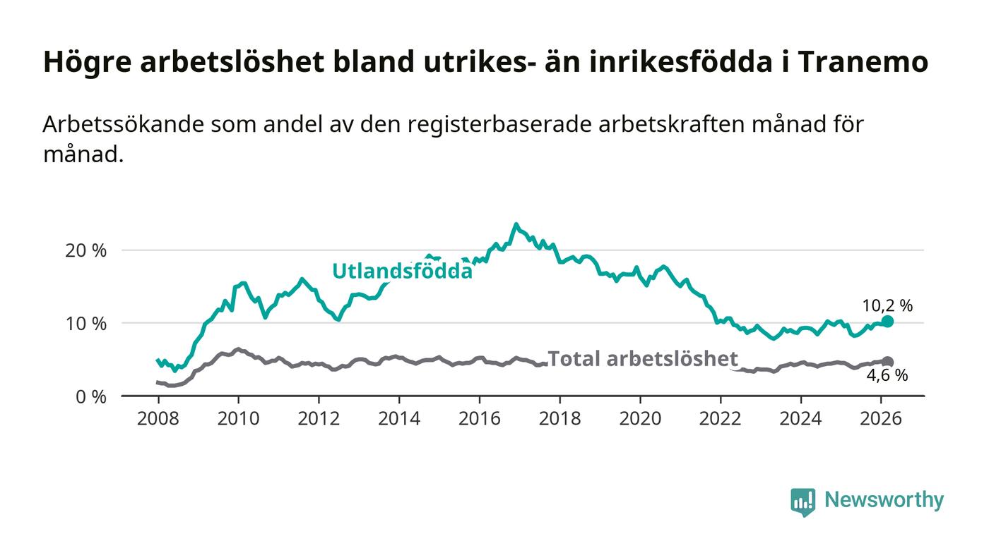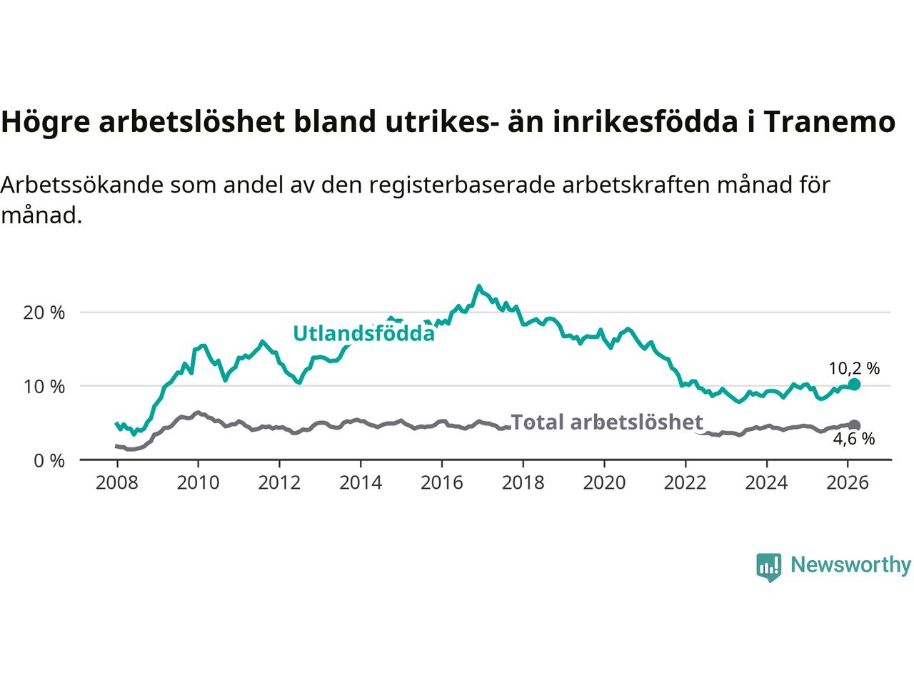 Arbetslösheten bland utlandsfödda var 10,2 procent i Tranemo under mars månad, motsvarande 125 av 1 225 personer. Det är 0,5 procentenheter fler än vid samma tidpunkt i fjol (+11 om man räknar personer).