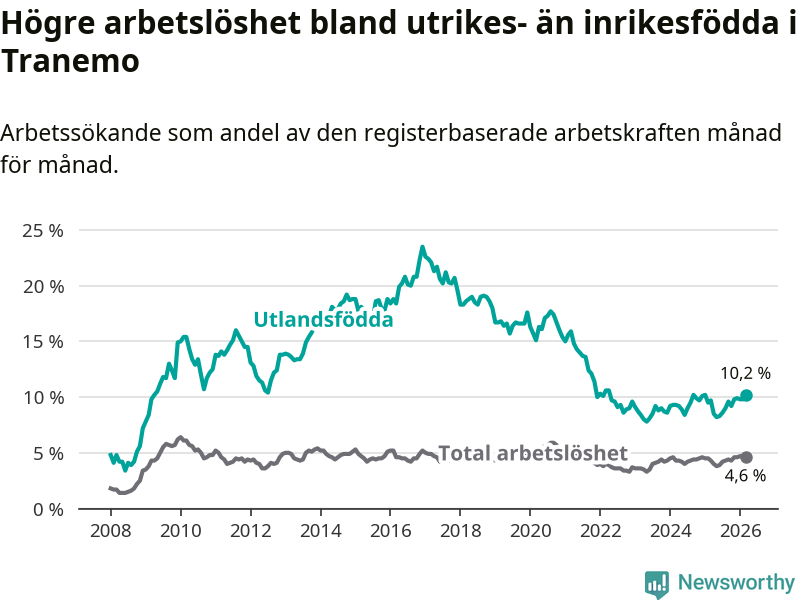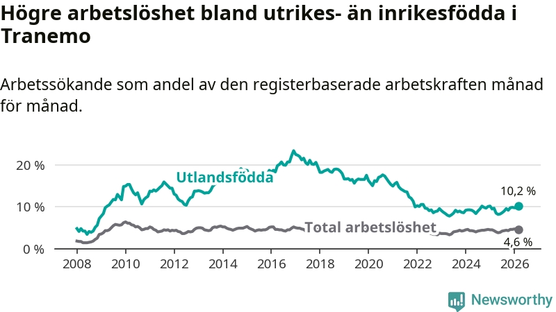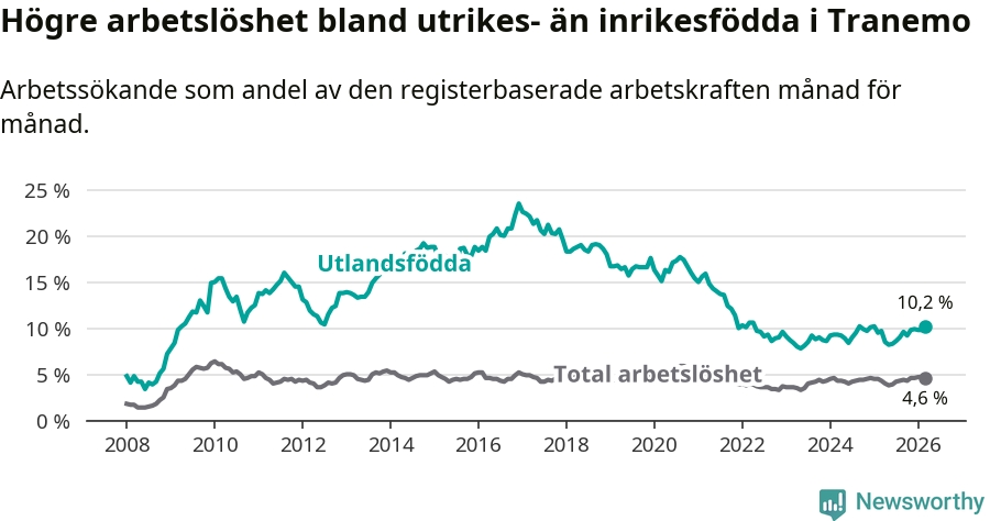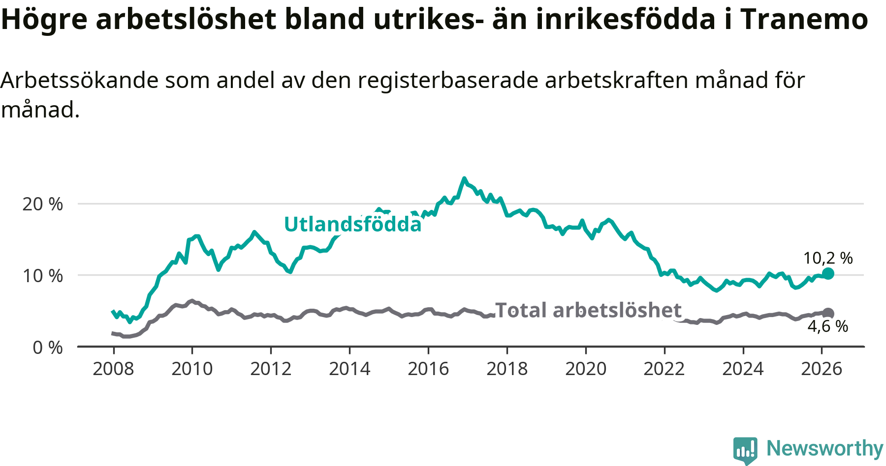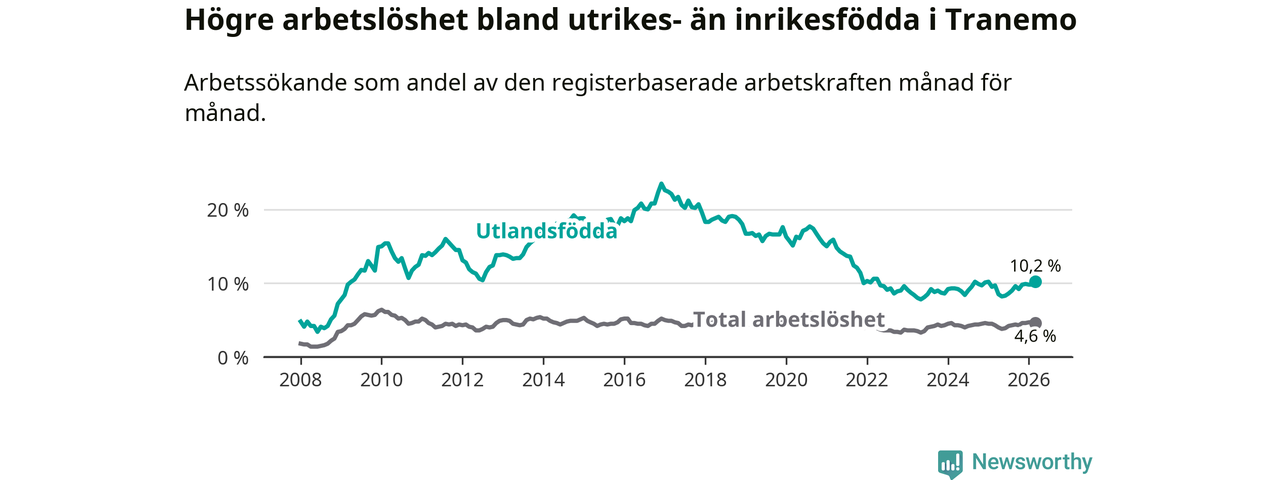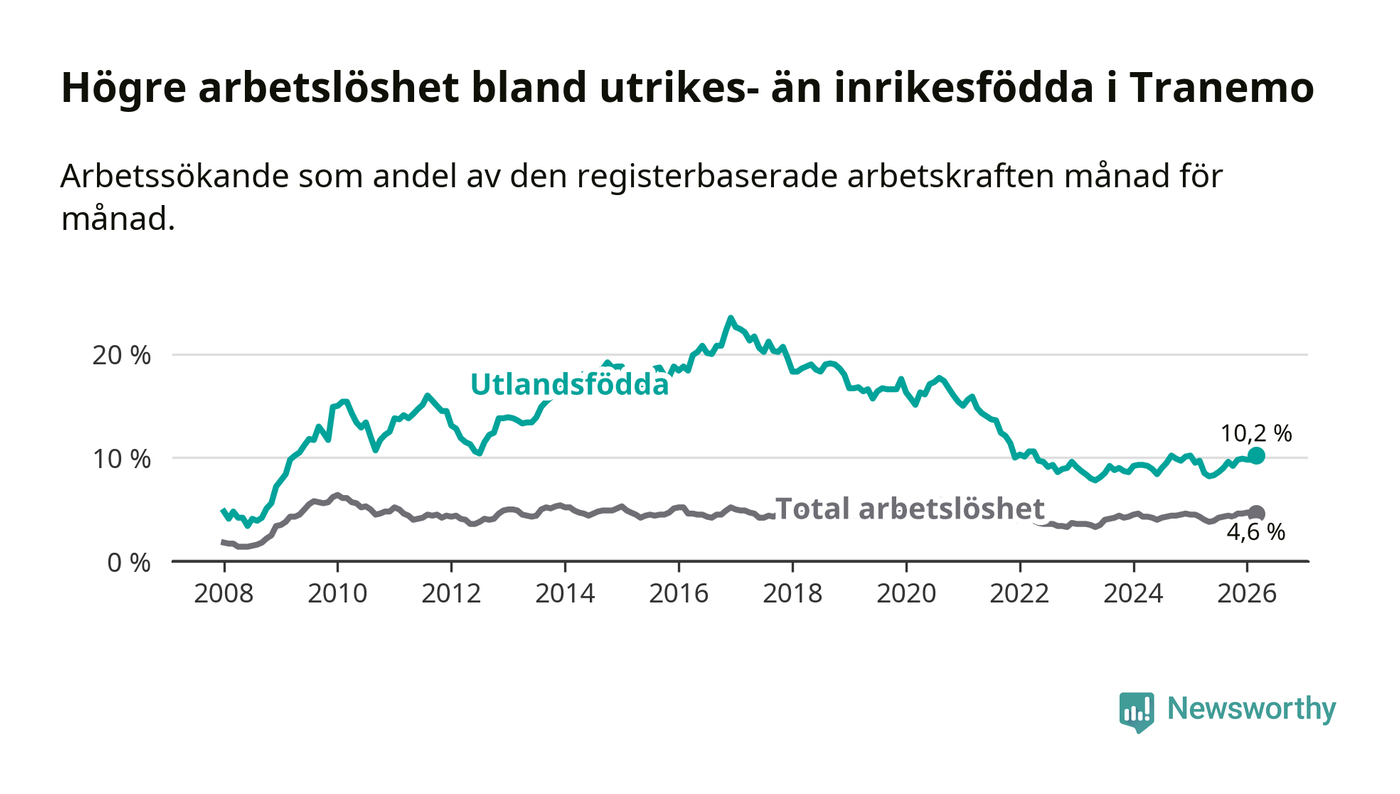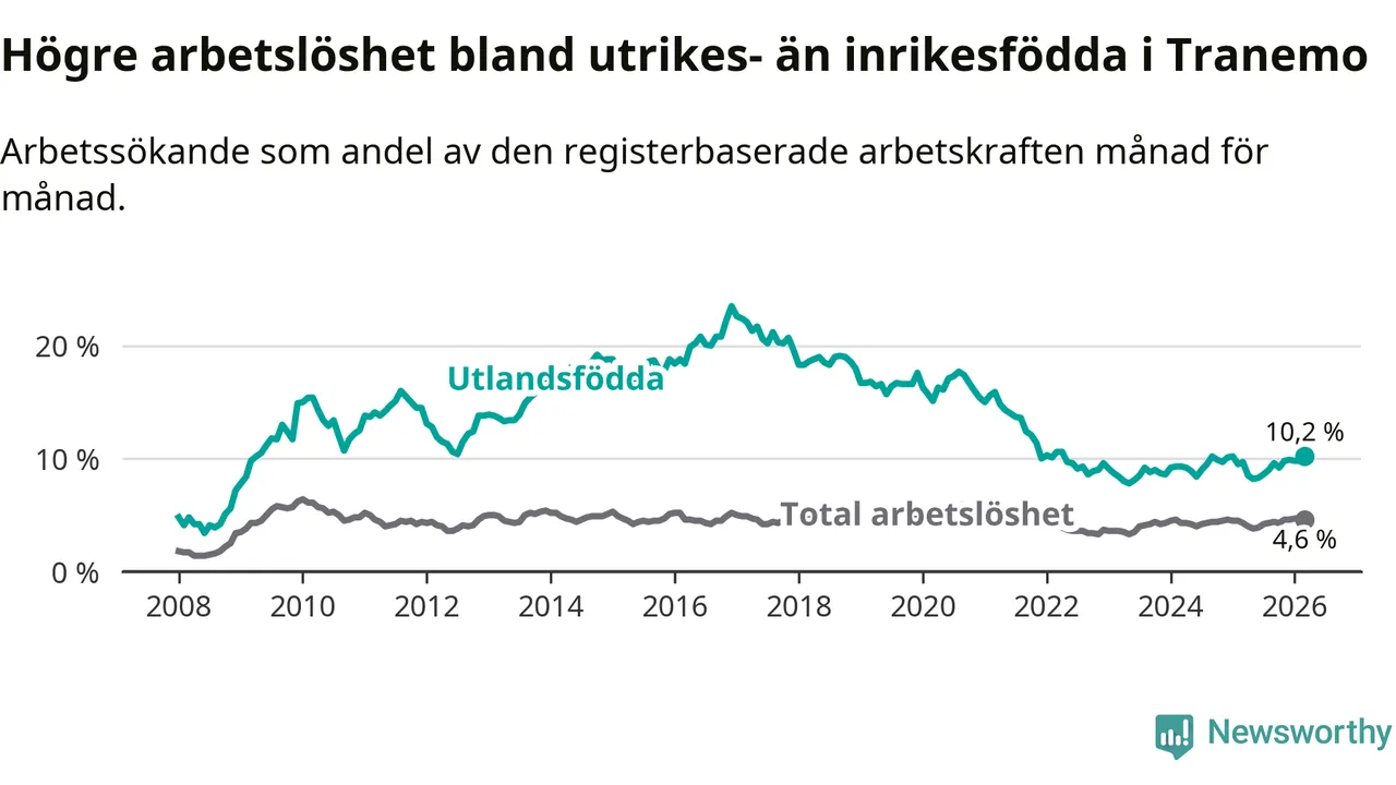 Arbetslösheten bland utlandsfödda var 10,2 procent i Tranemo under mars månad, motsvarande 125 av 1 225 personer. Det är 0,5 procentenheter fler än vid samma tidpunkt i fjol (+11 om man räknar personer).