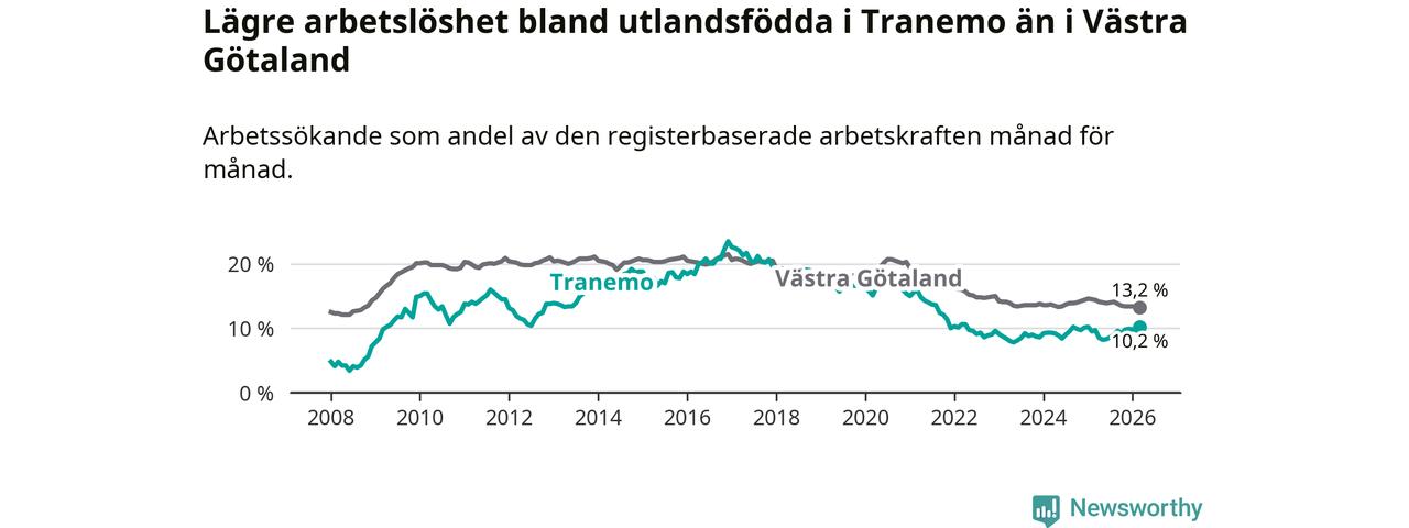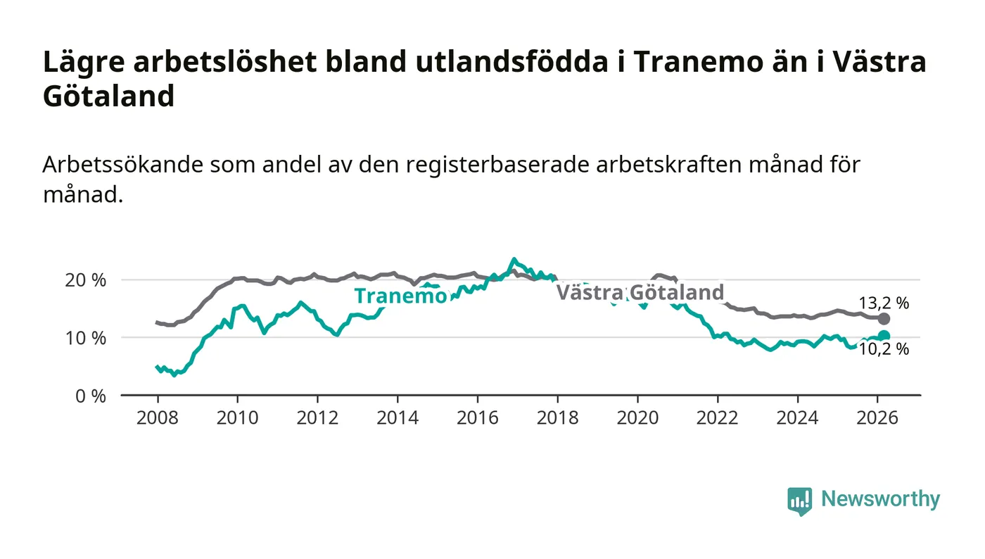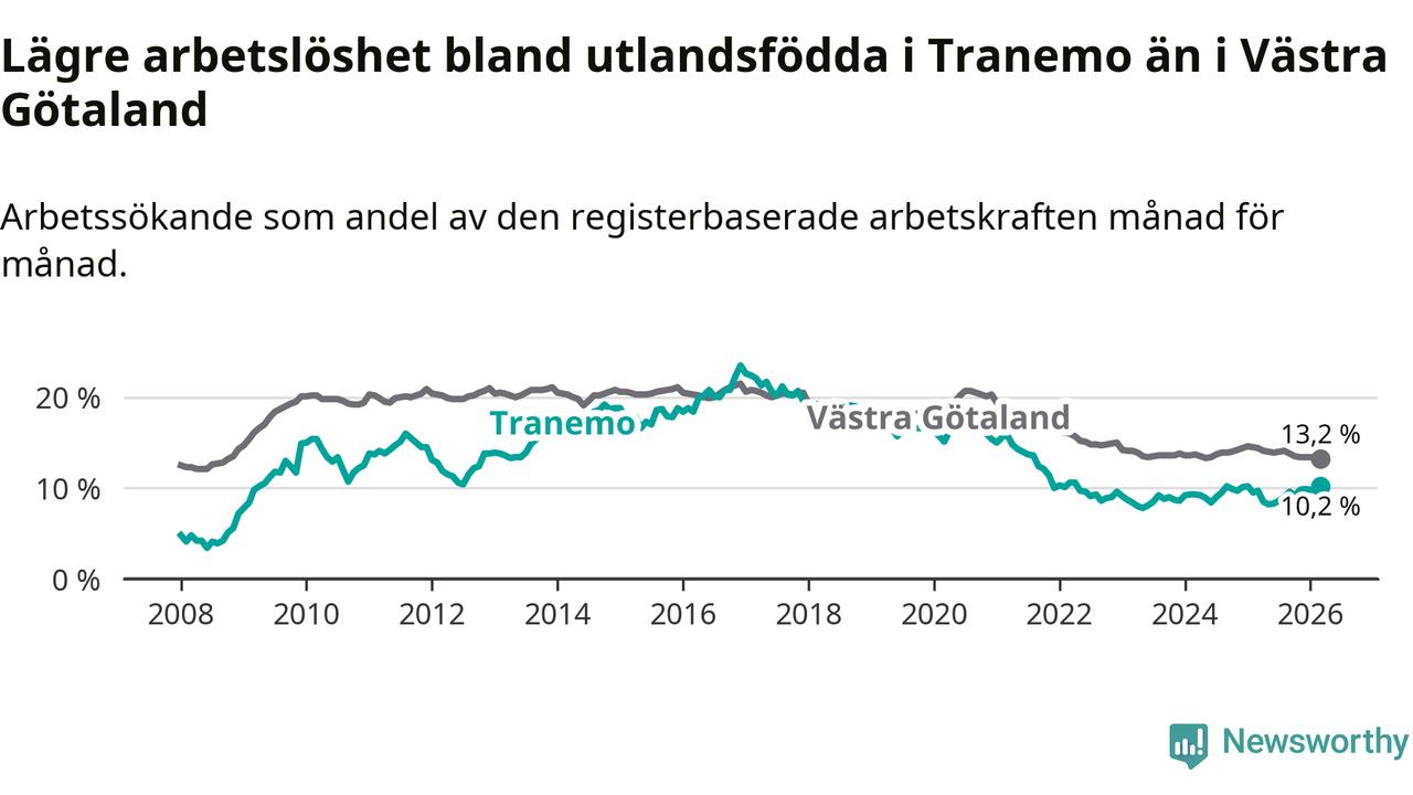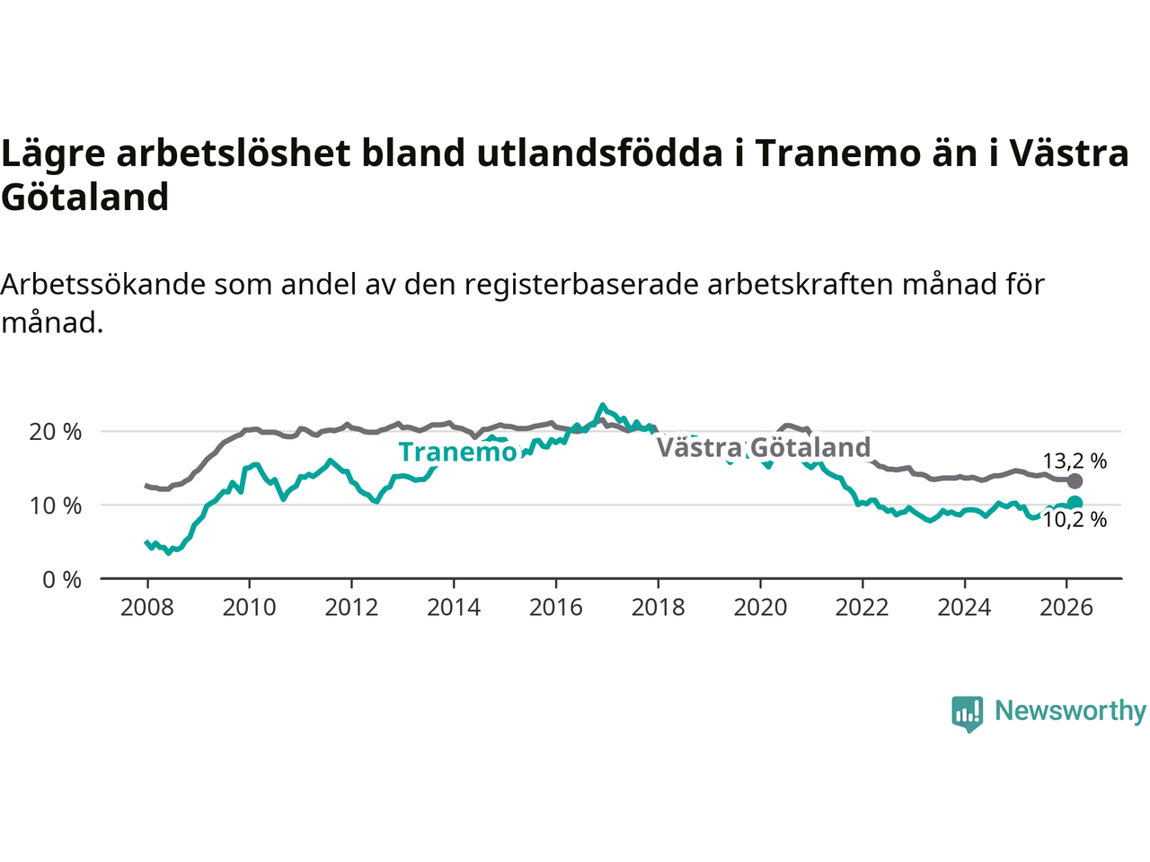 Medan arbetslösheten bland utlandsfödda alltså ökar i Tranemo så minskar den i Västra Götaland. Jämfört med mars förra året har andelen arbetslösa utlandsfödda i länet minskat med 1,2 procentenheter (till 13,2 procent). Trots den senaste uppgången har Tranemo med andra ord fortfarande lägre arbetslöshet bland utlandsfödda än Västra Götaland.