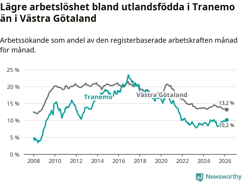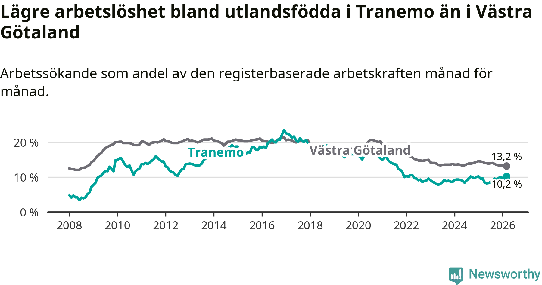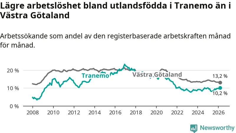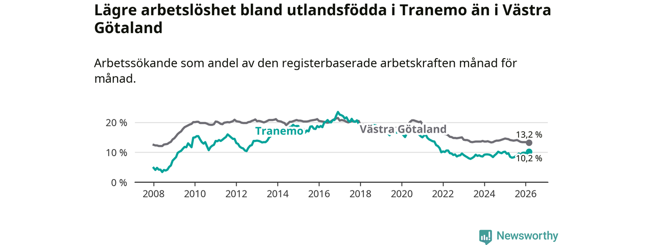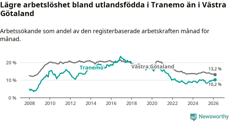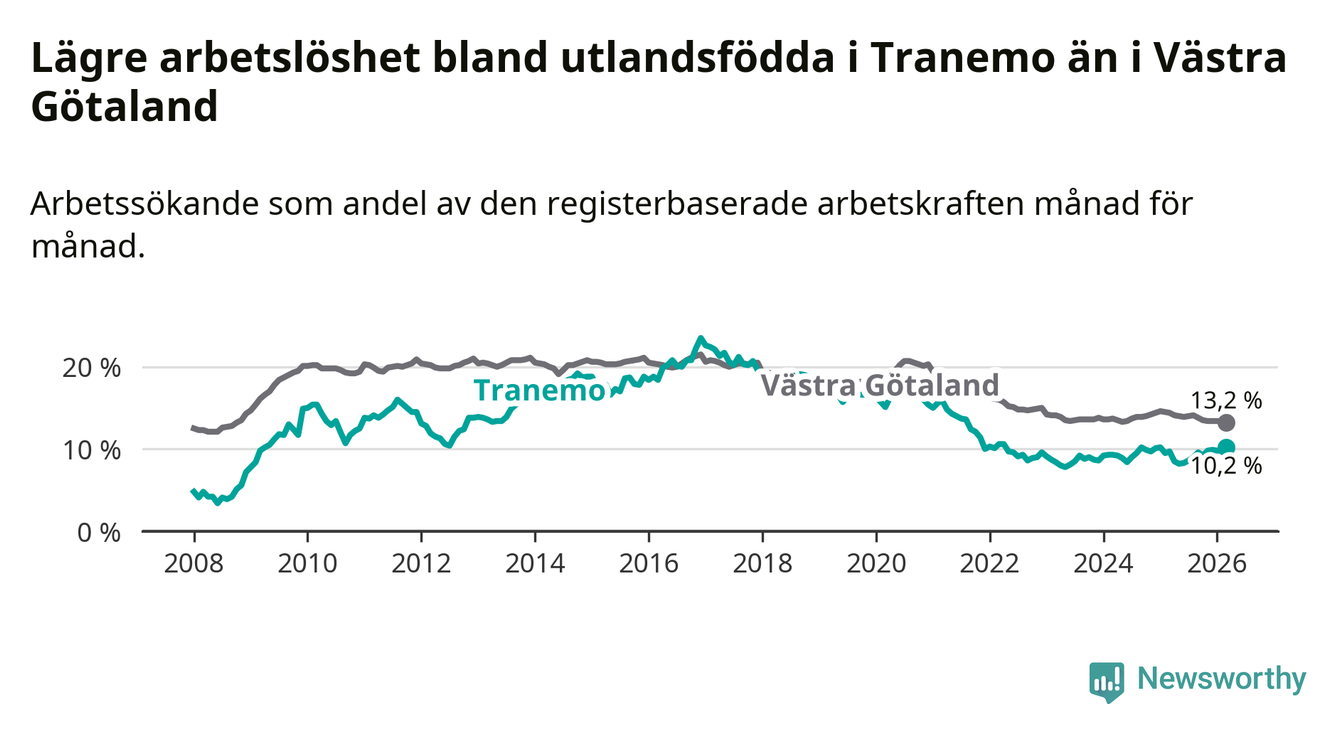 Medan arbetslösheten bland utlandsfödda alltså ökar i Tranemo så minskar den i Västra Götaland. Jämfört med mars förra året har andelen arbetslösa utlandsfödda i länet minskat med 1,2 procentenheter (till 13,2 procent). Trots den senaste uppgången har Tranemo med andra ord fortfarande lägre arbetslöshet bland utlandsfödda än Västra Götaland.