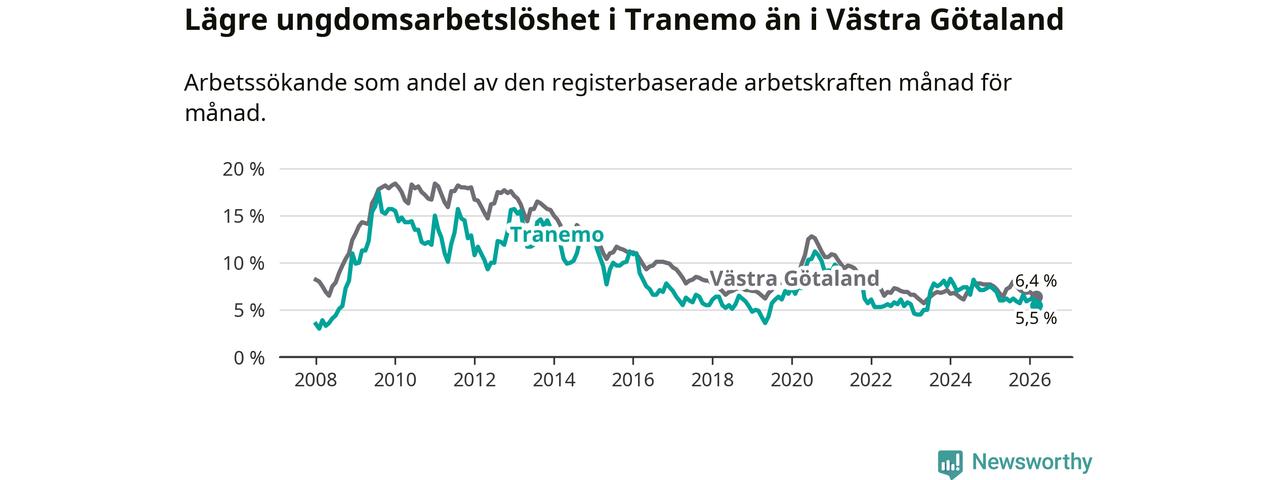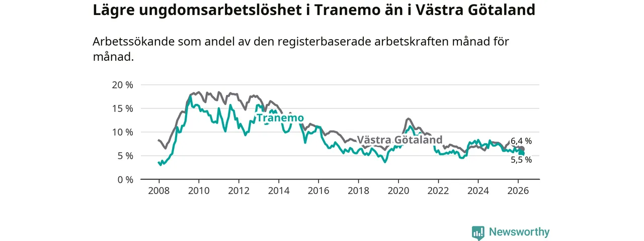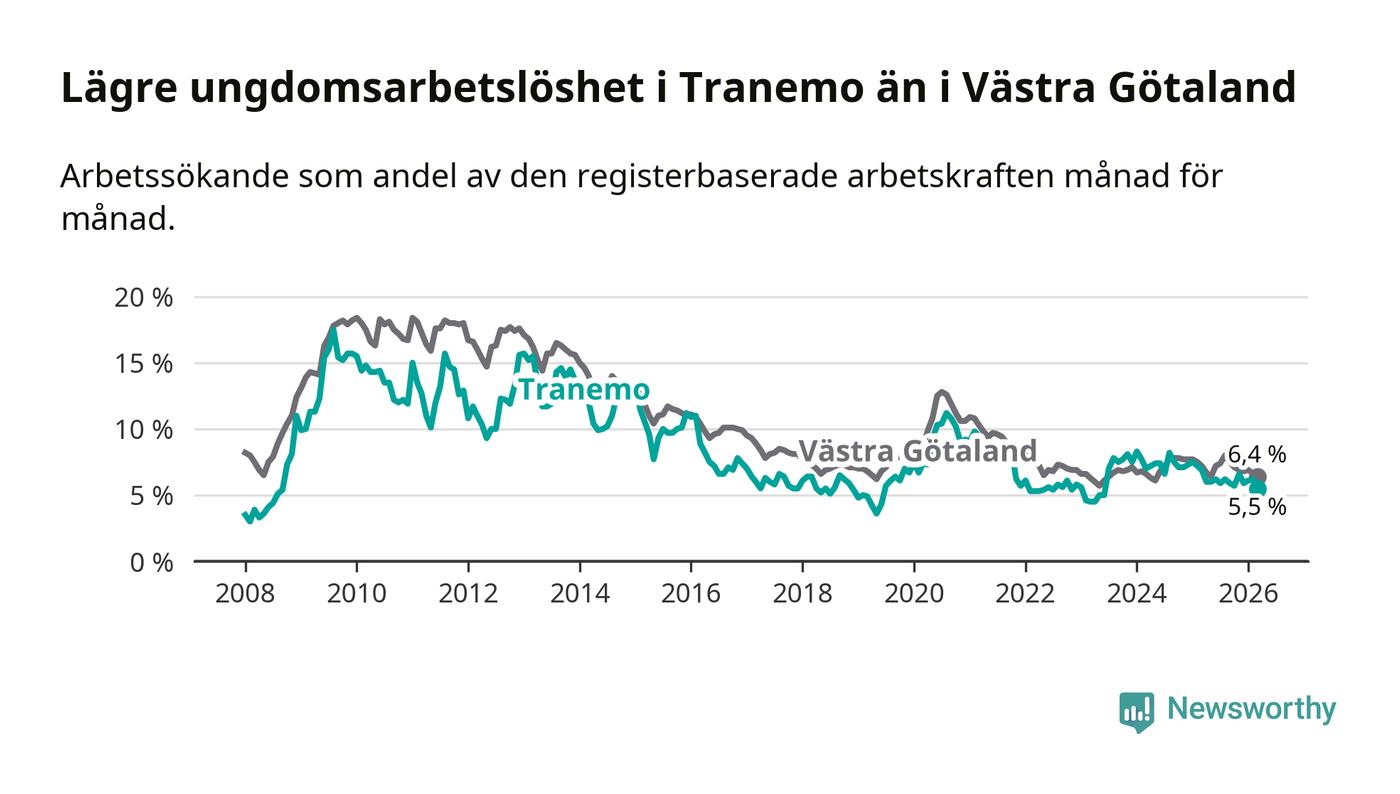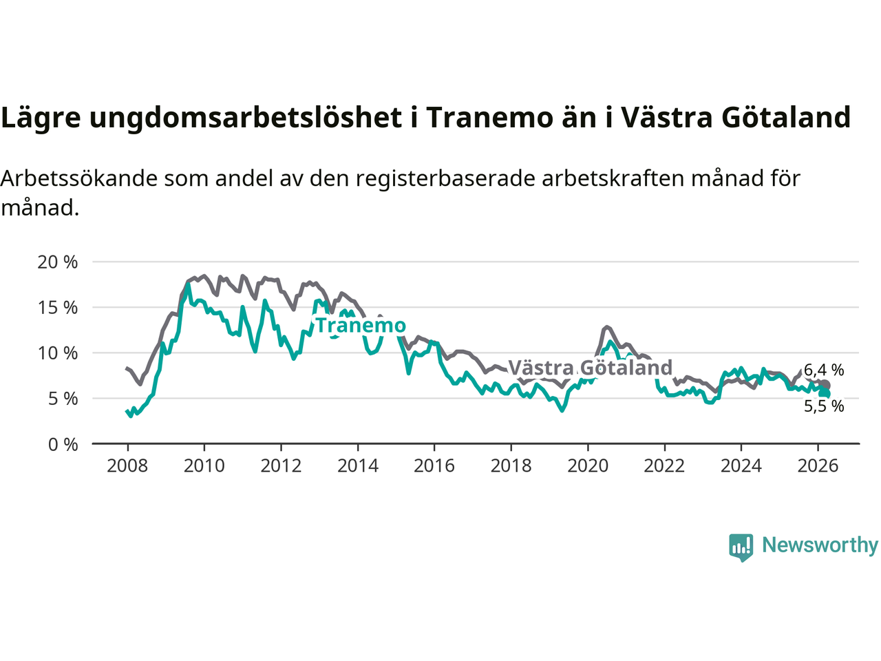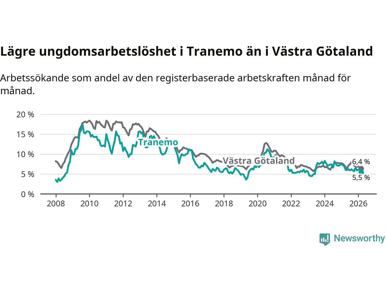 Precis som den totala arbetslösheten ligger ungdomsarbetslösheten i Tranemo lägre än i Västra Götaland som helhet. Skillnaden mellan kommunen och länet är 0,9 procentenheter.