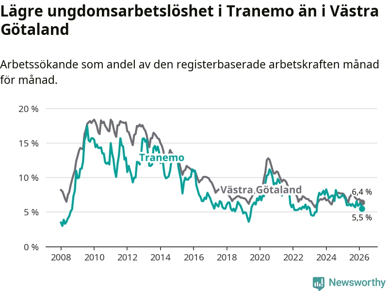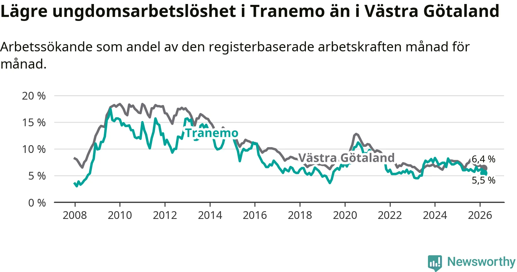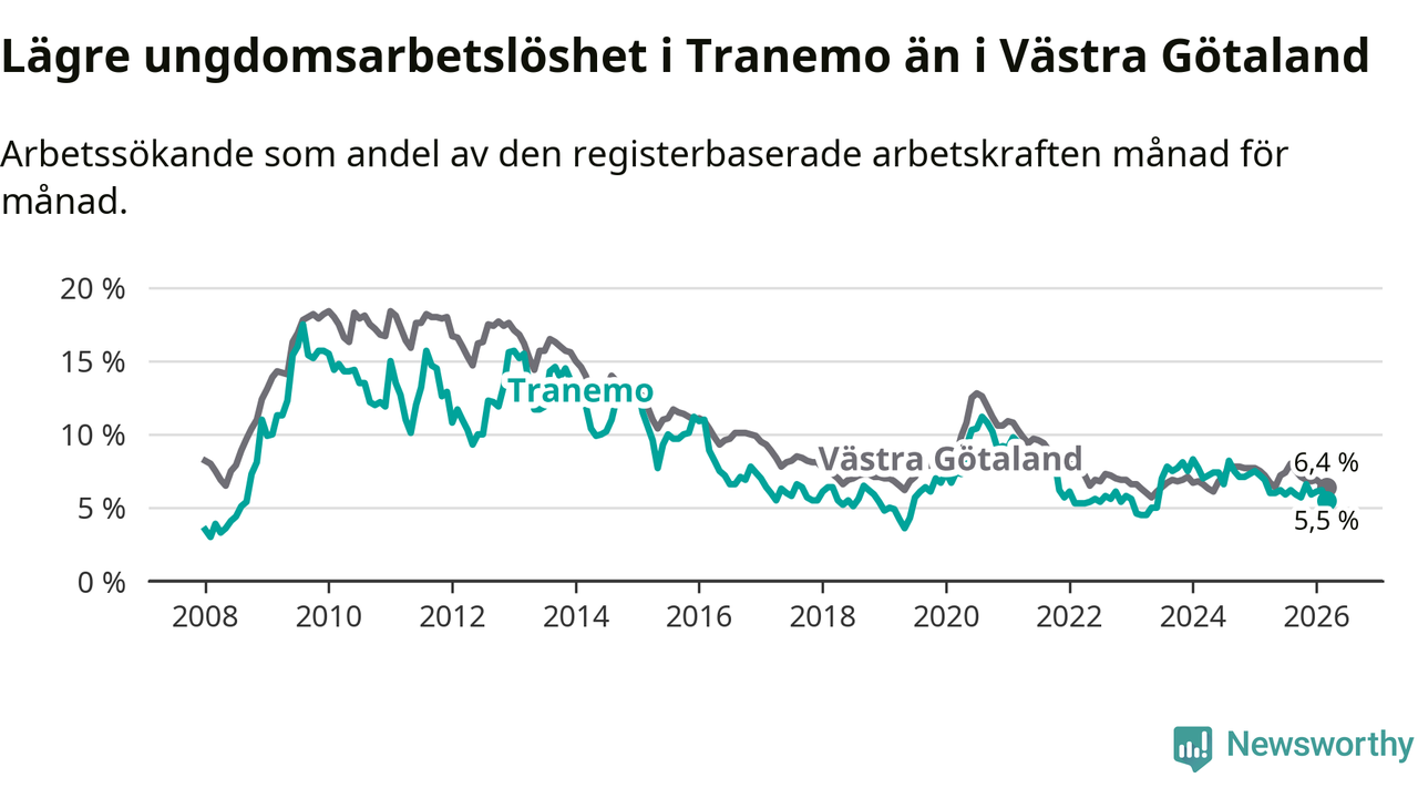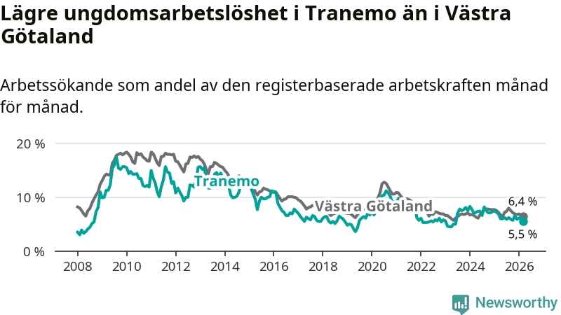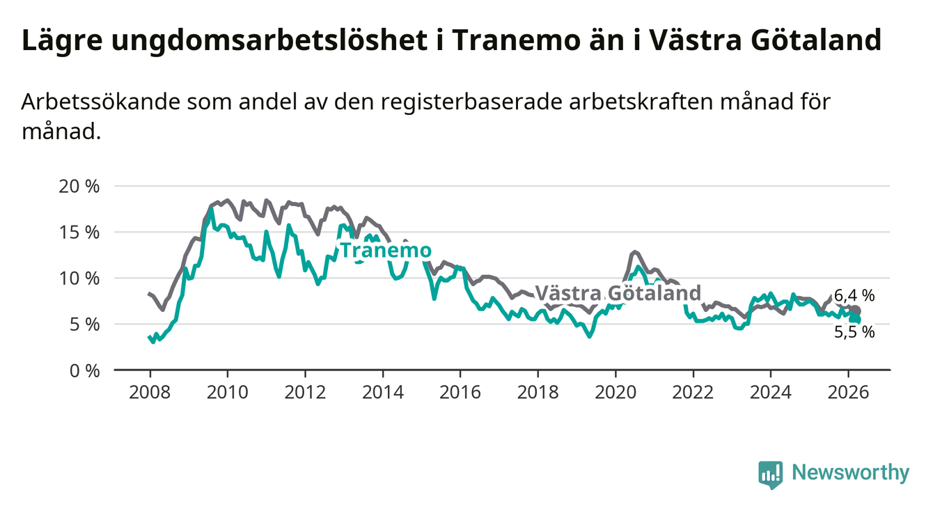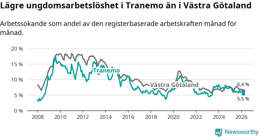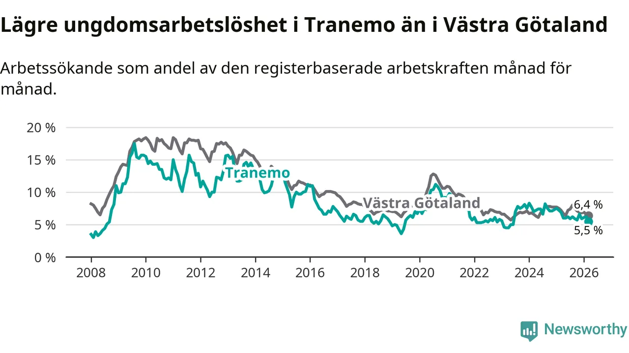 Precis som den totala arbetslösheten ligger ungdomsarbetslösheten i Tranemo lägre än i Västra Götaland som helhet. Skillnaden mellan kommunen och länet är 0,9 procentenheter.