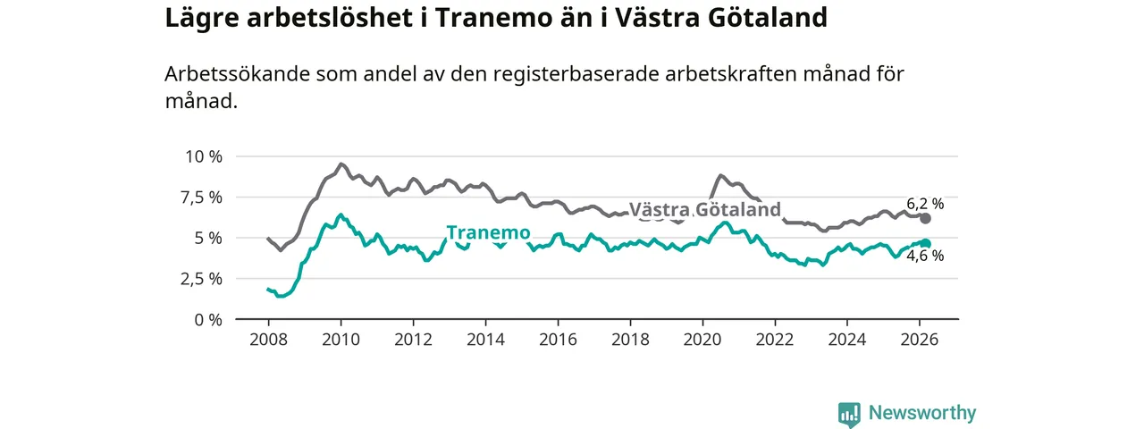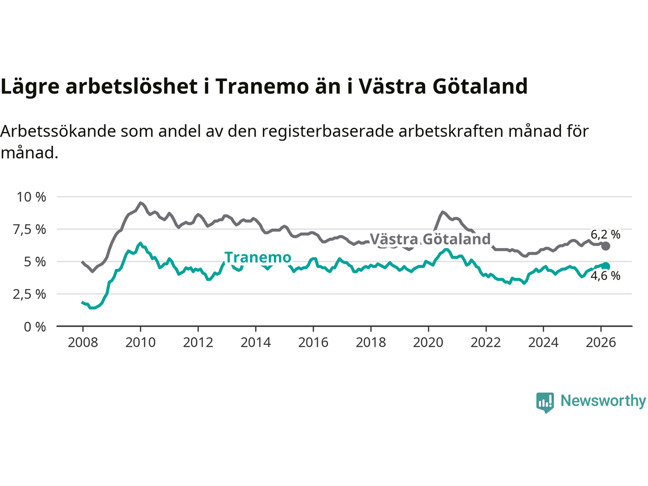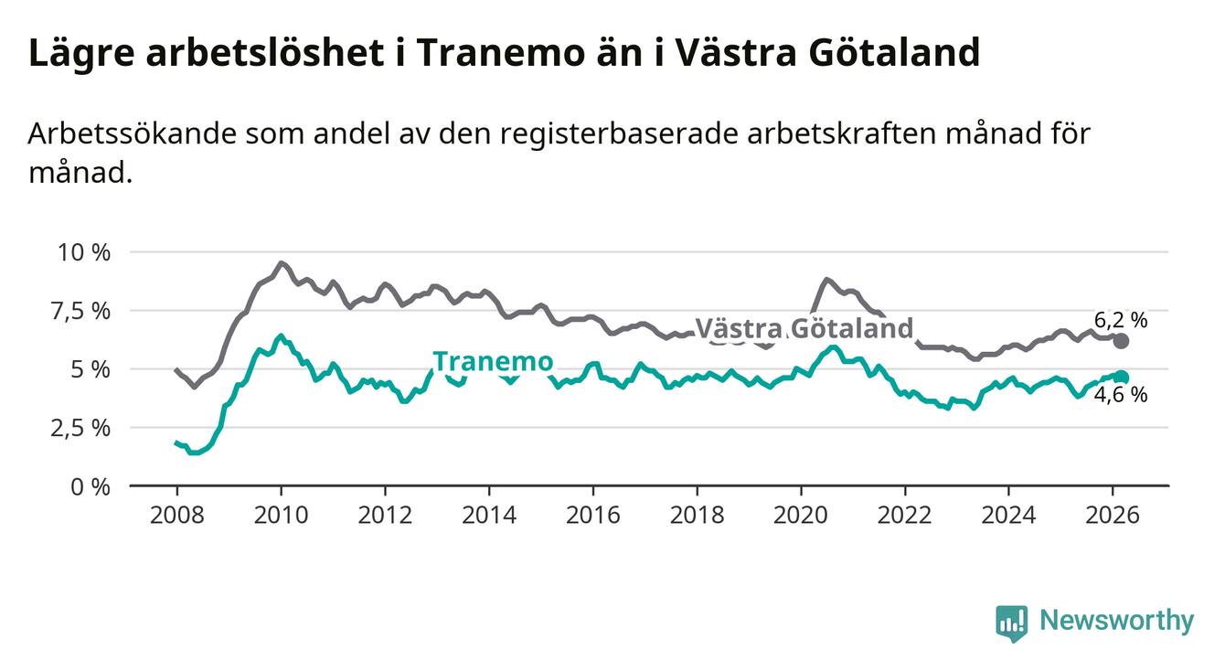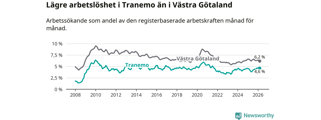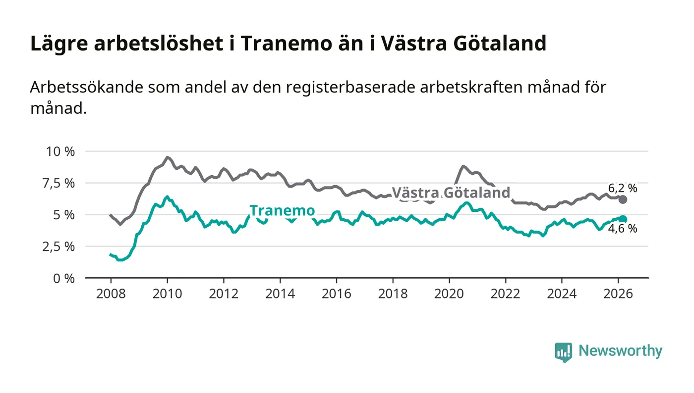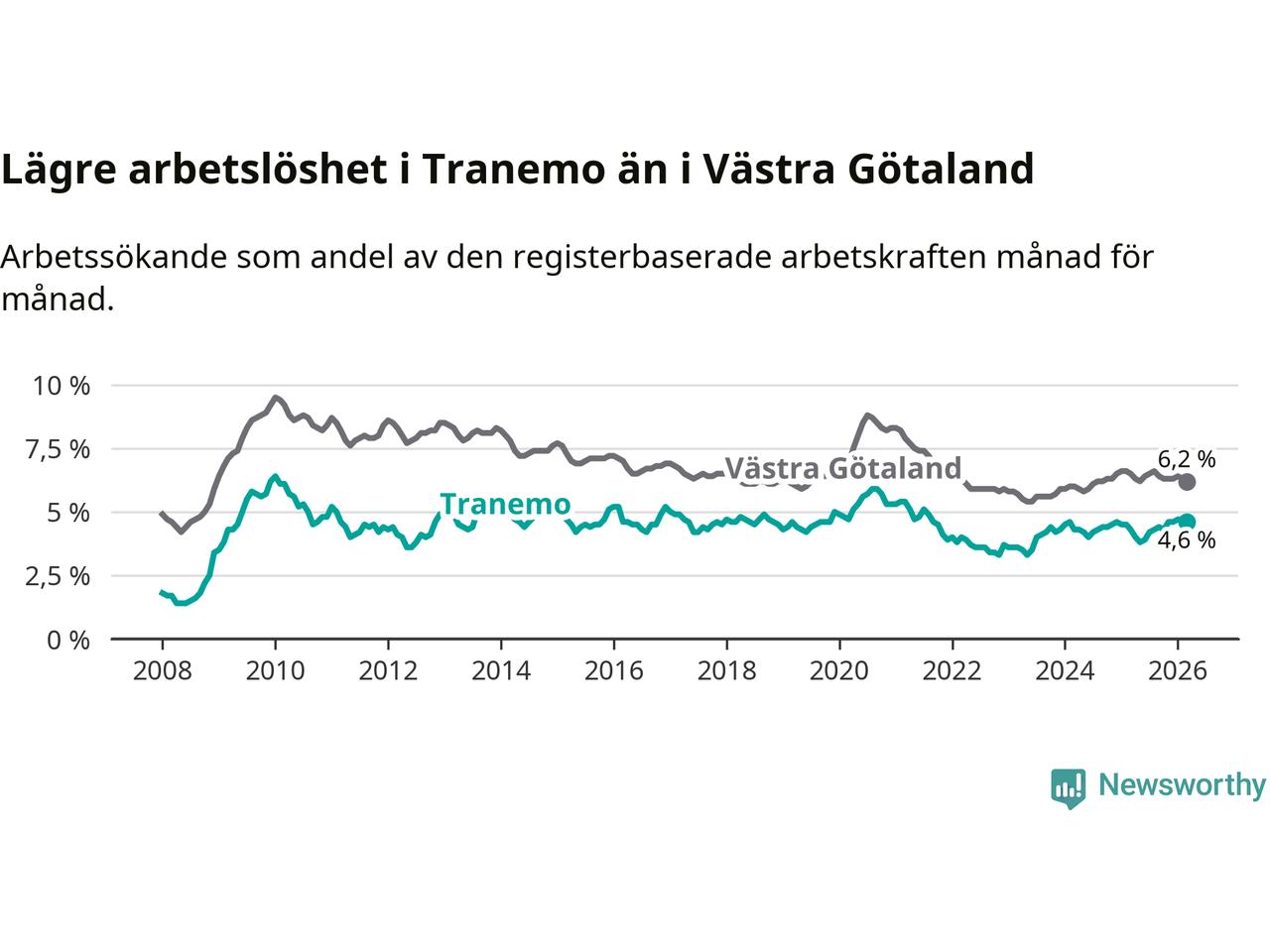 Under mars månad rapporterade Tranemo kommun en total arbetslöshet på 4,6 procent. Det är en ökning jämfört med samma tidpunkt i fjol (+0,3 procentenheter). I Västra Götalands län däremot sjunker arbetslösheten .