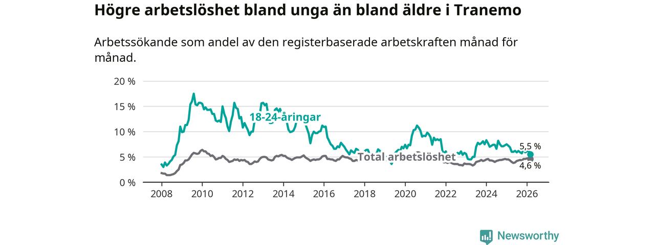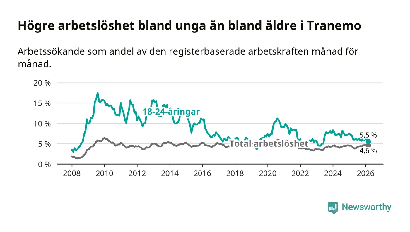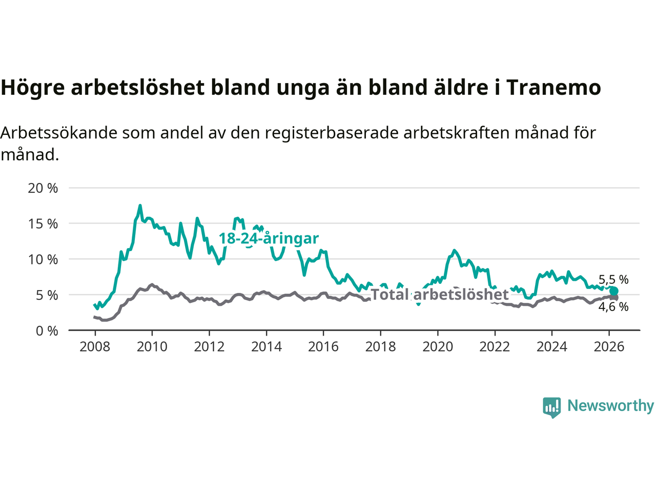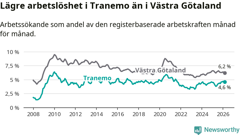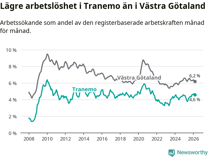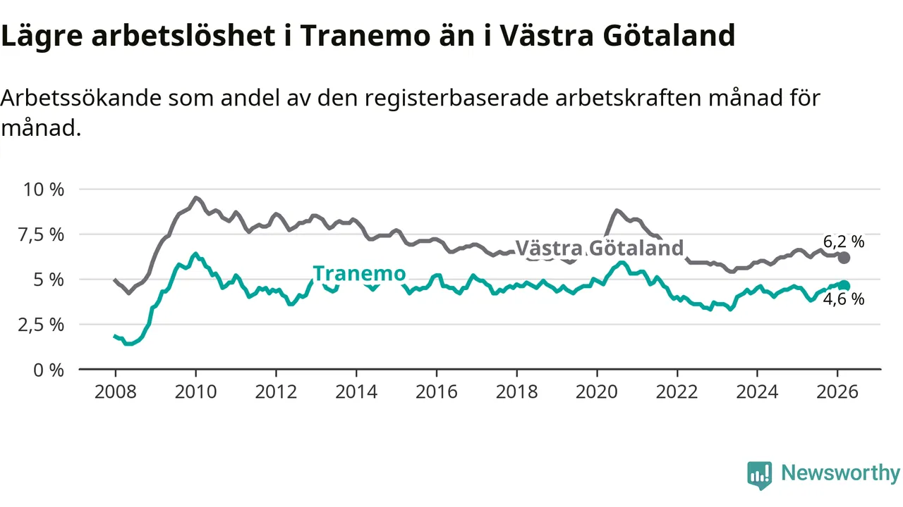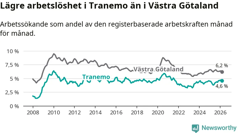 Under mars månad rapporterade Tranemo kommun en total arbetslöshet på 4,6 procent. Det är en ökning jämfört med samma tidpunkt i fjol (+0,3 procentenheter). I Västra Götalands län däremot sjunker arbetslösheten .