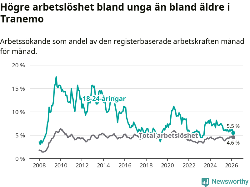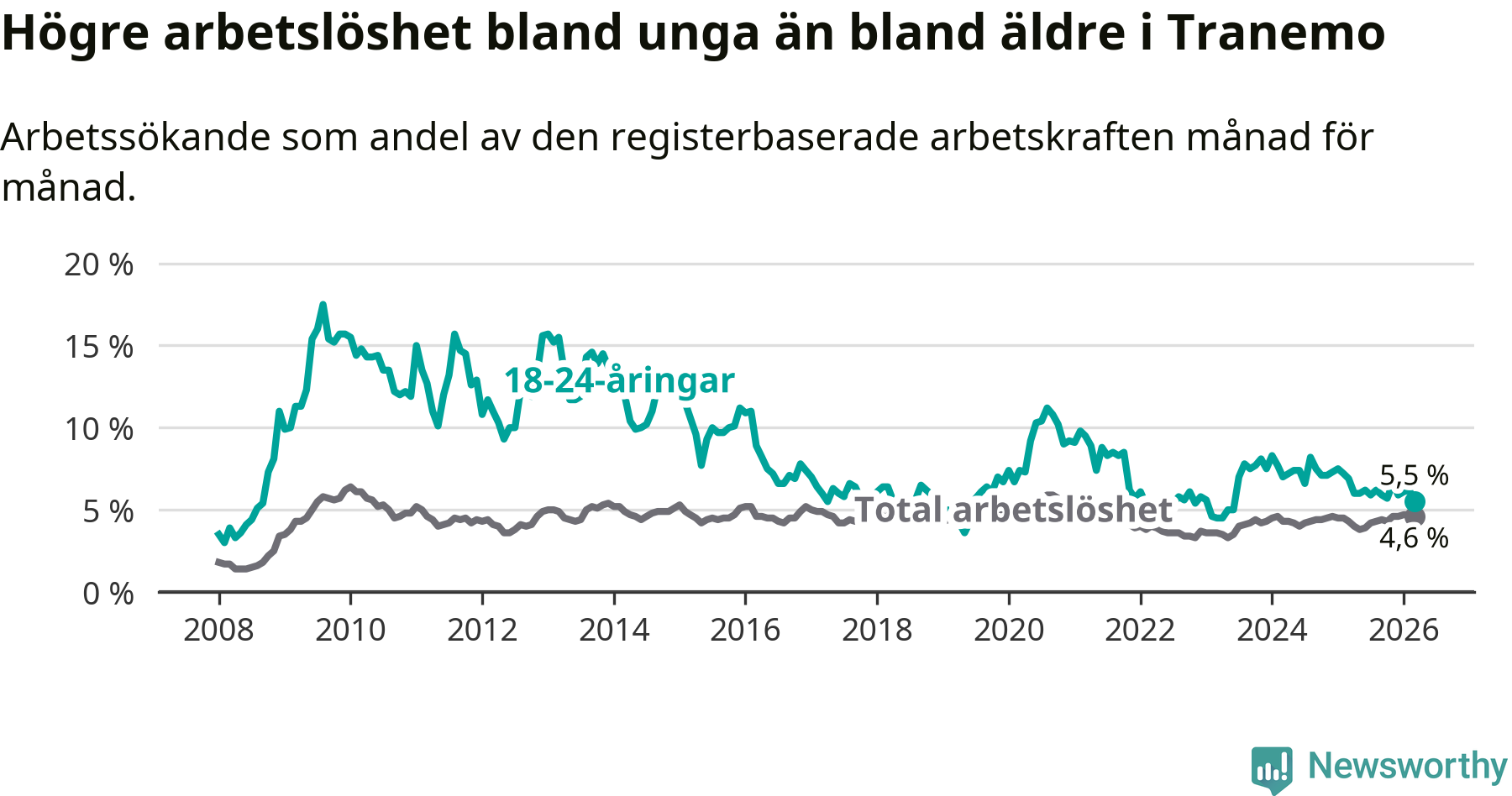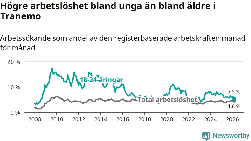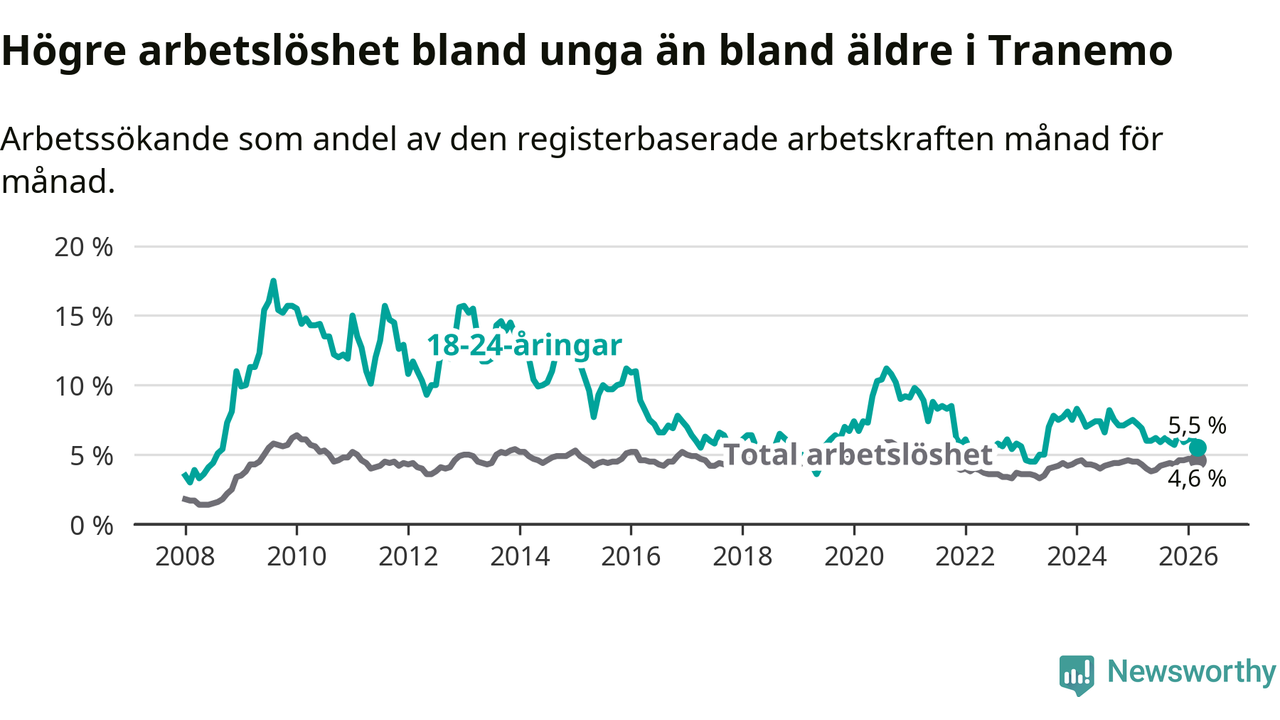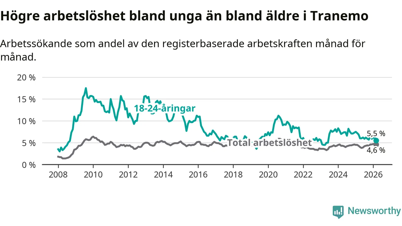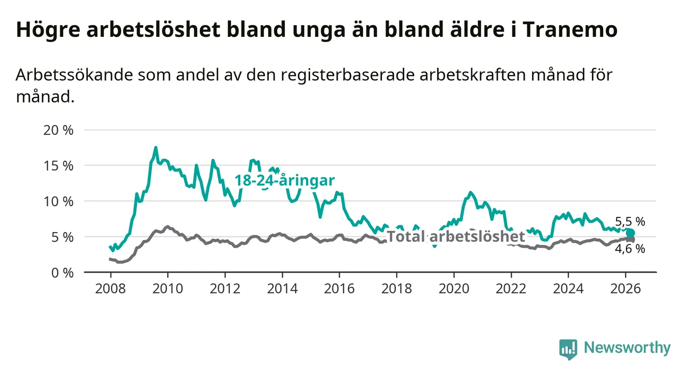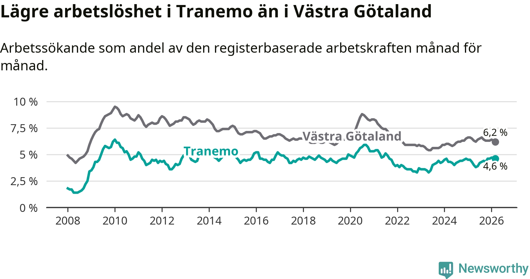 Under mars månad rapporterade Tranemo kommun en total arbetslöshet på 4,6 procent. Det är en ökning jämfört med samma tidpunkt i fjol (+0,3 procentenheter). I Västra Götalands län däremot sjunker arbetslösheten .
