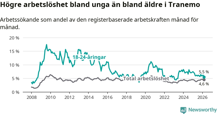 I och med den senaste månadens nedgång har de ungas arbetslöshet i Tranemo sjunkit 18 månader i följd (ner från 7,5 procent i september 2024 till 5,5 procent nu). Den nuvarande arbetslöshetsnivån är den lägsta sedan juni 2023.