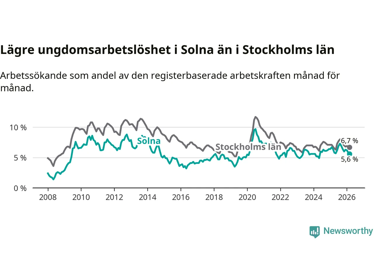 14 av 26 kommuner i Stockholms län såg en minskande ungdoms­arbetslöshet i mars. Solna var en av de kommuner i länet där nedgången var störst.