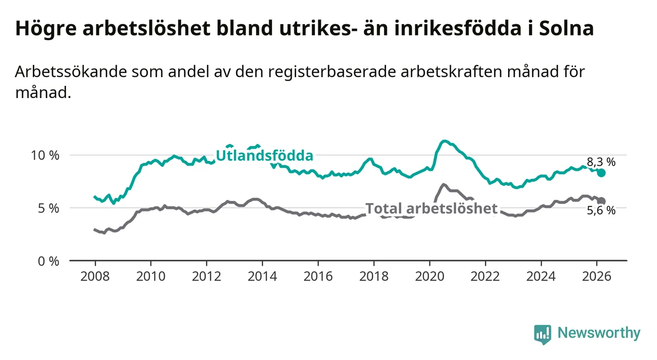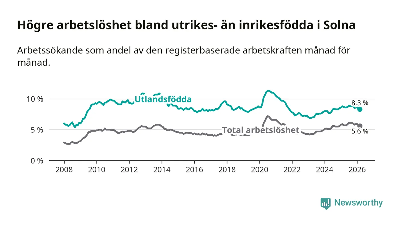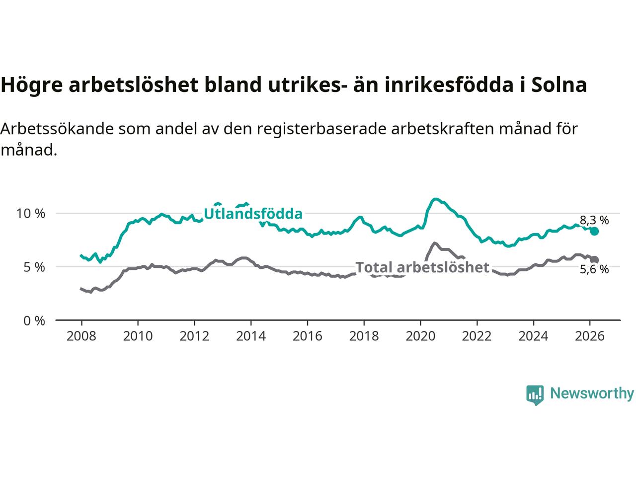 Arbetslösheten bland utlandsfödda var 8,3 procent i Solna under mars månad, motsvarande 1 519 av 18 301 personer. Det är 0,4 procentenheter färre än vid samma tidpunkt i fjol (−38 om man räknar personer).