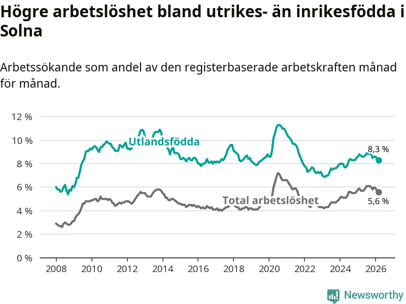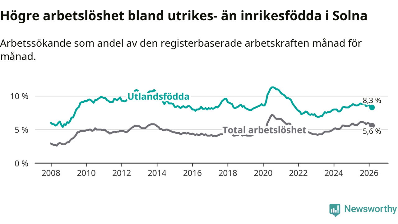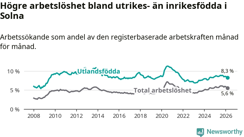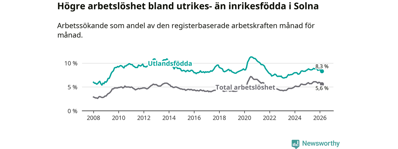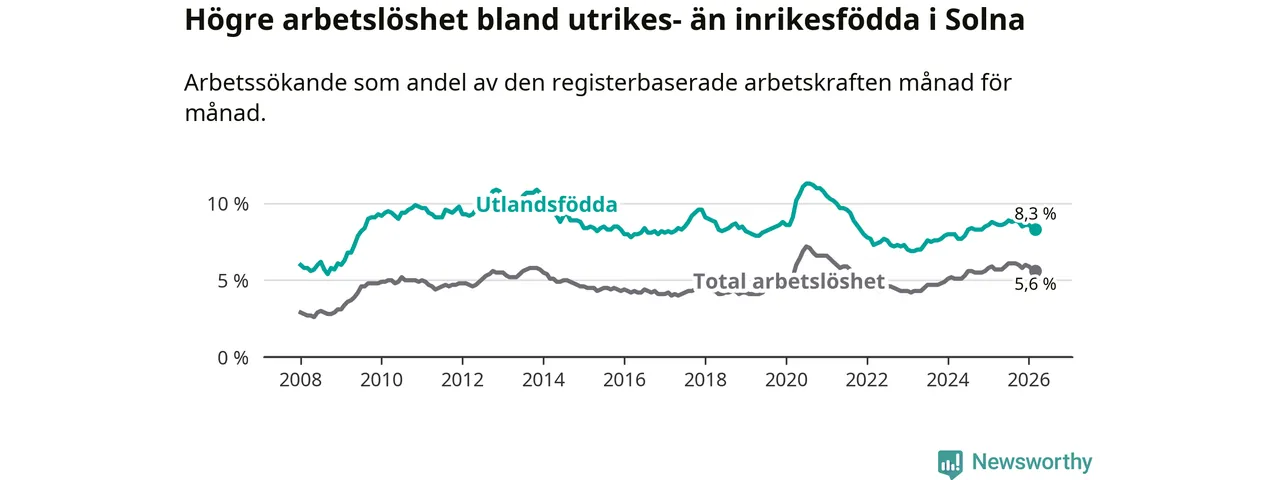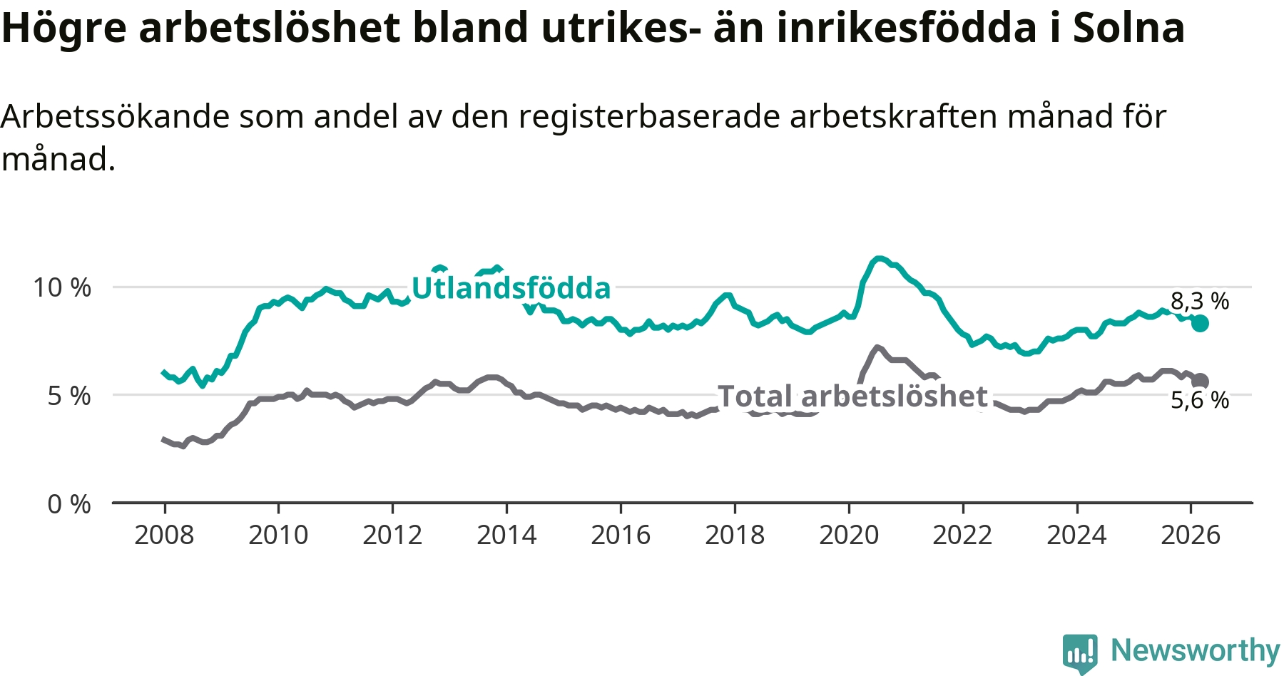 Arbetslösheten bland utlandsfödda var 8,3 procent i Solna under mars månad, motsvarande 1 519 av 18 301 personer. Det är 0,4 procentenheter färre än vid samma tidpunkt i fjol (−38 om man räknar personer).