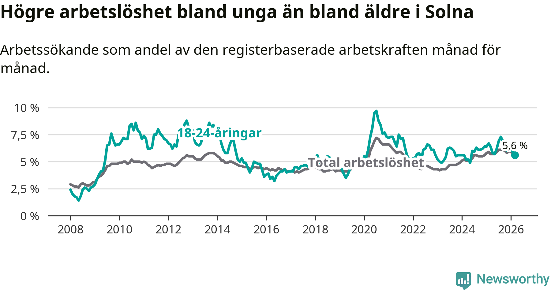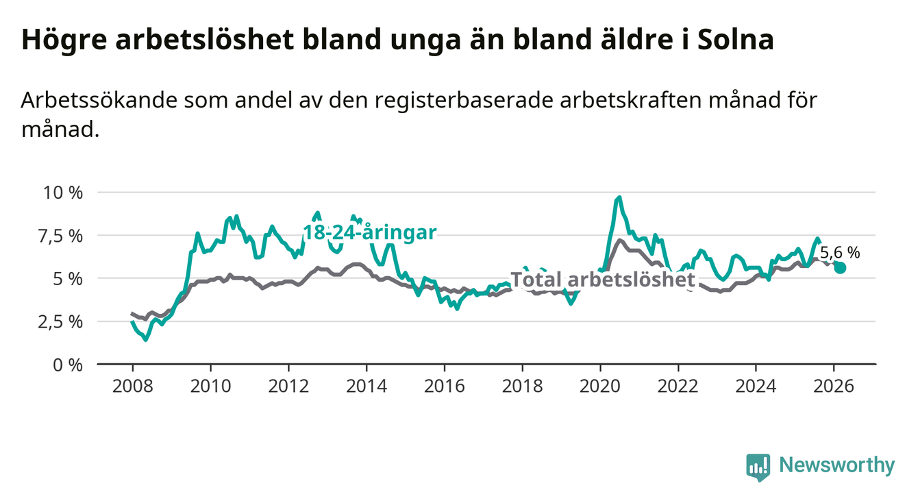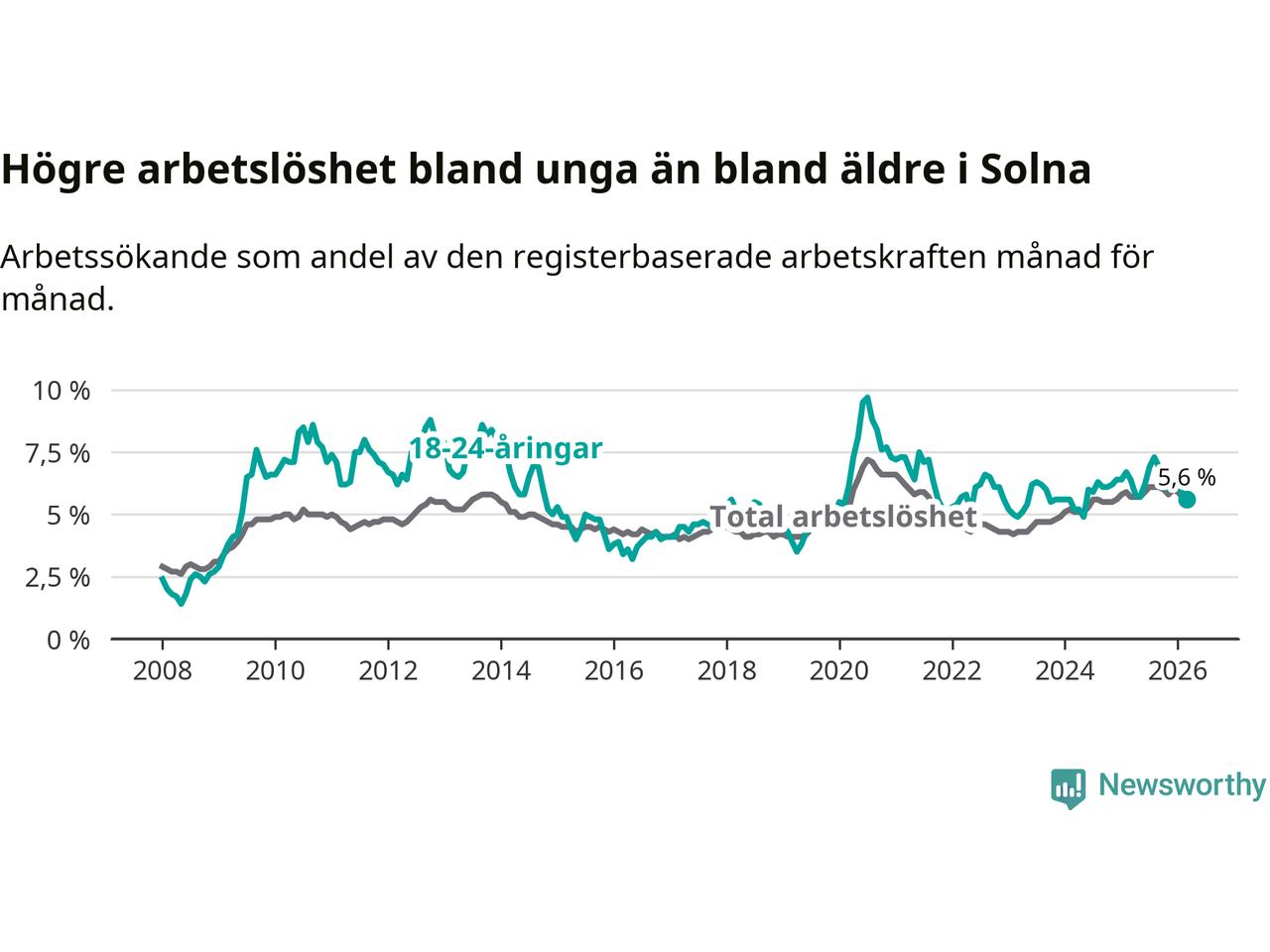 Den senaste månadsstatistiken från Arbetsförmedlingen visar på en nedgång i ungdoms­arbetslöshet i Solna kommun med 0,8 procentenheter. Arbetslösheten bland personer i åldern 18–24 år låg i mars på 5,6 procent.