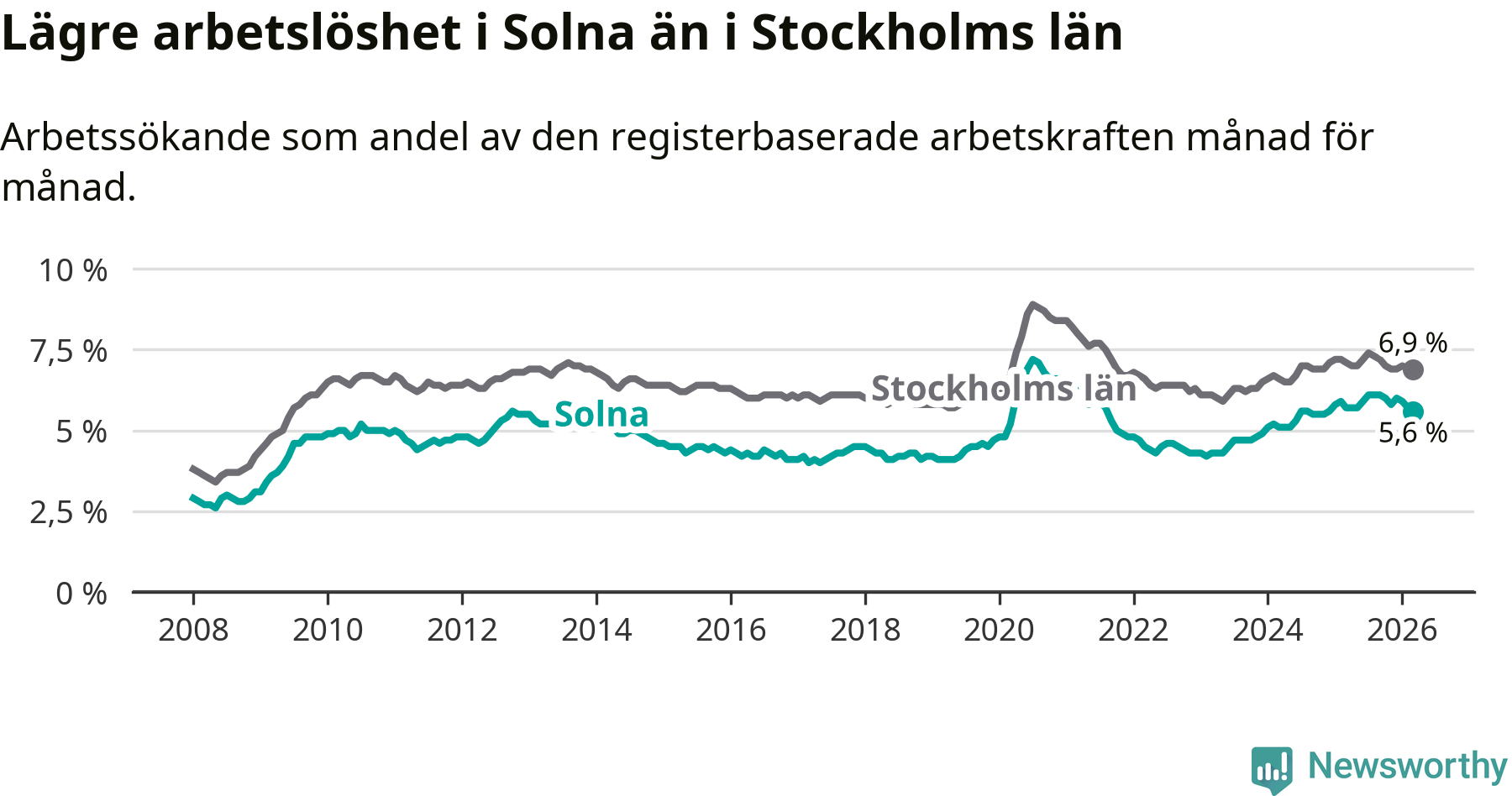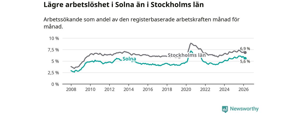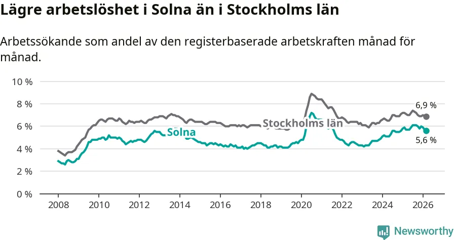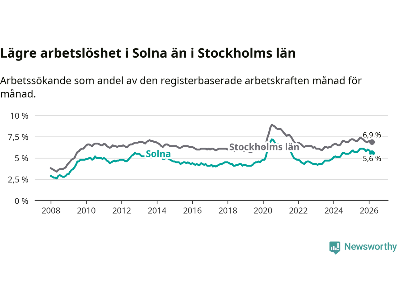Under mars månad rapporterade Solna kommun en total arbetslöshet på 5,6 procent. Det är en minskning jämfört med samma tidpunkt i fjol (−0,1 procentenheter). Även i Stockholms län sjunker arbetslösheten något.
