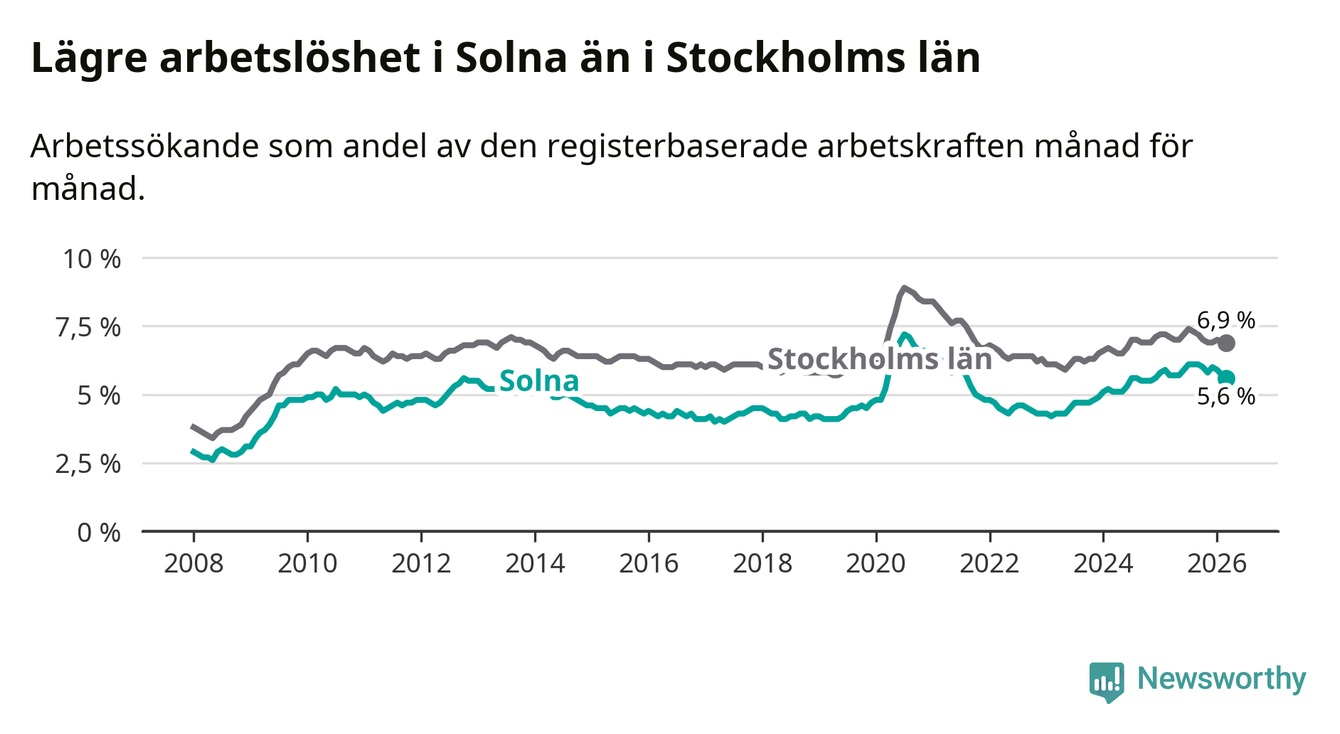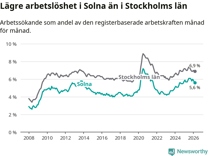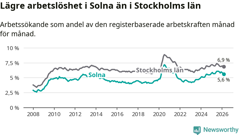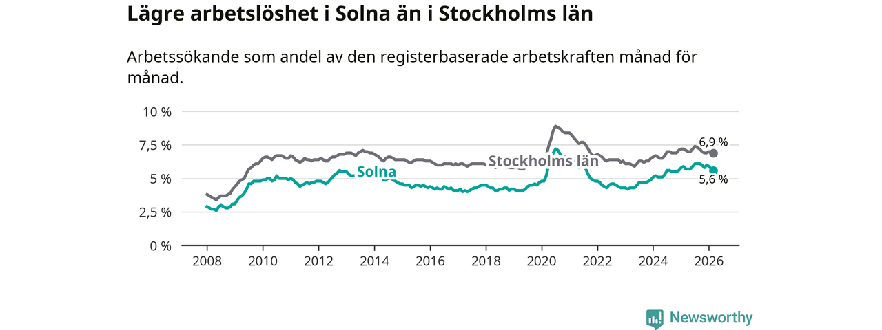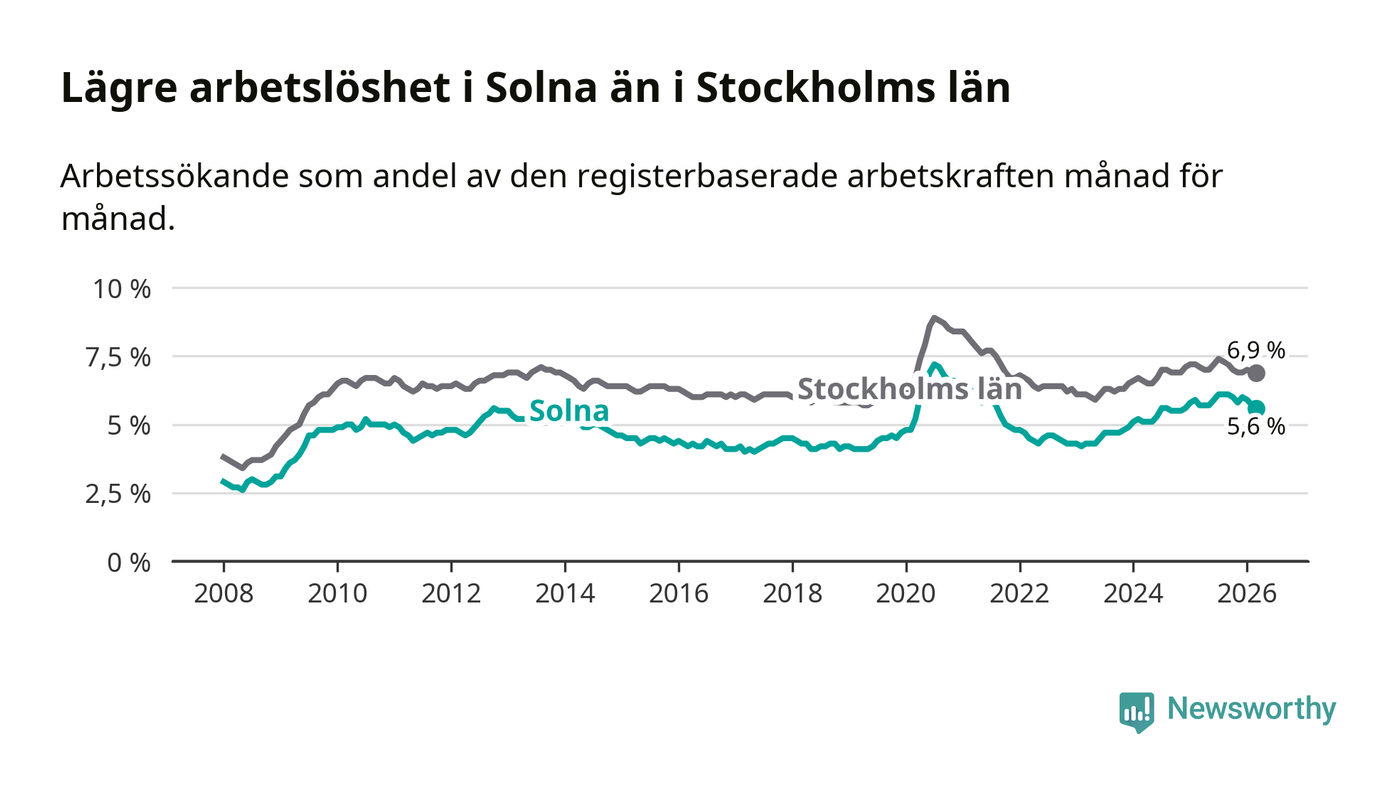Under mars månad rapporterade Solna kommun en total arbetslöshet på 5,6 procent. Det är en minskning jämfört med samma tidpunkt i fjol (−0,1 procentenheter). Även i Stockholms län sjunker arbetslösheten något.