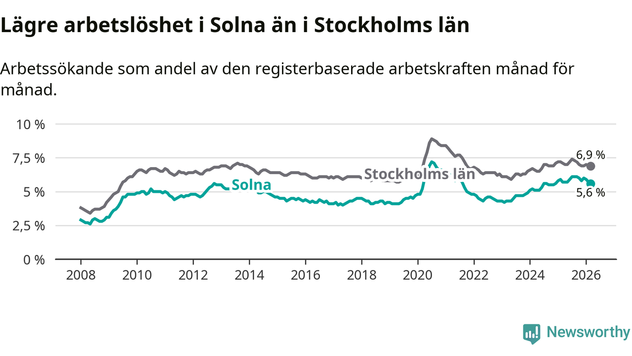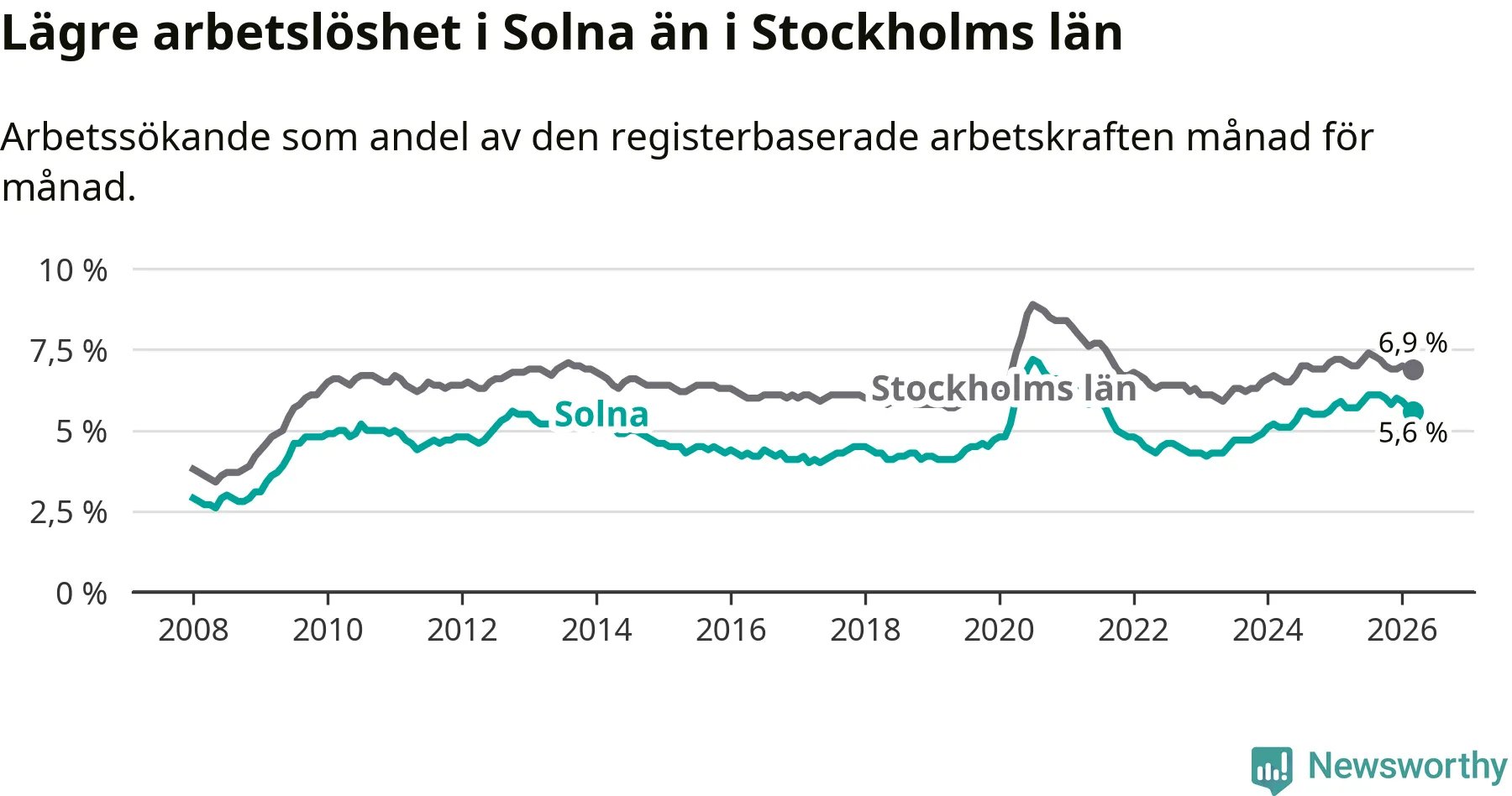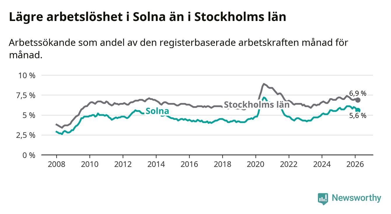 Solna hade redan tidigare lägre arbetslöshet än snittet i hela Stockholms län och nu växer klyftan (5,6 procent i kommunen, jämfört med 6,9 procent i hela länet). Ekerö har den lägsta arbetslösheten i länet (3,6 procent), medan Södertälje har den högsta (10,8 procent). För att Solna skulle komma ner i samma arbetslöshetsnivå som Ekerö skulle 969 personer behöva sysselsättas.
