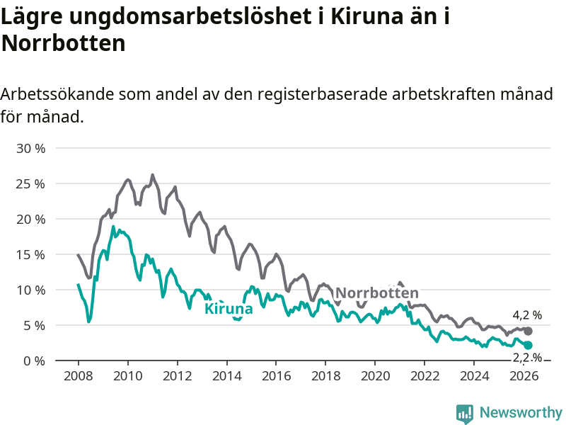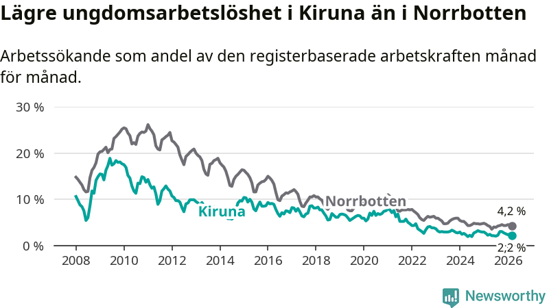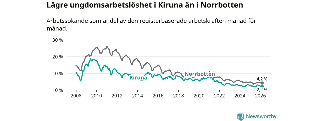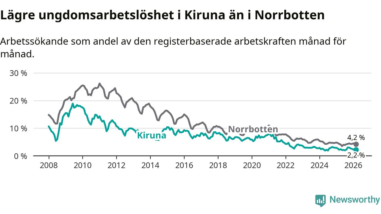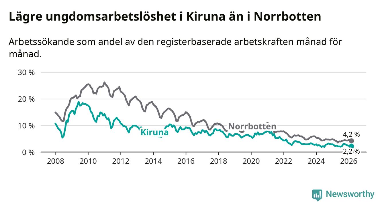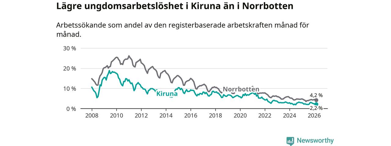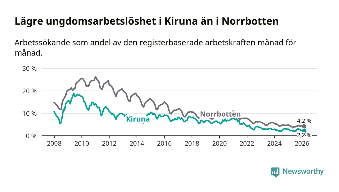 Precis som den totala arbetslösheten ligger ungdomsarbetslösheten i Kiruna lägre än i Norrbotten som helhet. Skillnaden mellan kommunen och länet är 2,0 procentenheter.