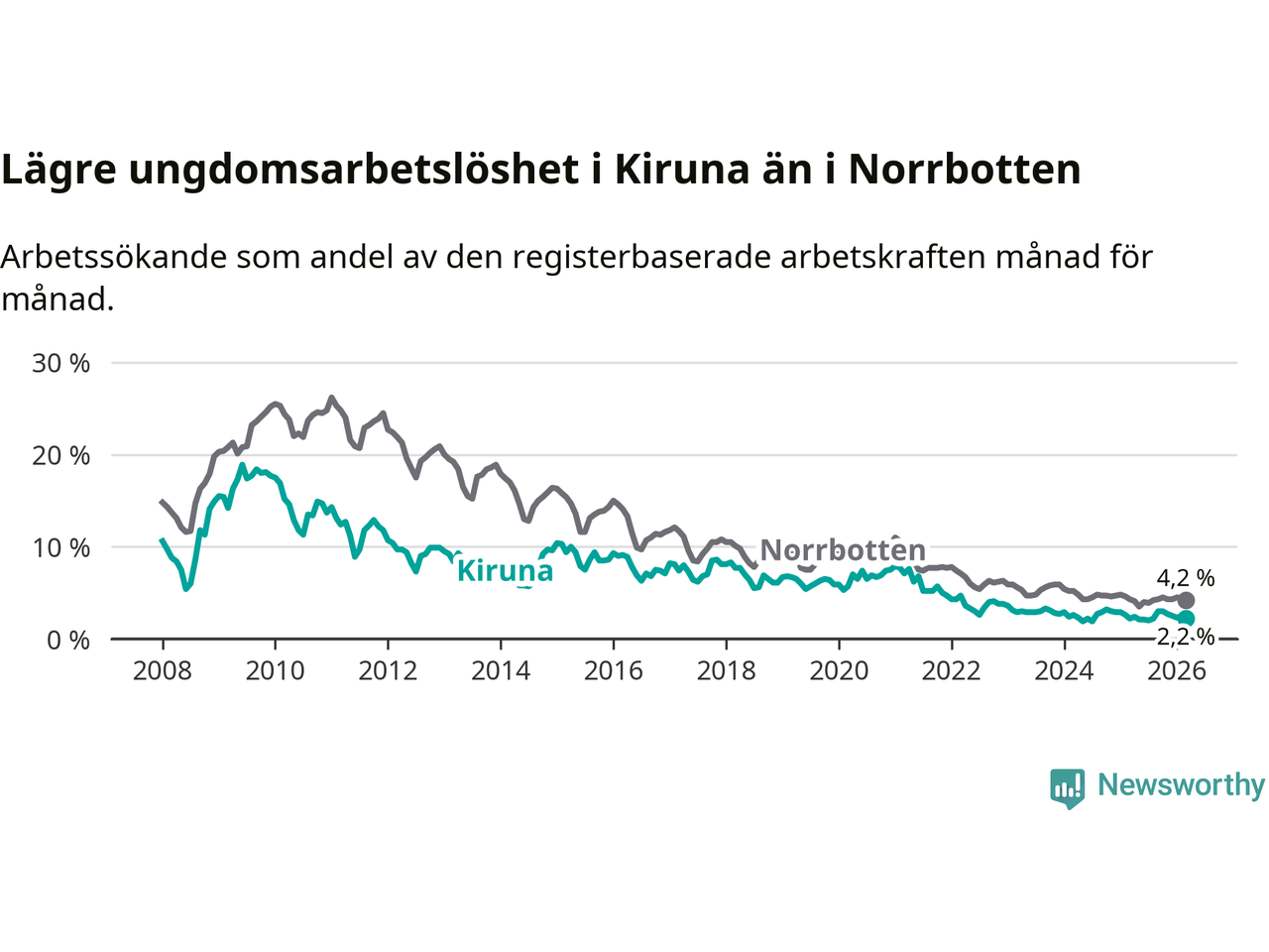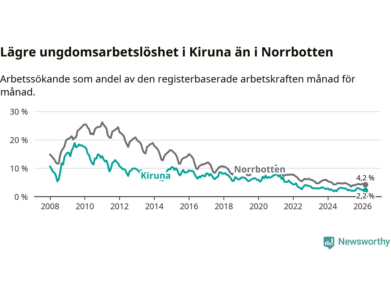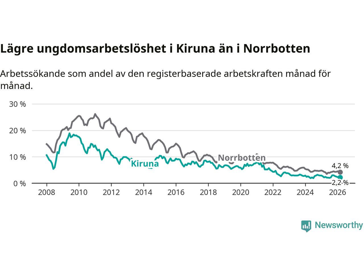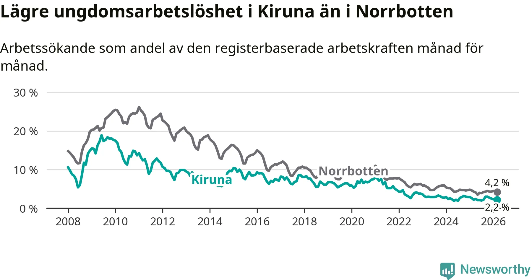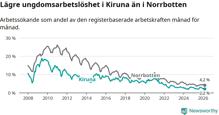 Precis som den totala arbetslösheten ligger ungdomsarbetslösheten i Kiruna lägre än i Norrbotten som helhet. Skillnaden mellan kommunen och länet är 2,0 procentenheter.