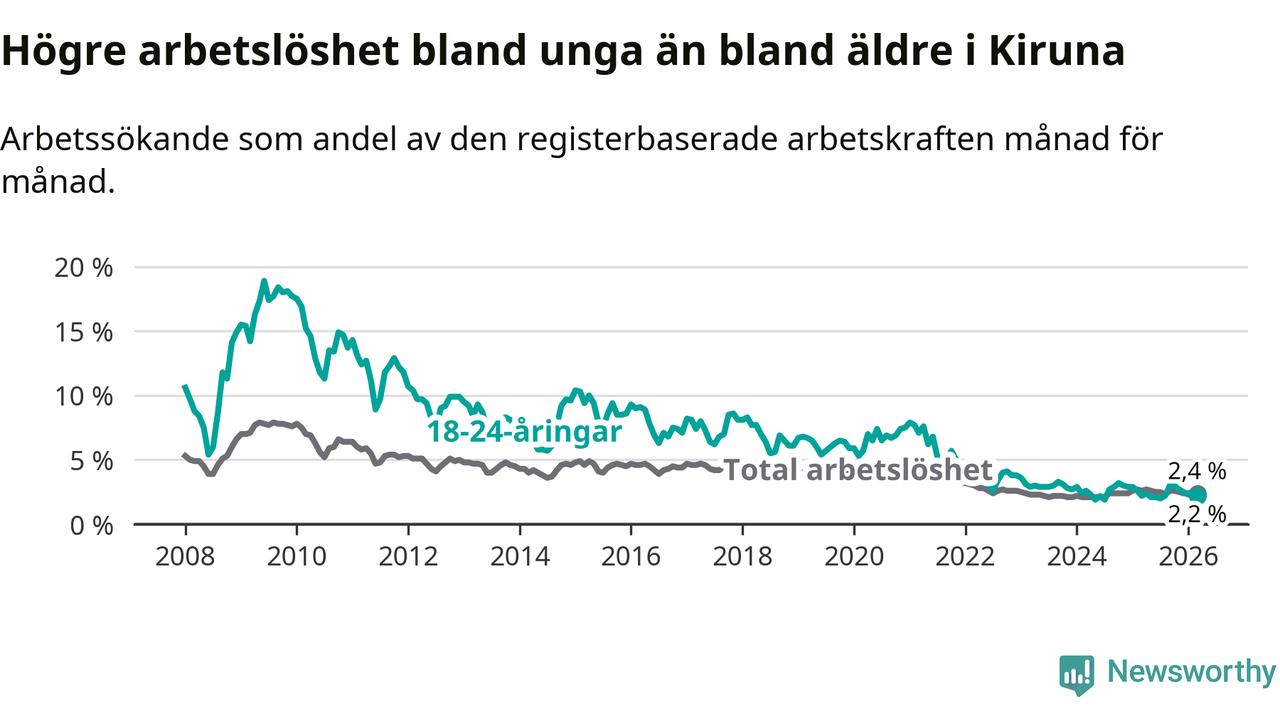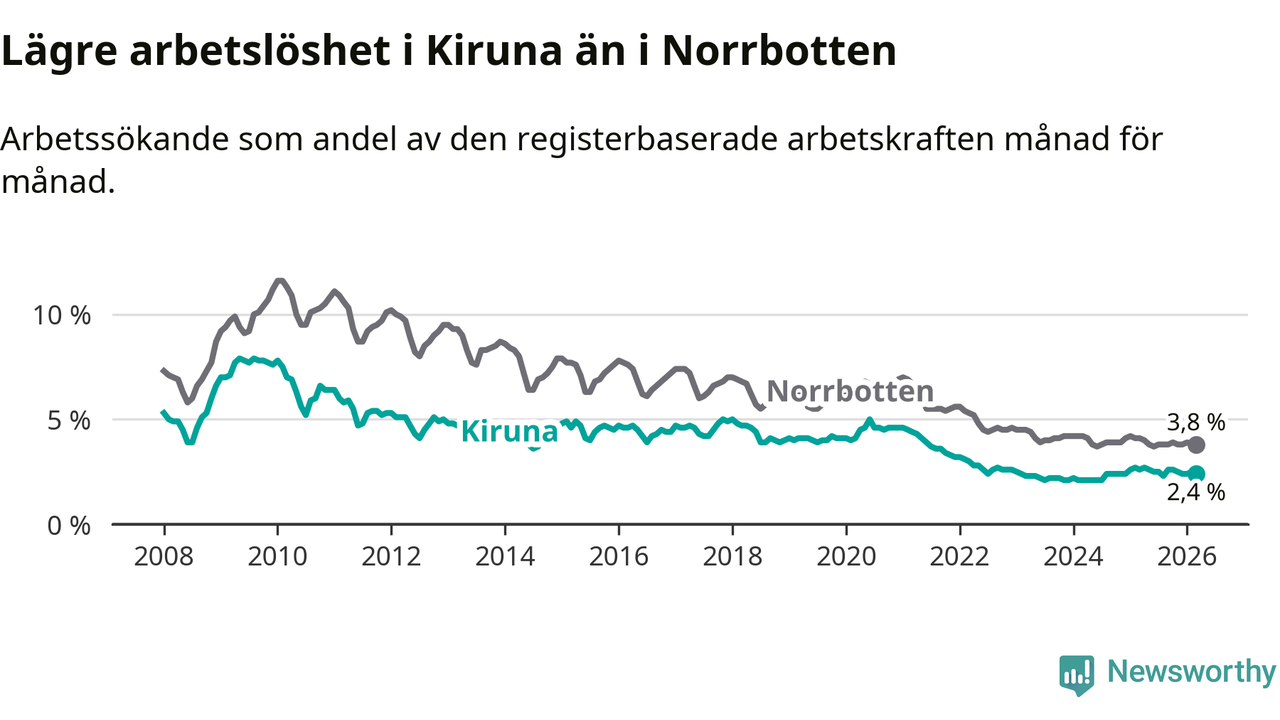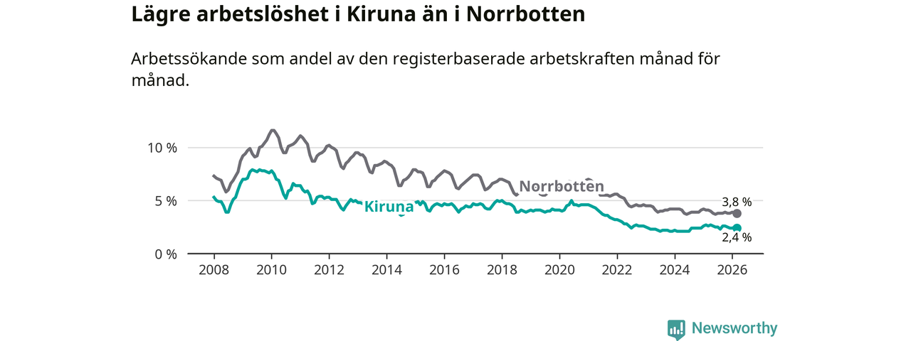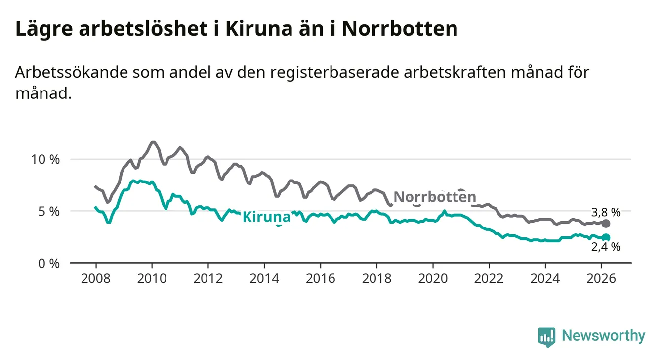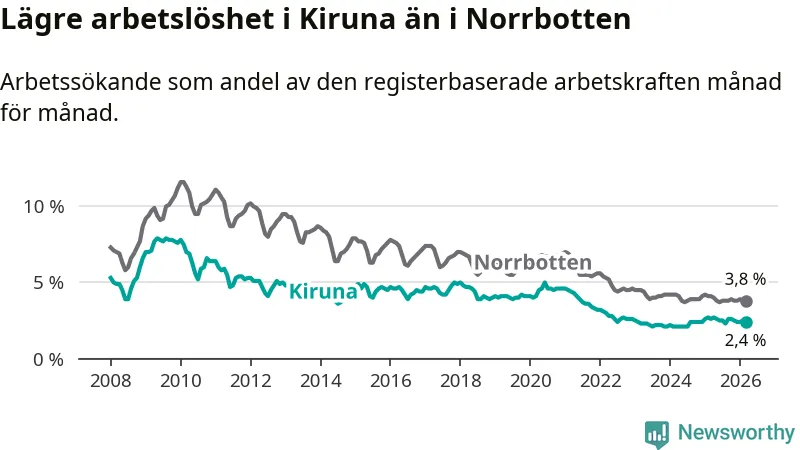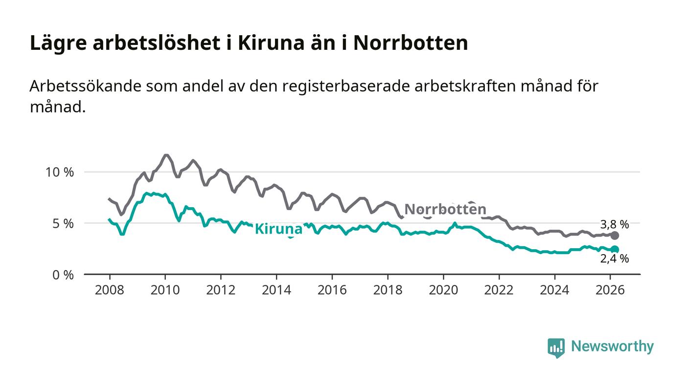 Under mars månad rapporterade Kiruna kommun en total arbetslöshet på 2,4 procent. Det är en minskning jämfört med samma tidpunkt i fjol (−0,2 procentenheter). Även i Norrbottens län sjunker arbetslösheten .