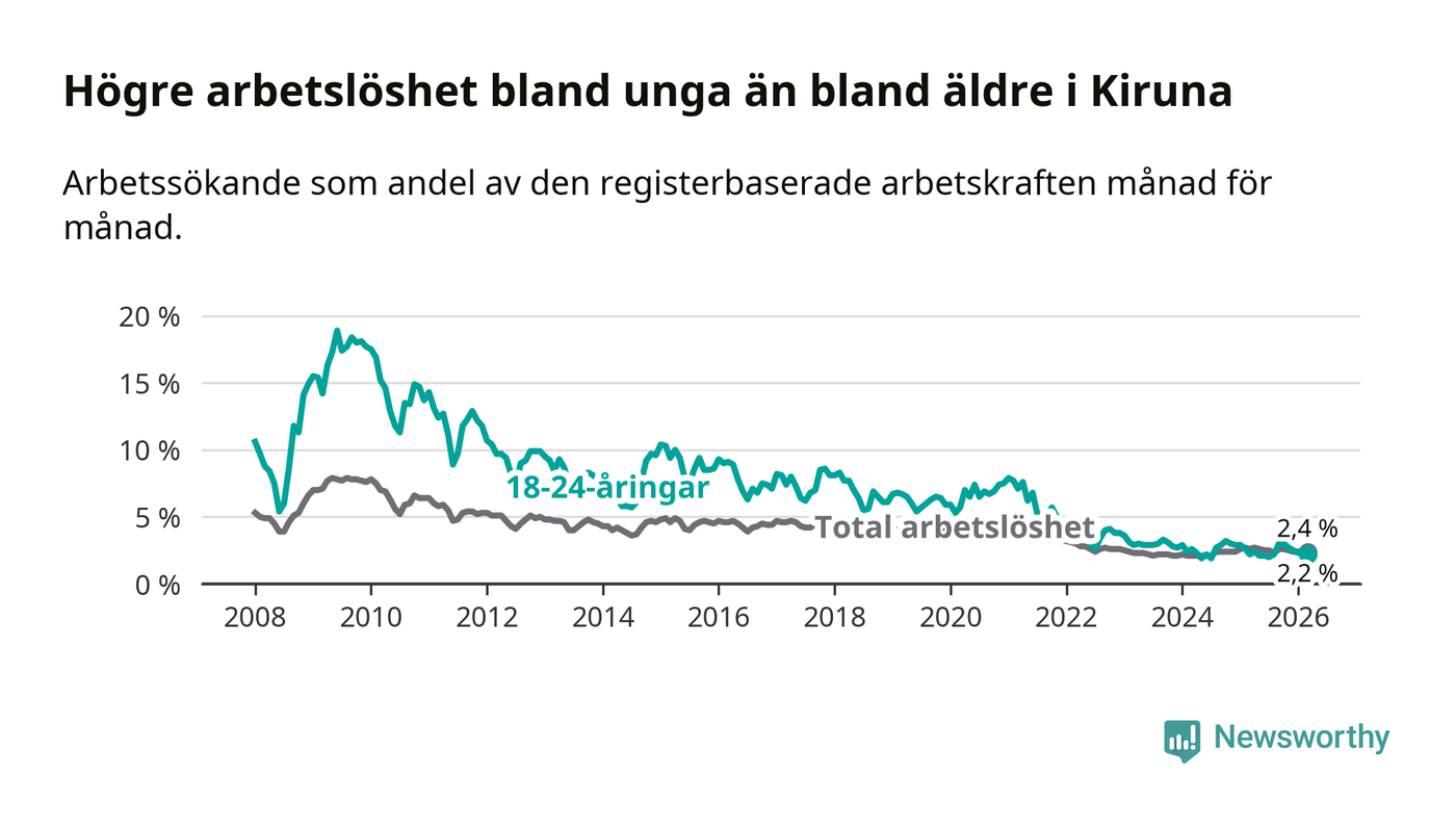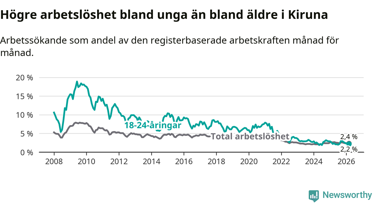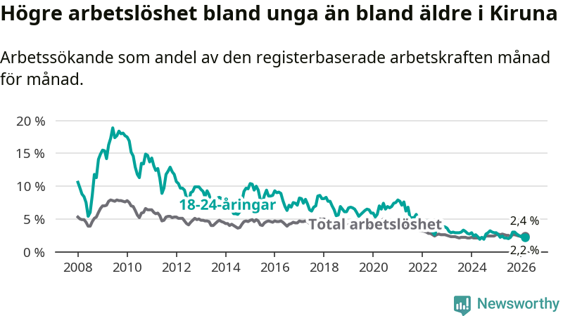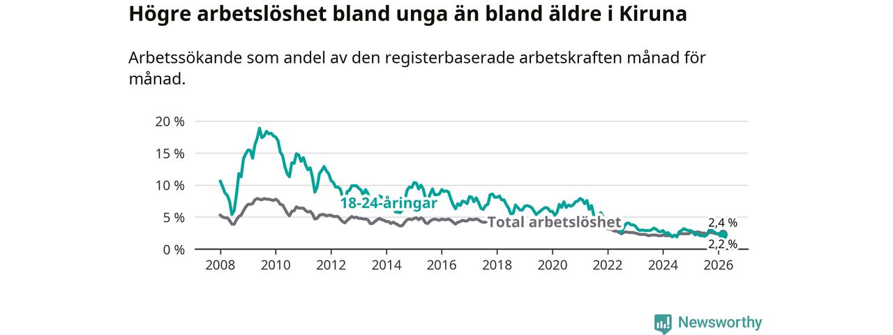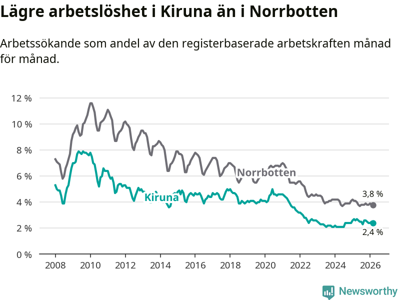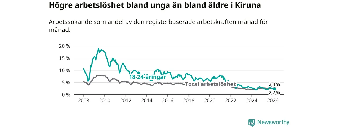 Under mars månad rapporterade Kiruna kommun en total arbetslöshet på 2,4 procent. Det är en minskning jämfört med samma tidpunkt i fjol (−0,2 procentenheter). Även i Norrbottens län sjunker arbetslösheten .