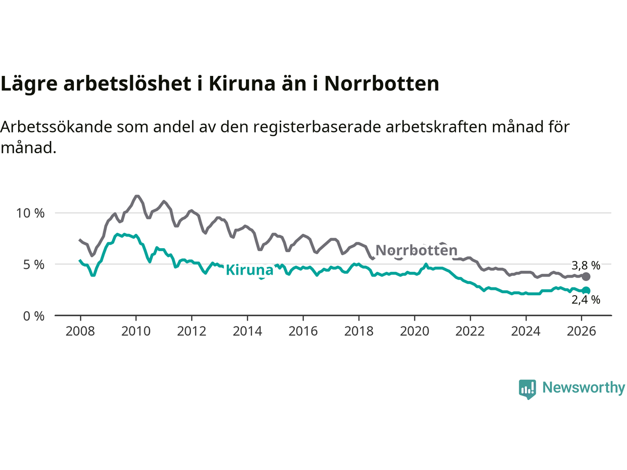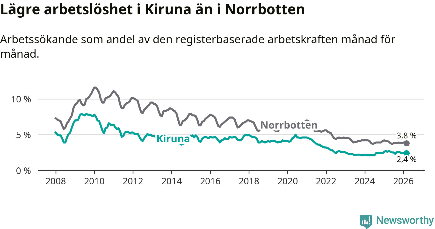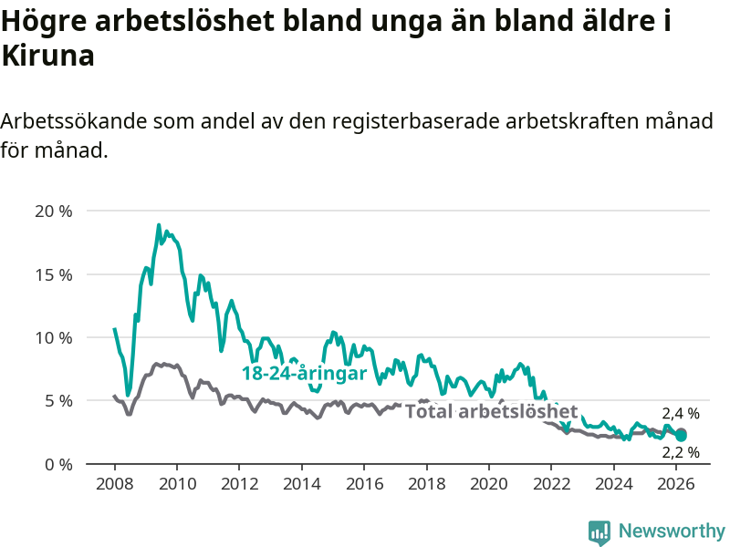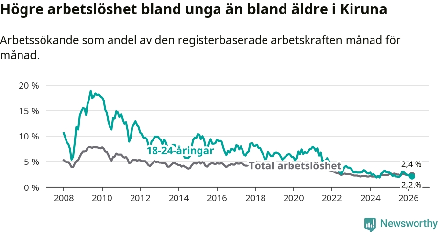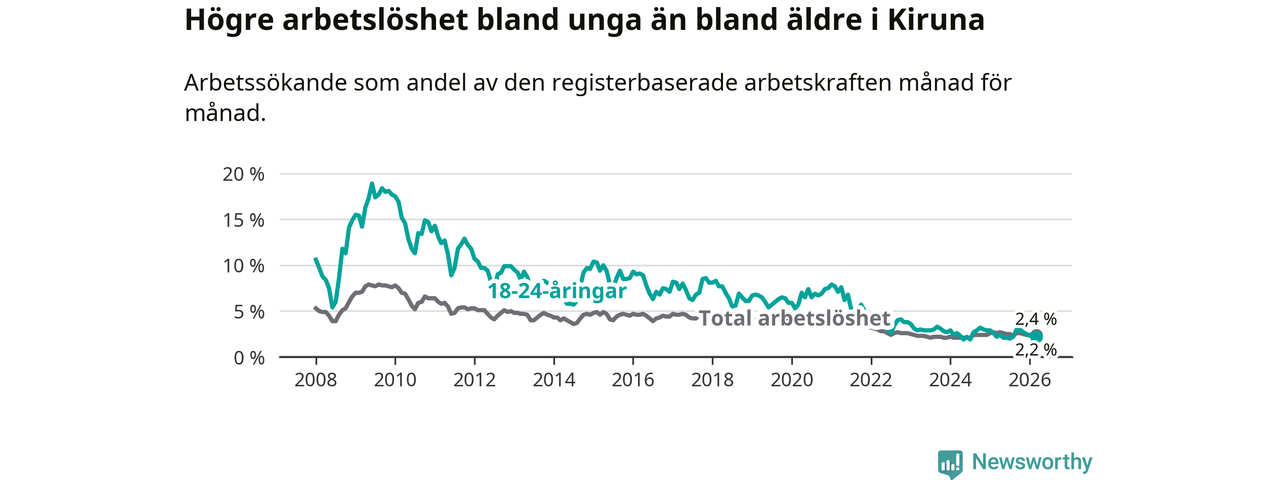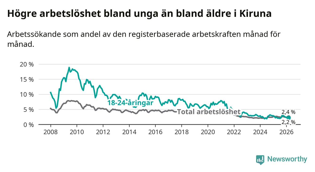 Under mars månad rapporterade Kiruna kommun en total arbetslöshet på 2,4 procent. Det är en minskning jämfört med samma tidpunkt i fjol (−0,2 procentenheter). Även i Norrbottens län sjunker arbetslösheten .