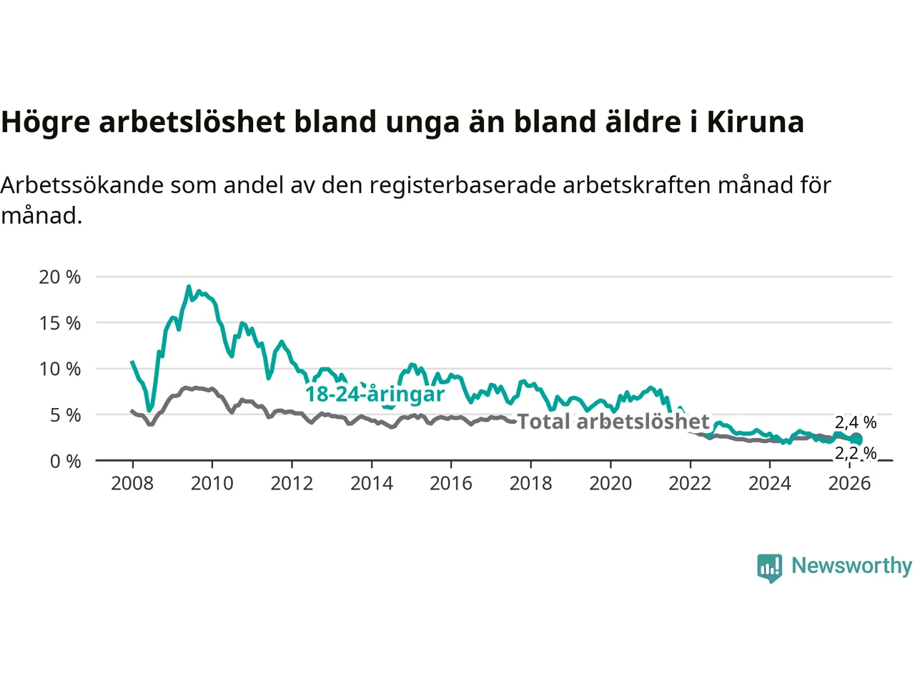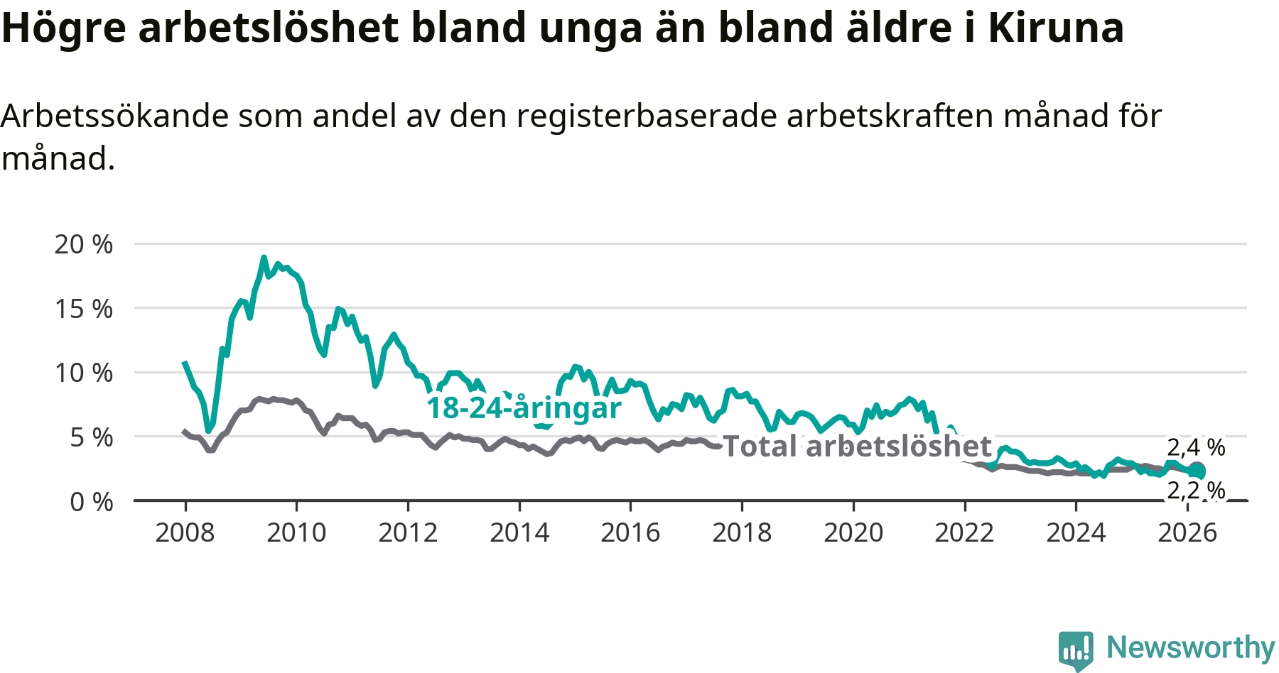 Till skillnad från den totala arbetslösheten står arbetslösheten bland unga stilla. I mars var 2,2 procent av 18–24-åringarna inskrivna som arbetssökande (motsvarande 29 personer).