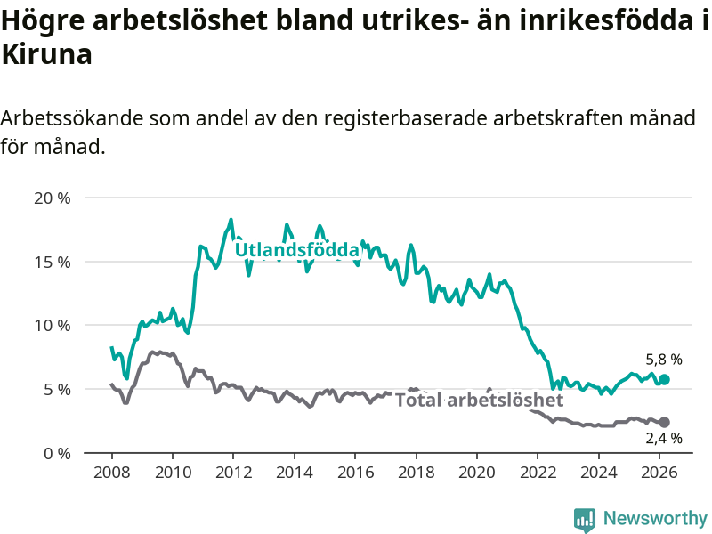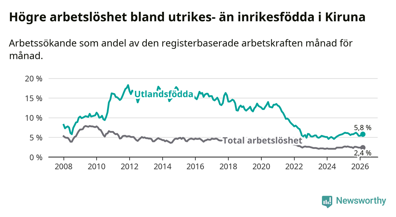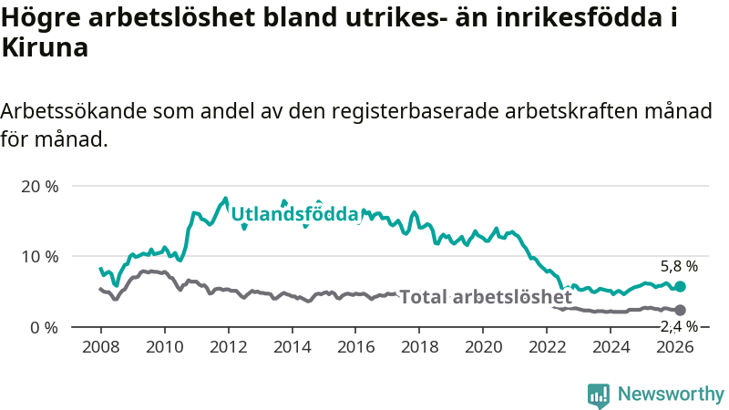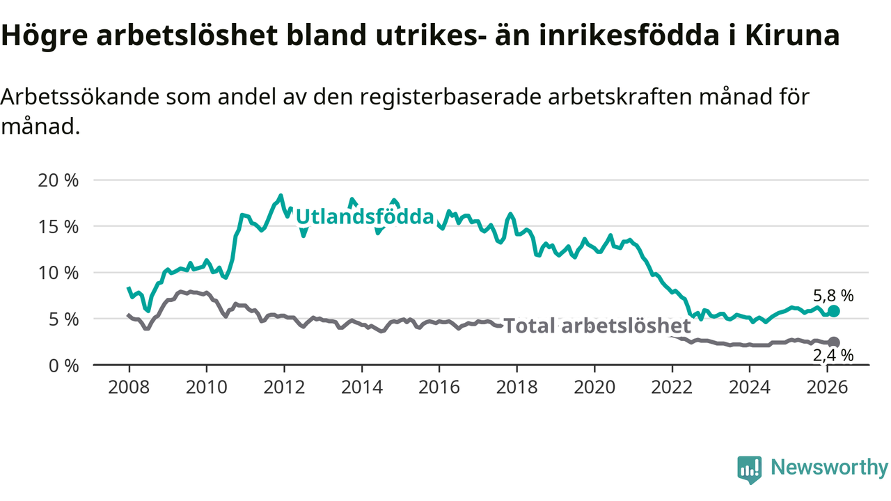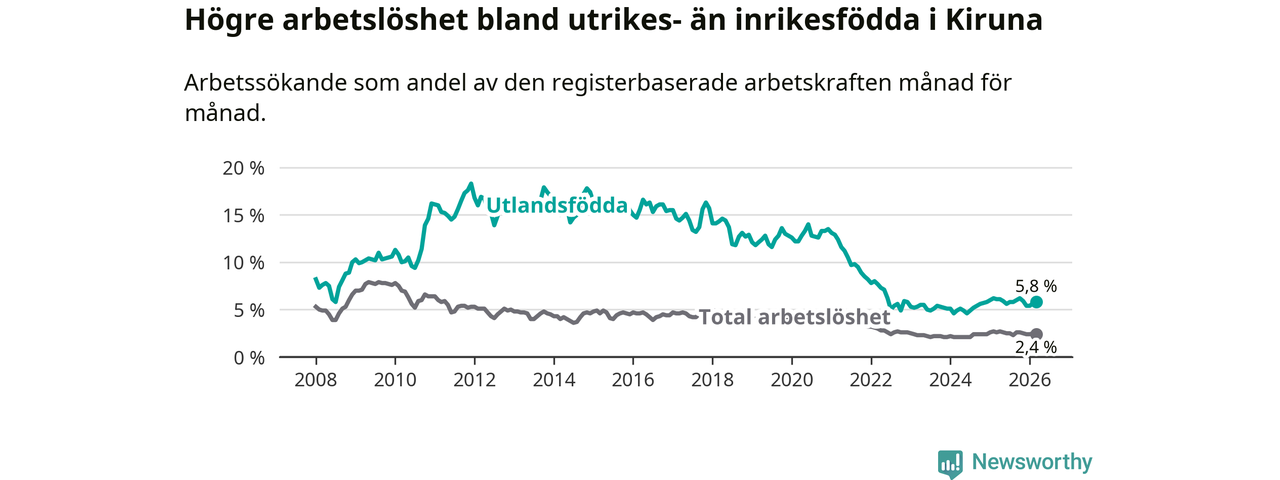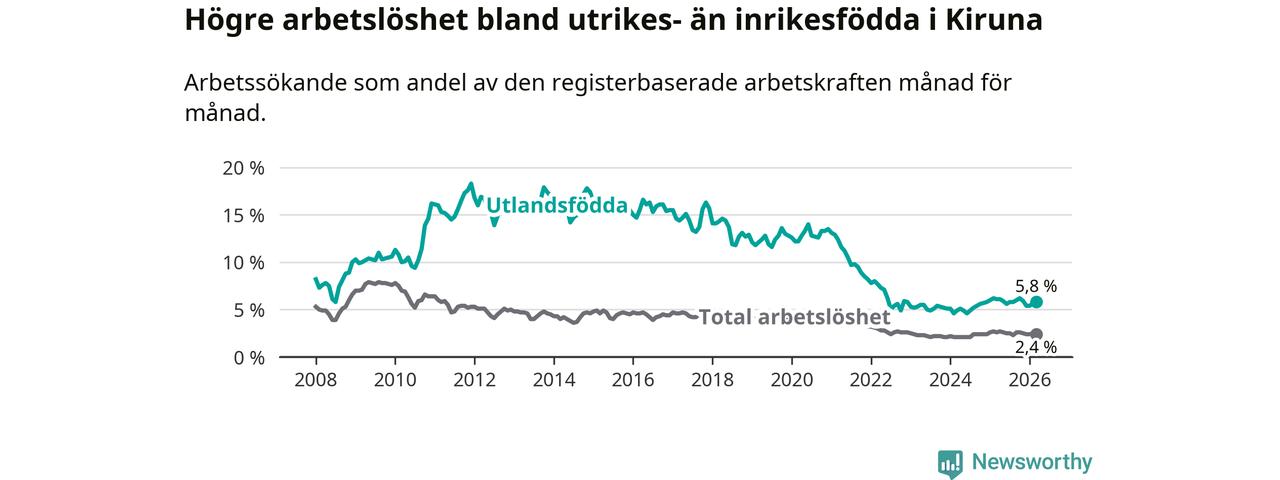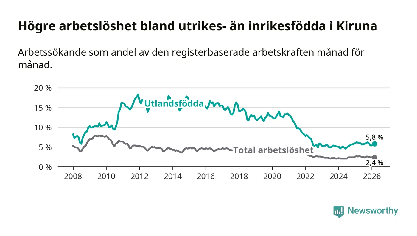 Arbetslösheten bland utlandsfödda var 5,8 procent i Kiruna under mars månad, motsvarande 120 av 2 069 personer. Det är 0,3 procentenheter färre än vid samma tidpunkt i fjol (+2 om man räknar personer).