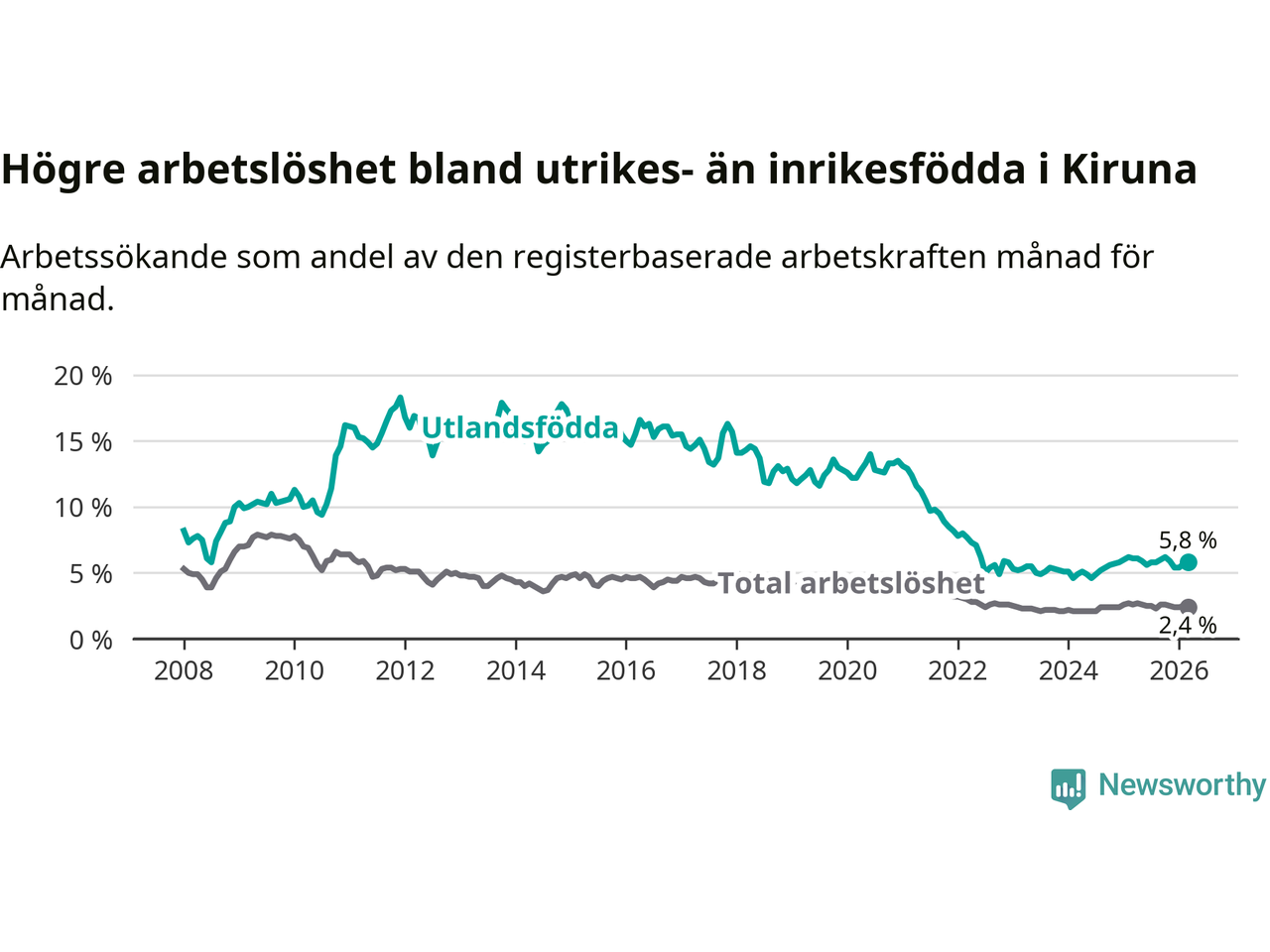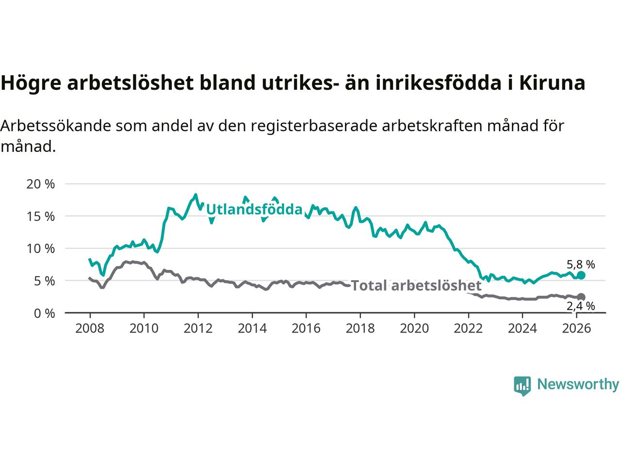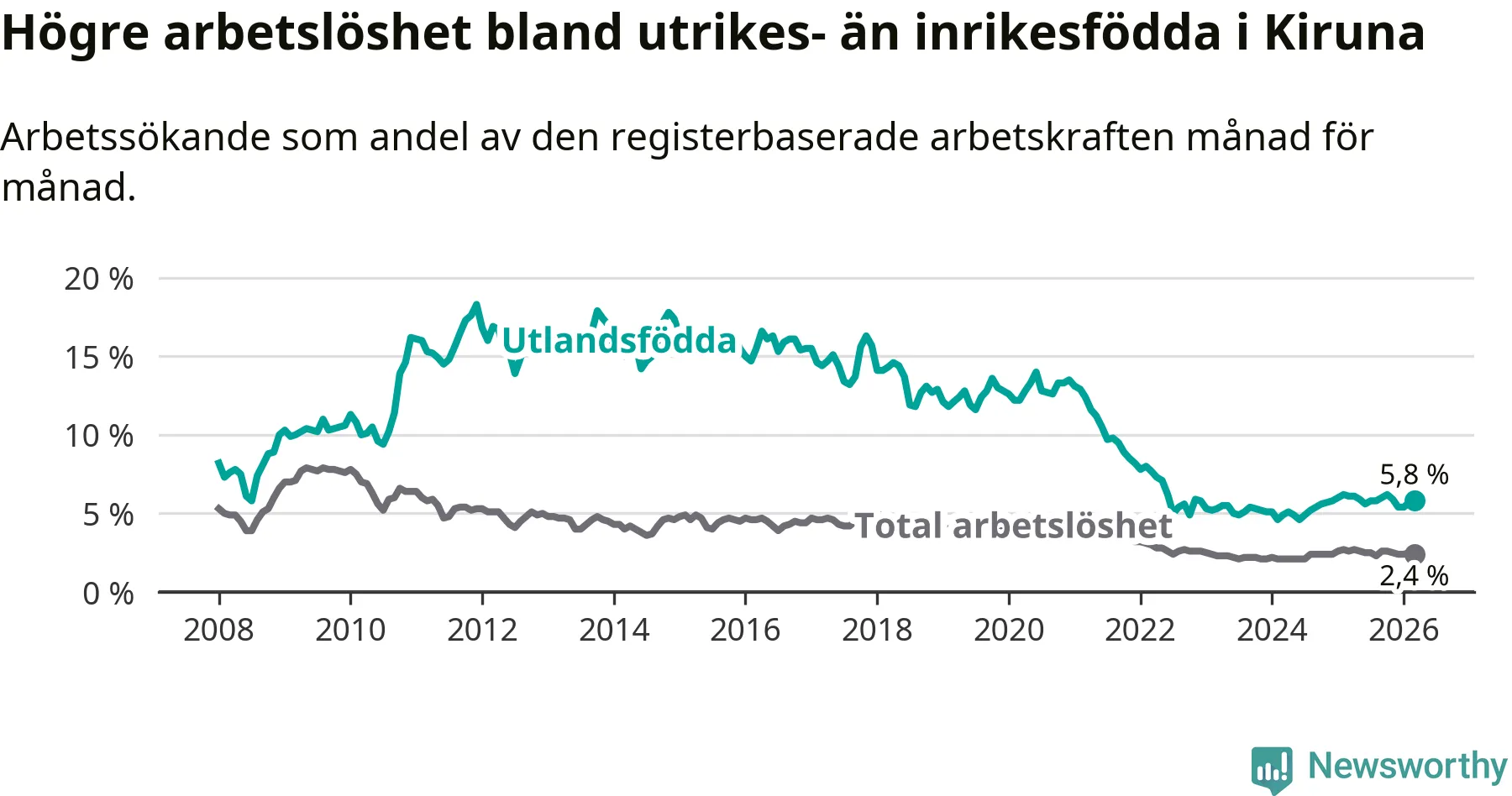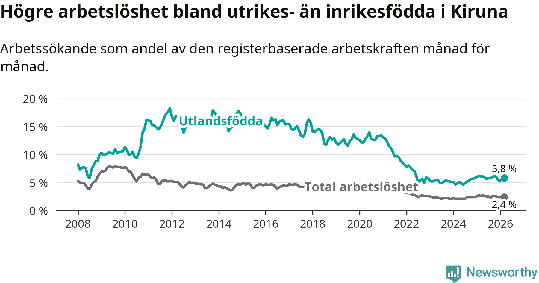 Arbetslösheten bland utlandsfödda var 5,8 procent i Kiruna under mars månad, motsvarande 120 av 2 069 personer. Det är 0,3 procentenheter färre än vid samma tidpunkt i fjol (+2 om man räknar personer).