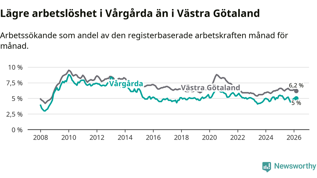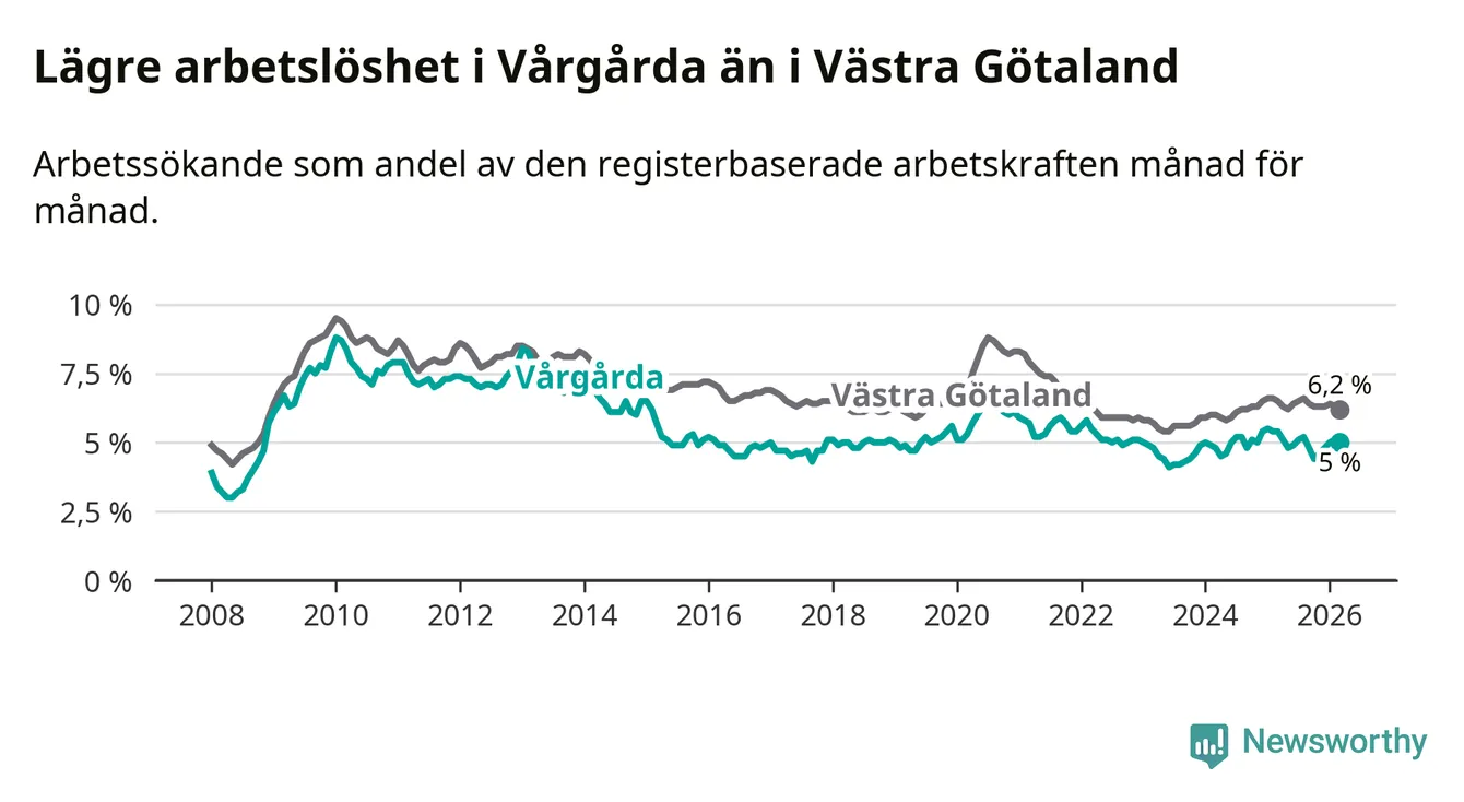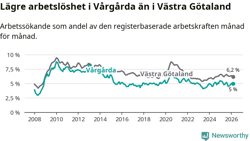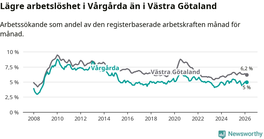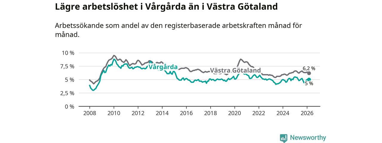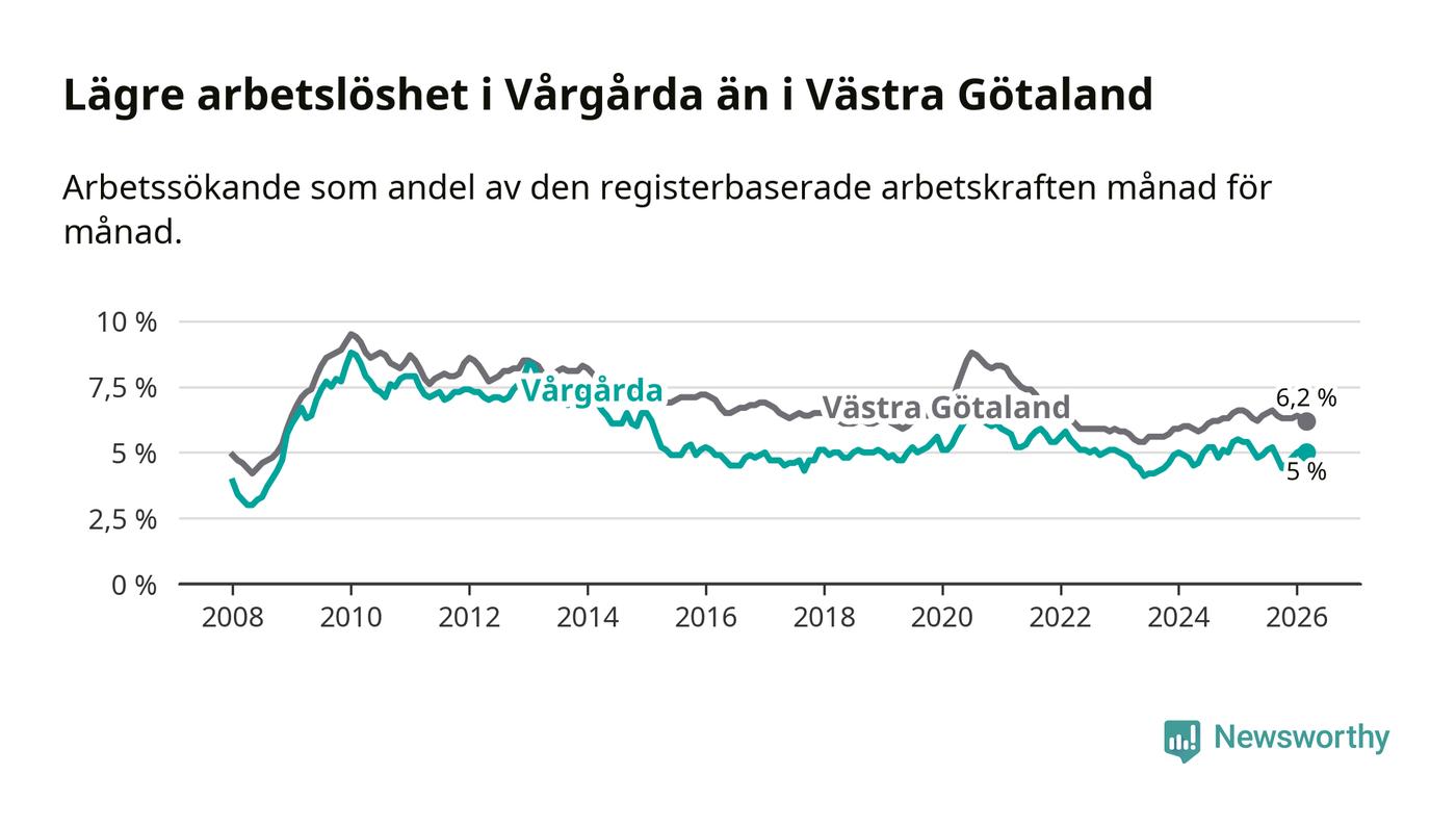 Under mars månad rapporterade Vårgårda kommun en total arbetslöshet på 5,0 procent. Det är en minskning jämfört med samma tidpunkt i fjol (−0,4 procentenheter). Även i Västra Götalands län sjunker arbetslösheten .