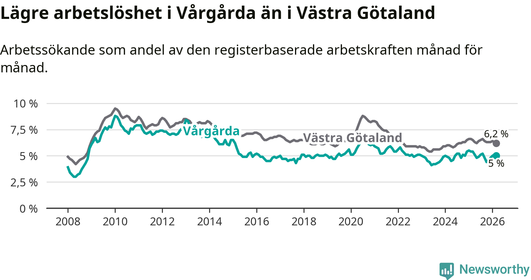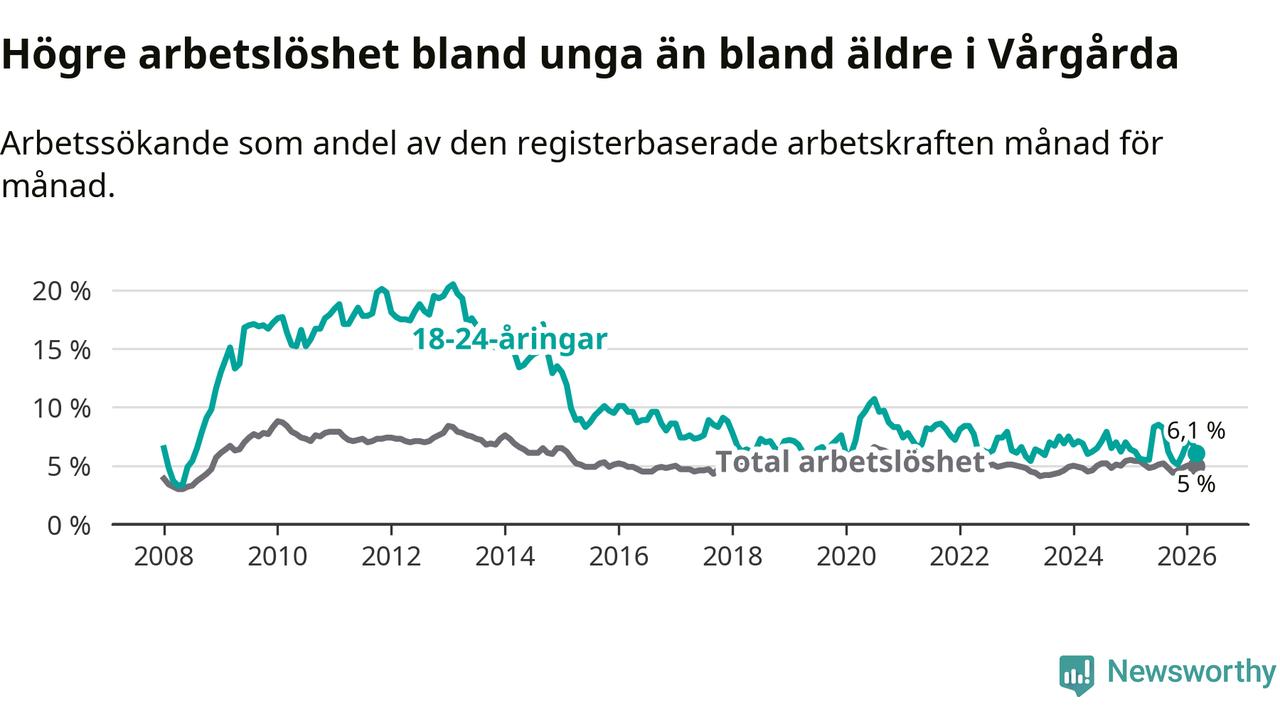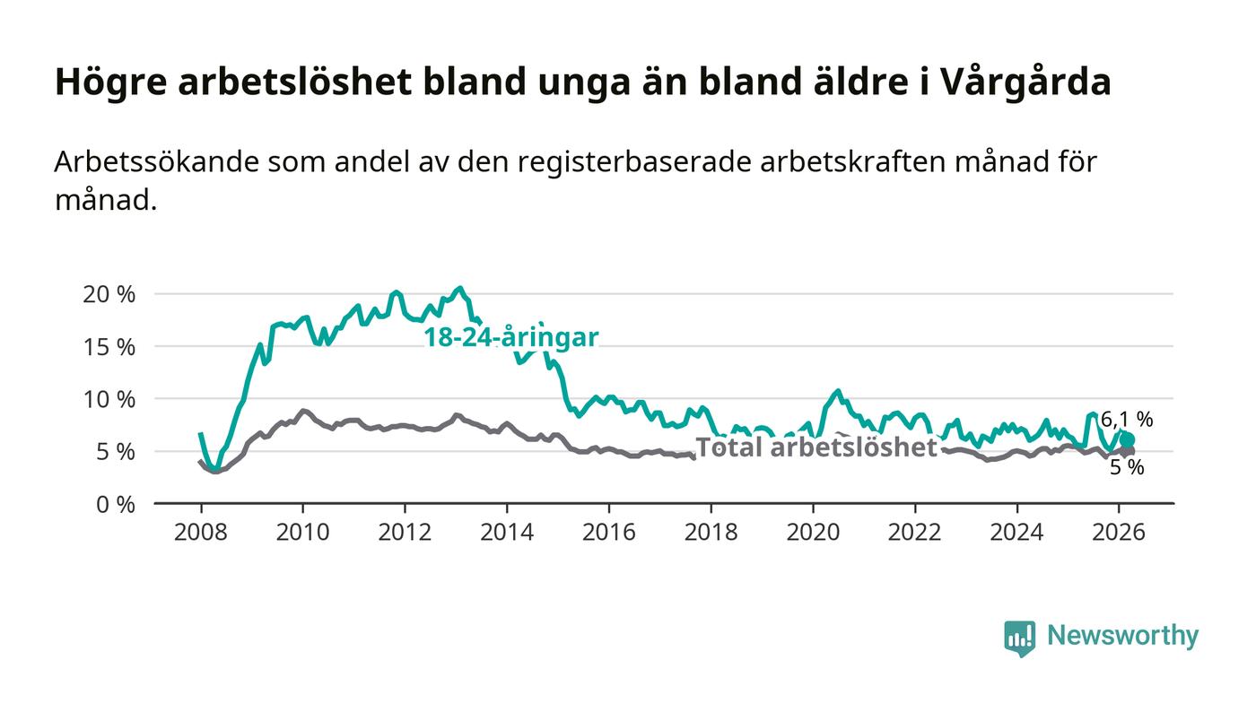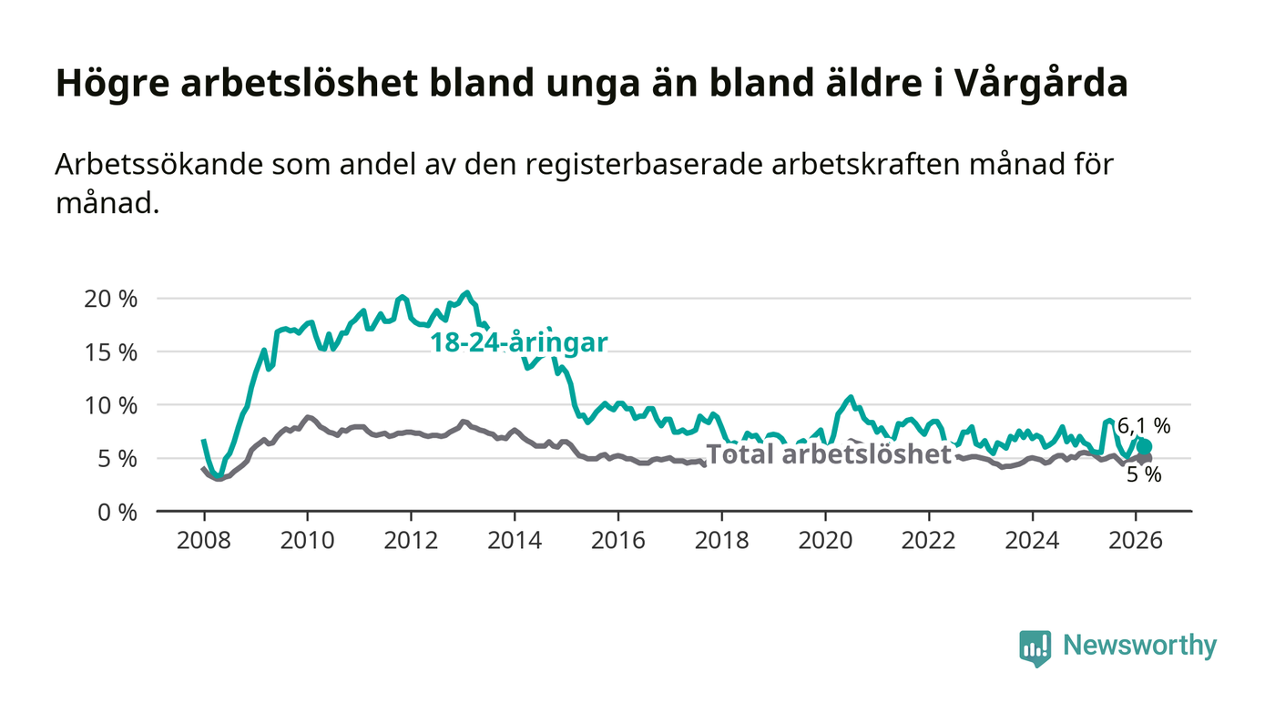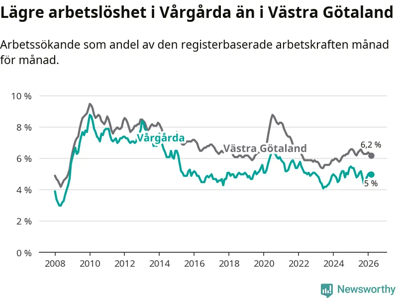 Under mars månad rapporterade Vårgårda kommun en total arbetslöshet på 5,0 procent. Det är en minskning jämfört med samma tidpunkt i fjol (−0,4 procentenheter). Även i Västra Götalands län sjunker arbetslösheten .