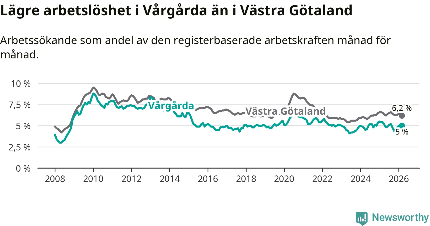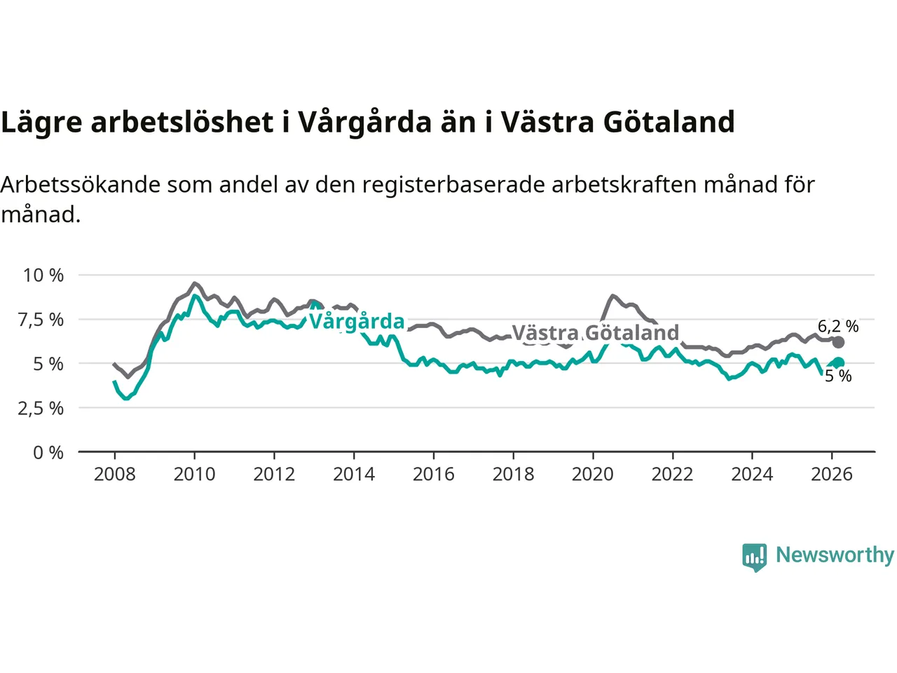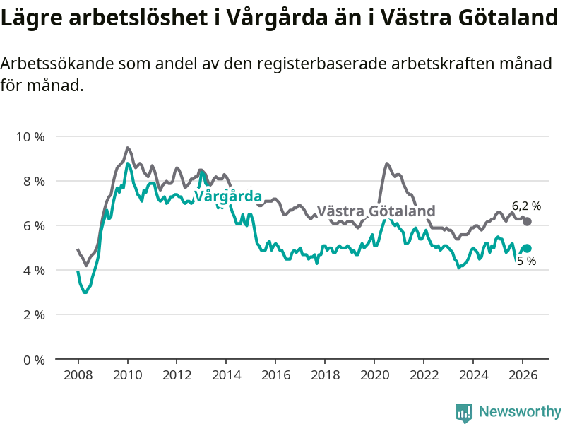Vårgårda hade redan tidigare lägre arbetslöshet än snittet i hela Västra Götalands län och nu växer klyftan (5,0 procent i kommunen, jämfört med 6,2 procent i hela länet). Öckerö har den lägsta arbetslösheten i länet (2,6 procent), medan Gullspång har den högsta (8,1 procent). För att Vårgårda skulle komma ner i samma arbetslöshetsnivå som Öckerö skulle 150 personer behöva sysselsättas.