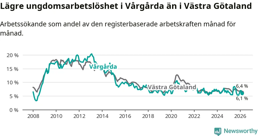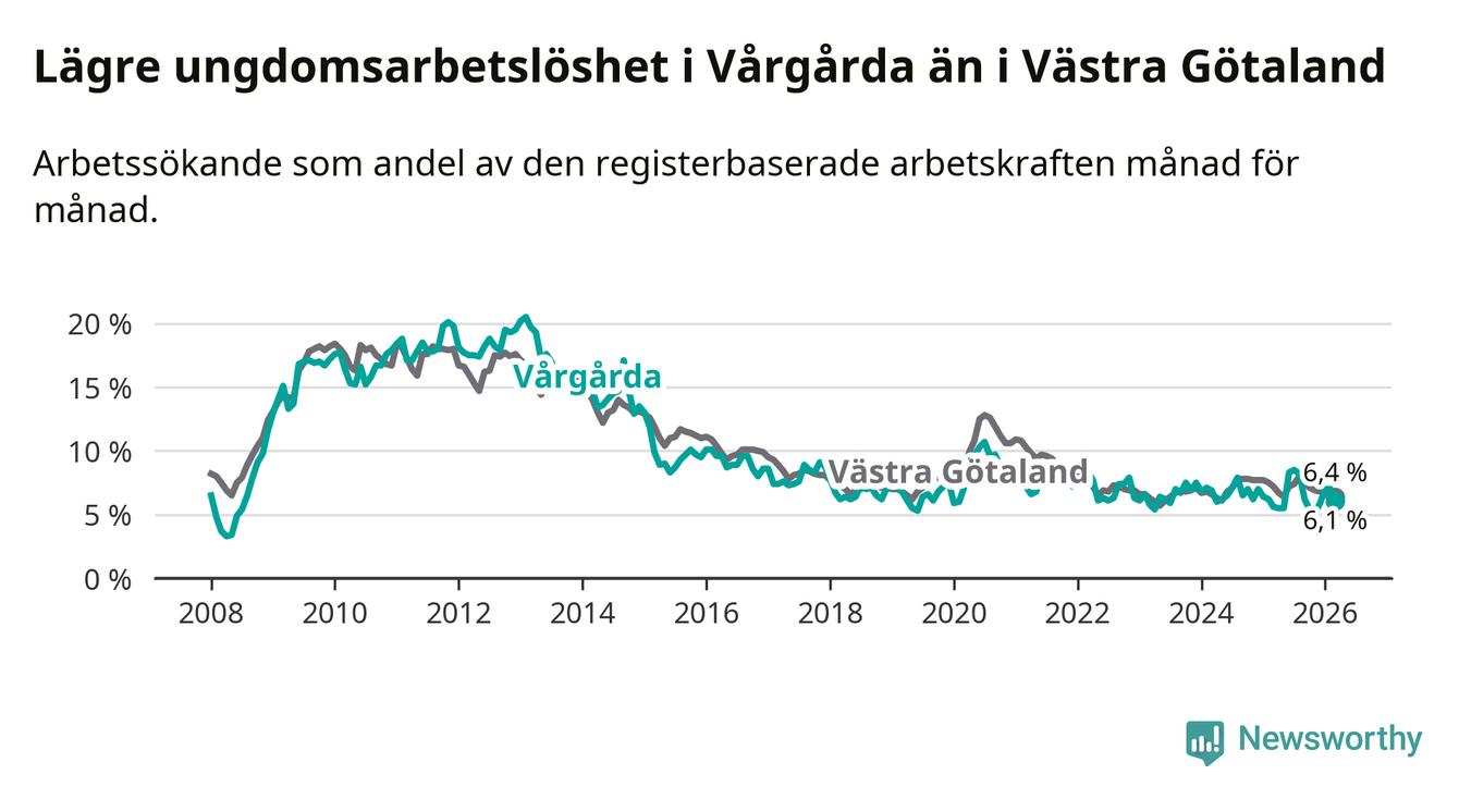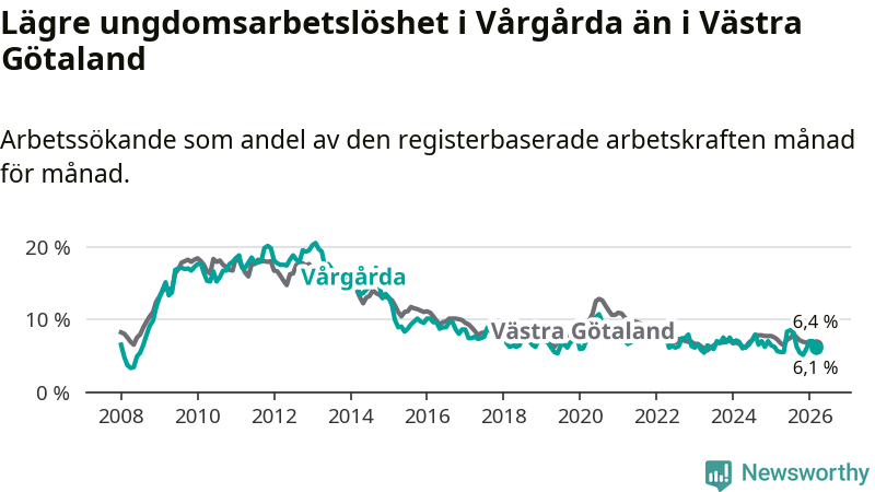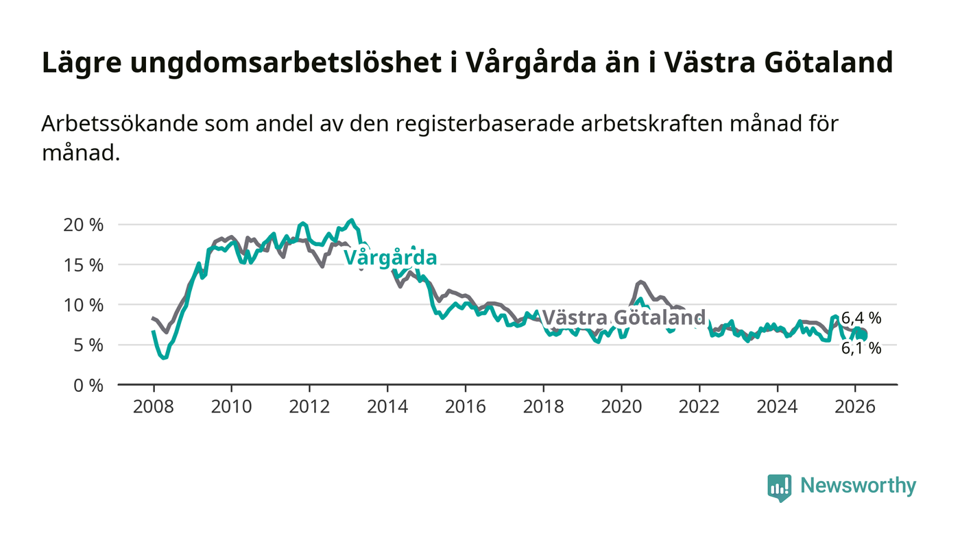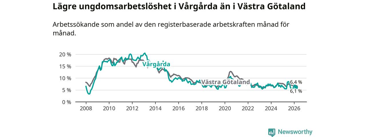 Precis som den totala arbetslösheten ligger ungdomsarbetslösheten i Vårgårda lägre än i Västra Götaland som helhet. Skillnaden mellan kommunen och länet är 0,3 procentenheter.
