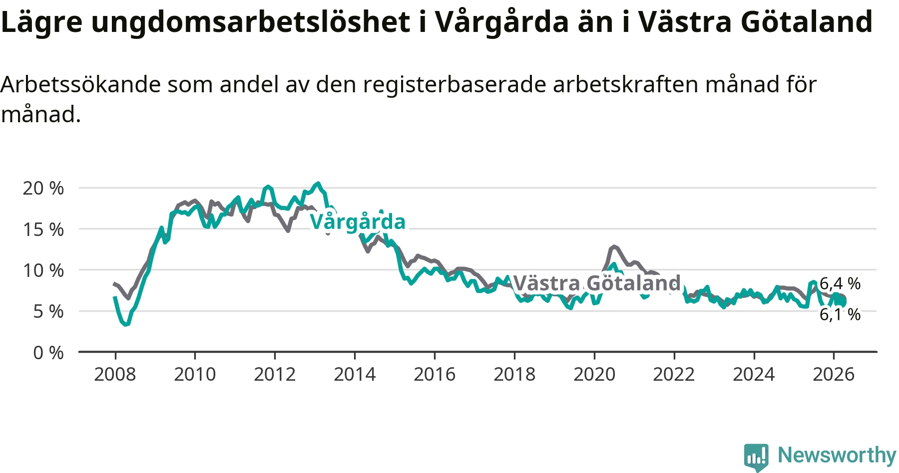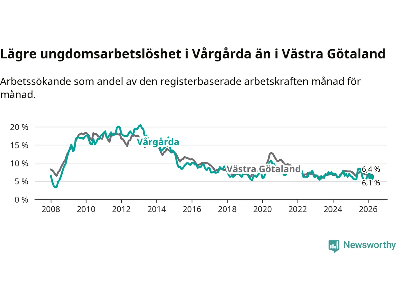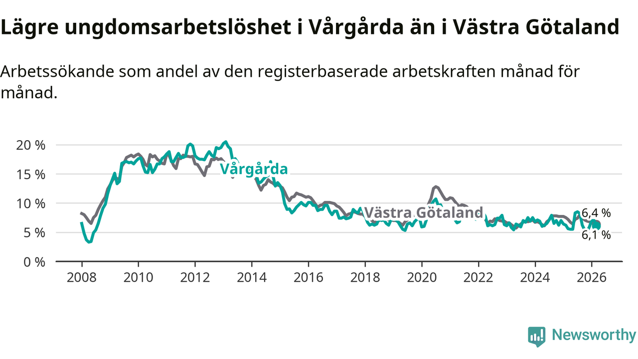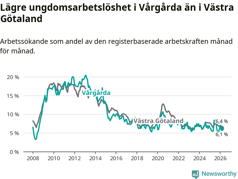 Precis som den totala arbetslösheten ligger ungdomsarbetslösheten i Vårgårda lägre än i Västra Götaland som helhet. Skillnaden mellan kommunen och länet är 0,3 procentenheter.