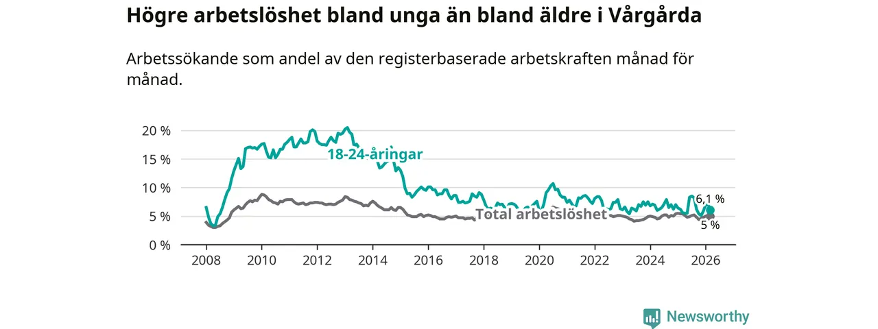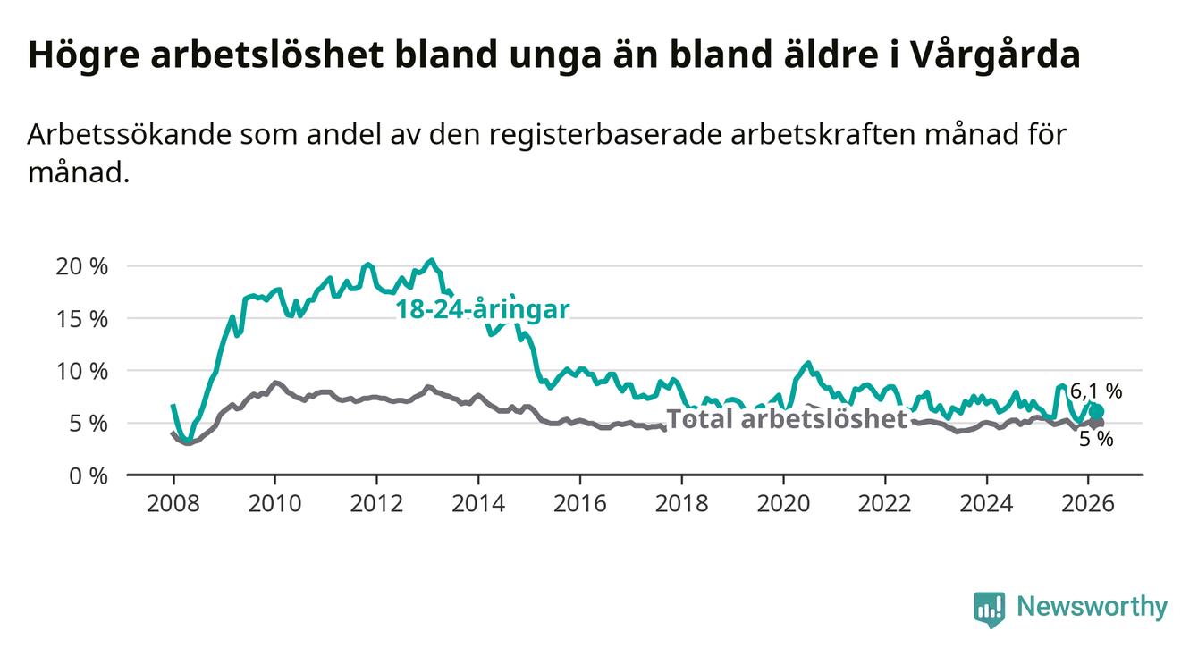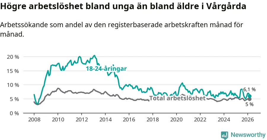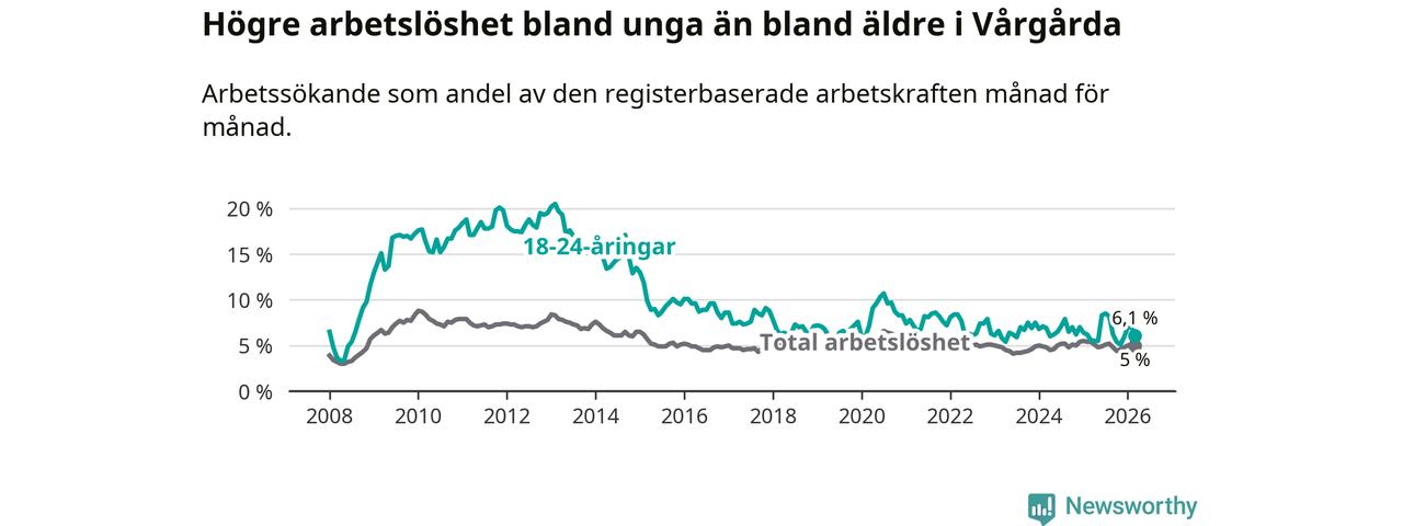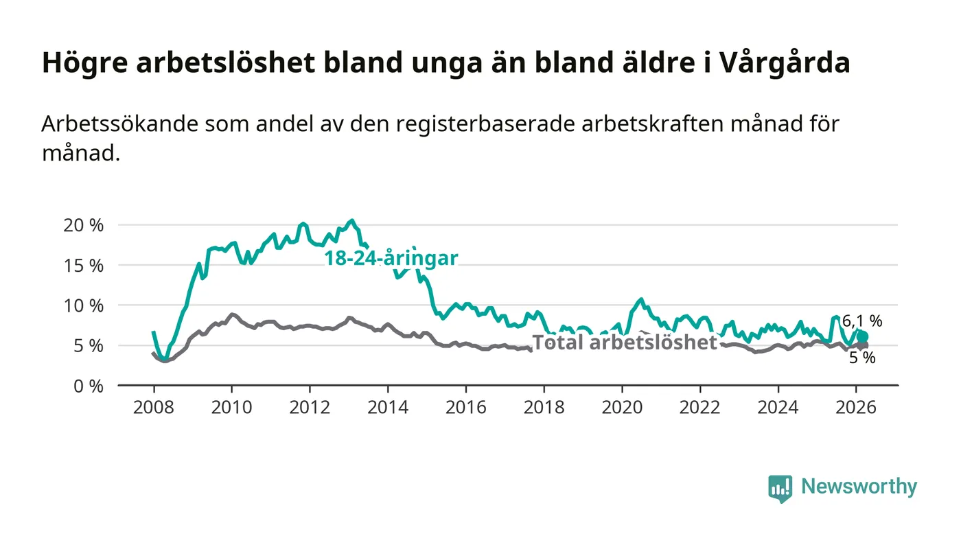 Till skillnad från den totala arbetslösheten stiger arbetslösheten bland unga (+0,5 procentenheter). I mars var 6,1 procent av 18–24-åringarna inskrivna som arbetssökande (motsvarande 38 personer). Mäter vi antalet inskrivna ser vi en ökning med två personer på ett års sikt.