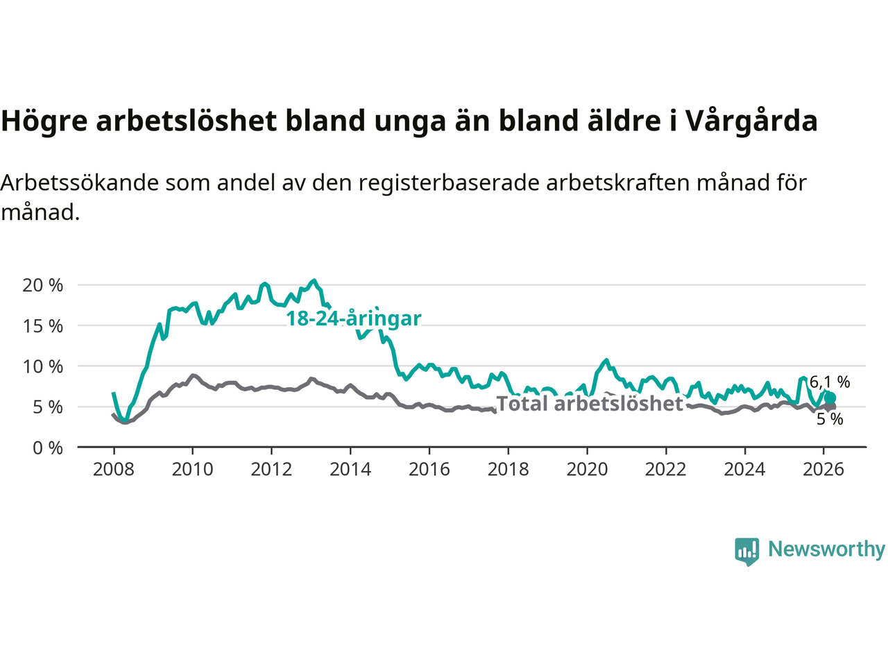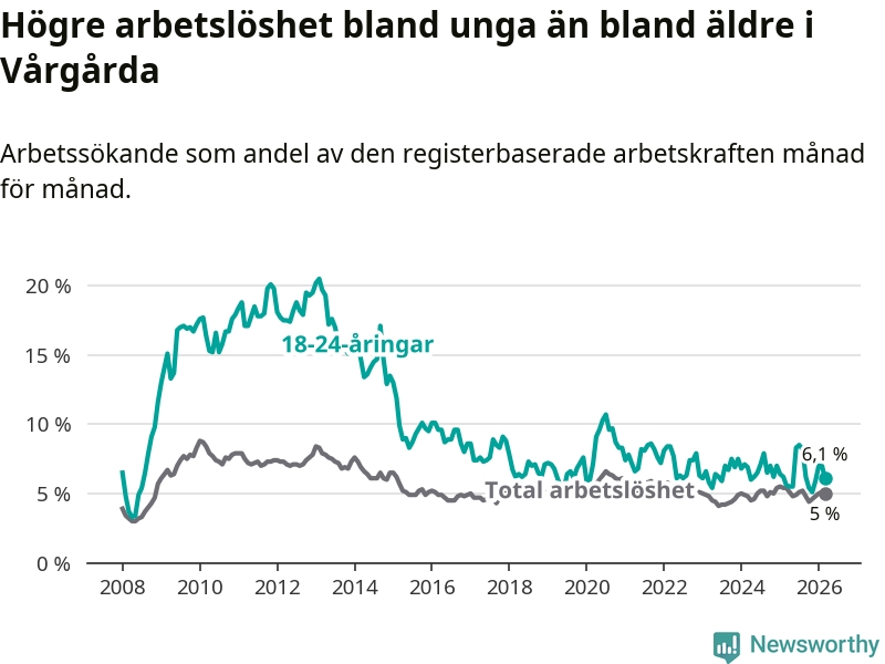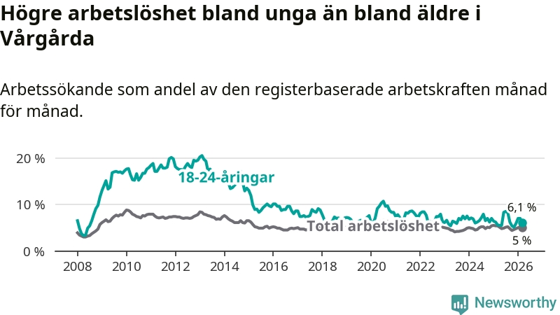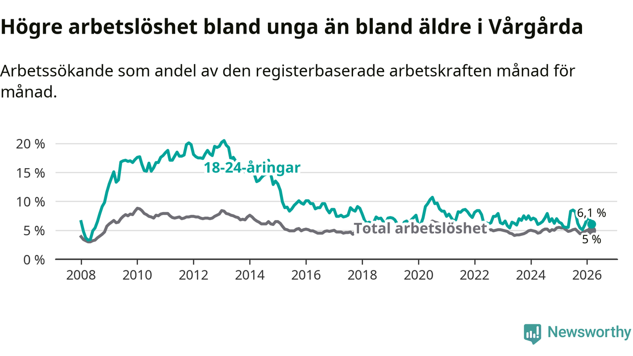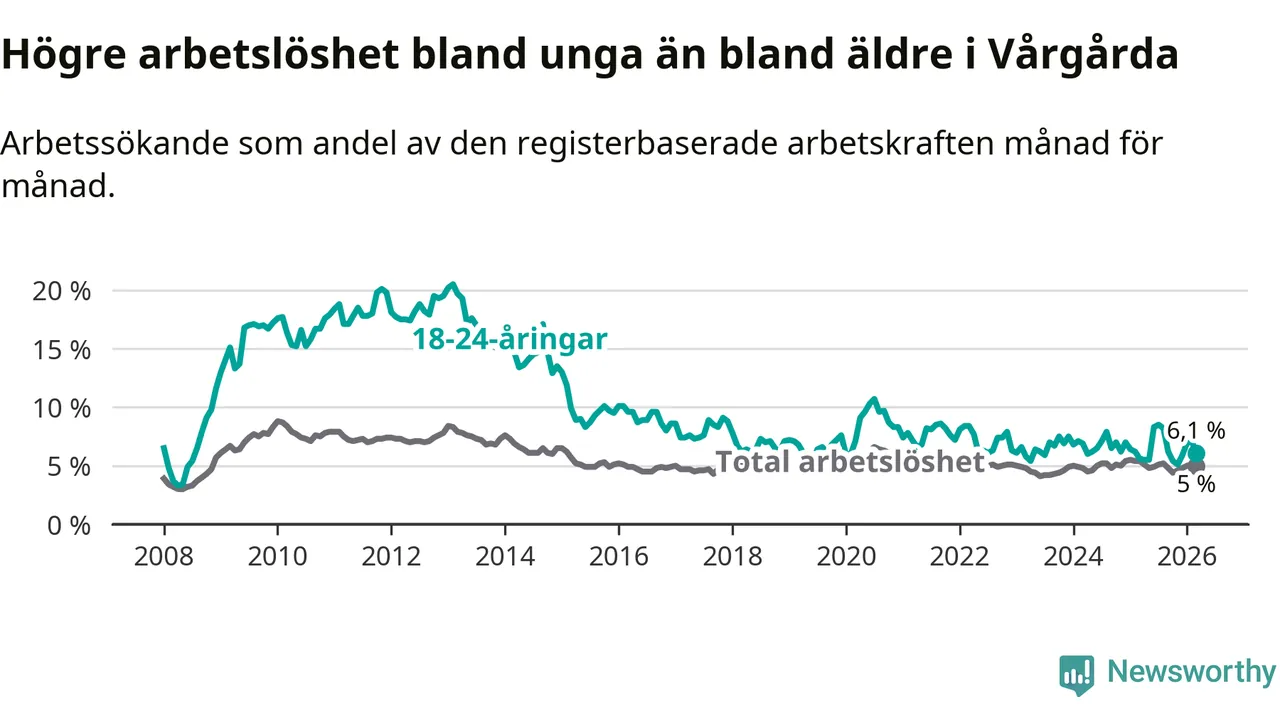 Till skillnad från den totala arbetslösheten stiger arbetslösheten bland unga (+0,5 procentenheter). I mars var 6,1 procent av 18–24-åringarna inskrivna som arbetssökande (motsvarande 38 personer). Mäter vi antalet inskrivna ser vi en ökning med två personer på ett års sikt.