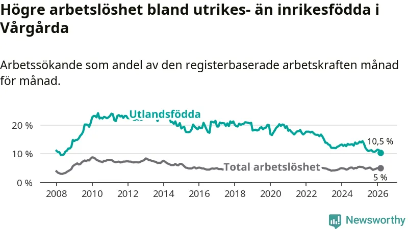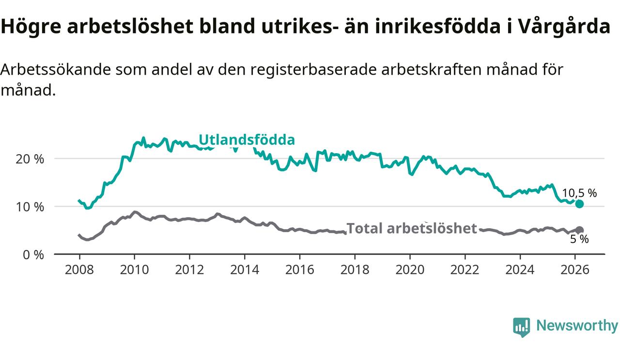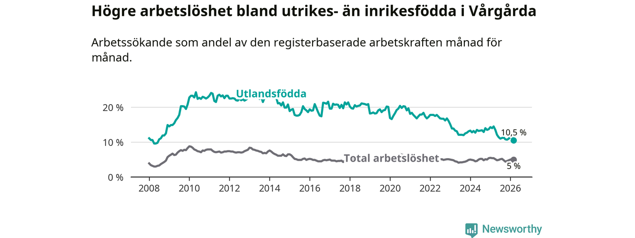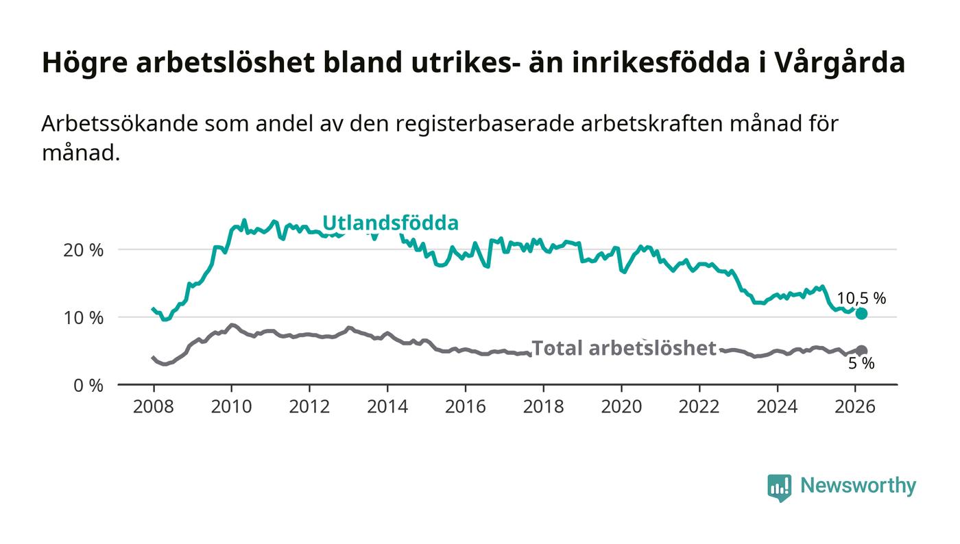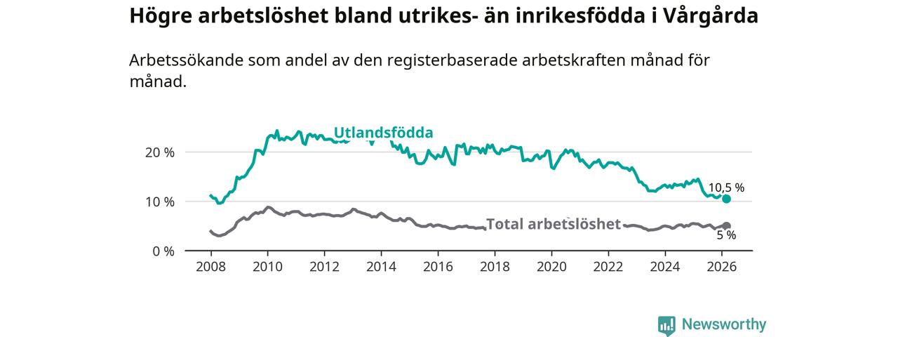 Arbetslösheten bland utlandsfödda var 10,5 procent i Vårgårda under mars månad, motsvarande 121 av 1 152 personer. Det är 4,0 procentenheter färre än vid samma tidpunkt i fjol (−40 om man räknar personer). Därmed är de utlandsföddas arbetslöshet lägre än vid samma tidpunkt i fjol för elfte månaden i följd. Sedan april 2025 har arbetslösheten bland utlandsfödda minskat från 13,5 till 10,5 procent. Den nuvarande arbetslöshetsnivån är den lägsta sedan juni 2008.