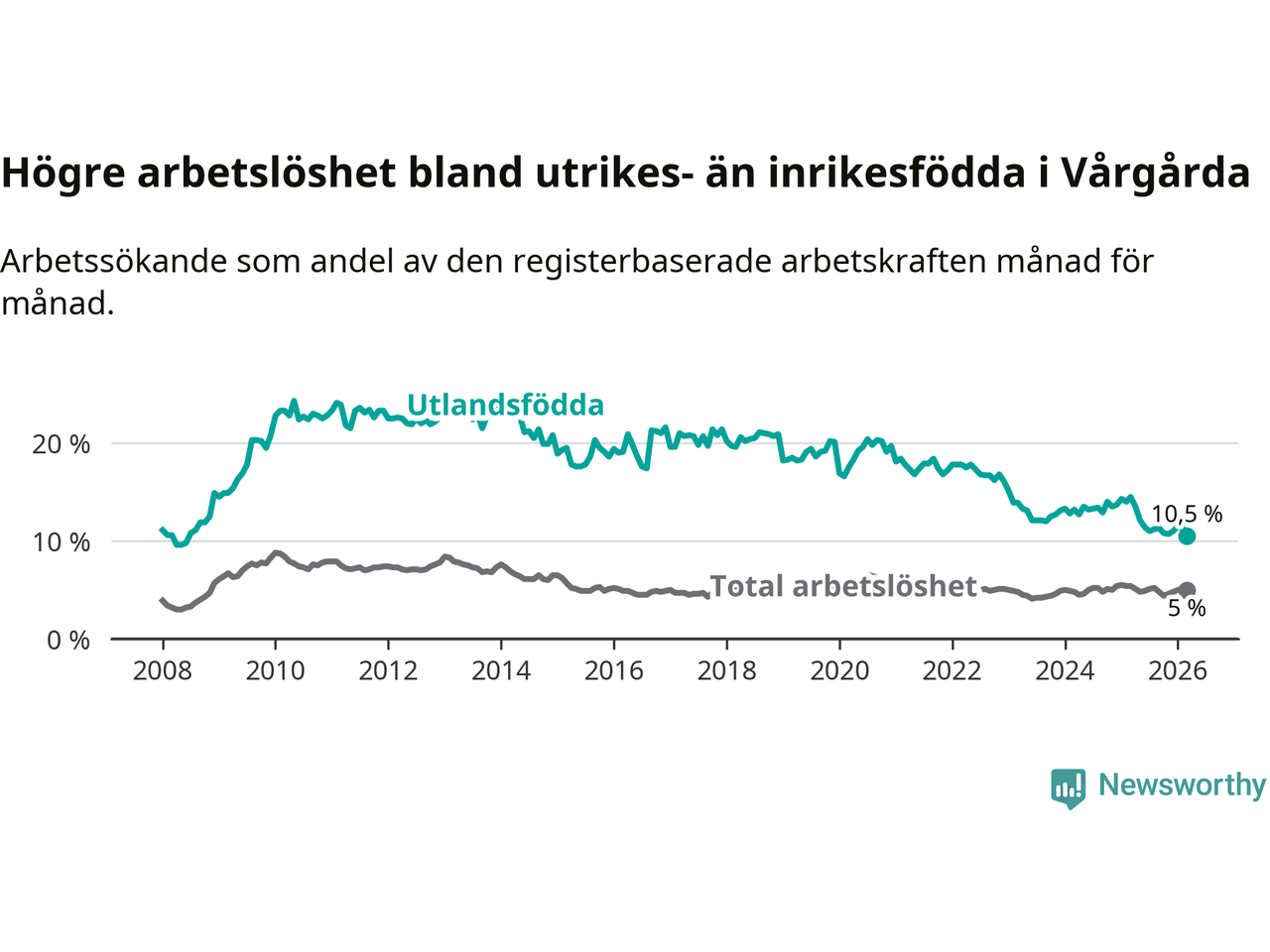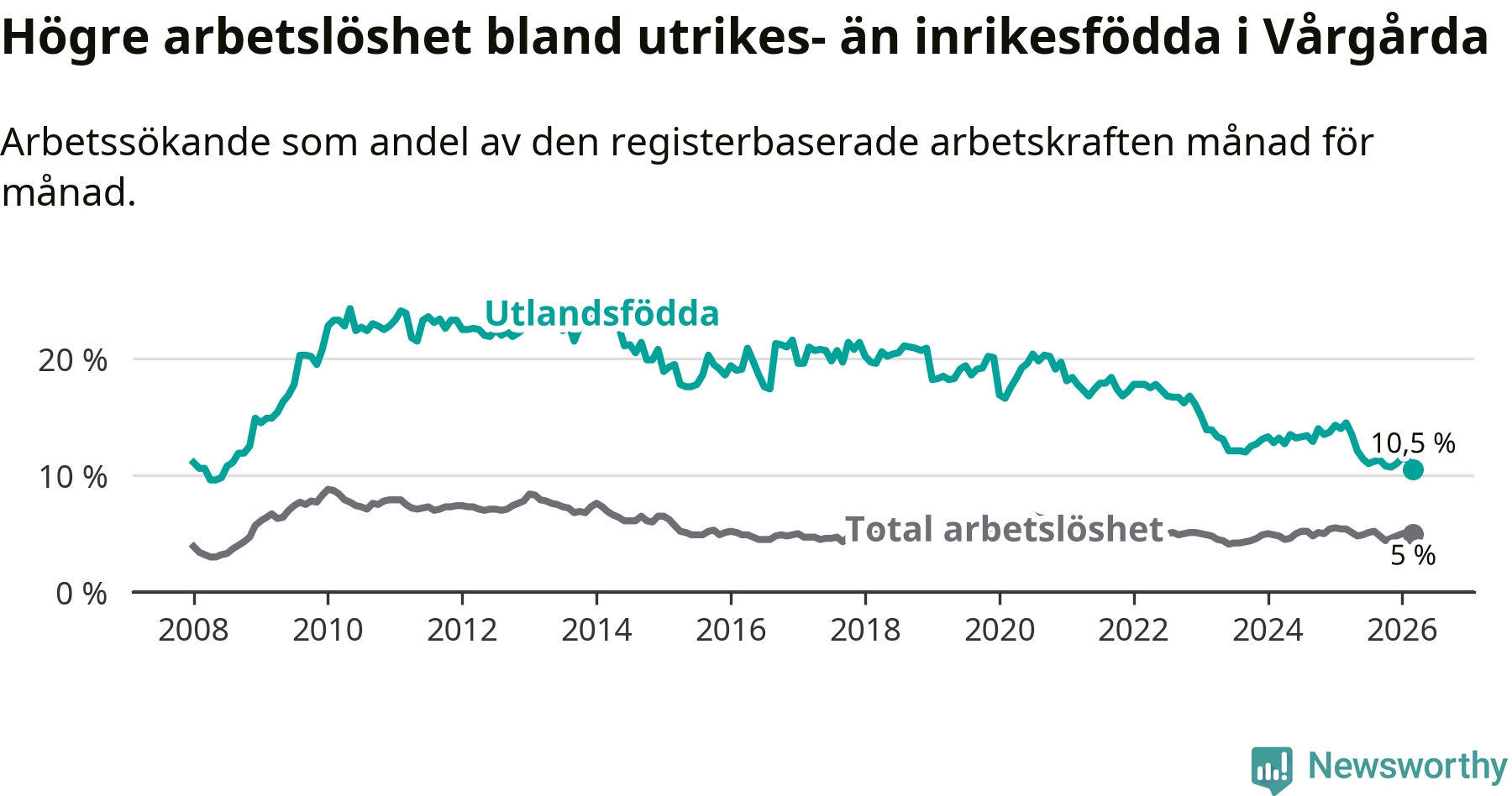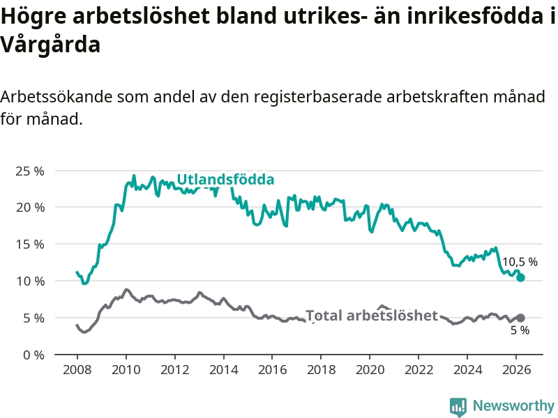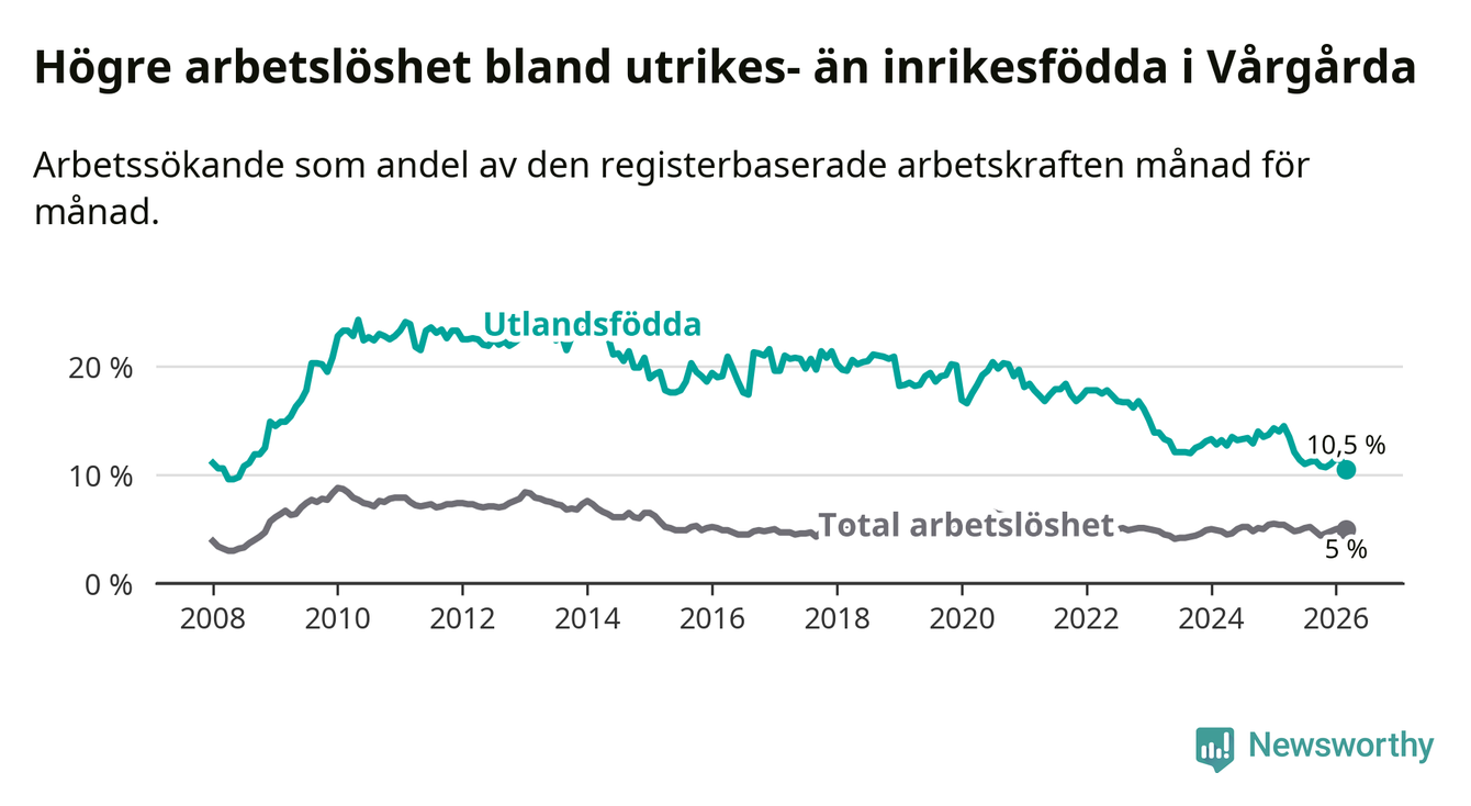 Arbetslösheten bland utlandsfödda var 10,5 procent i Vårgårda under mars månad, motsvarande 121 av 1 152 personer. Det är 4,0 procentenheter färre än vid samma tidpunkt i fjol (−40 om man räknar personer). Därmed är de utlandsföddas arbetslöshet lägre än vid samma tidpunkt i fjol för elfte månaden i följd. Sedan april 2025 har arbetslösheten bland utlandsfödda minskat från 13,5 till 10,5 procent. Den nuvarande arbetslöshetsnivån är den lägsta sedan juni 2008.