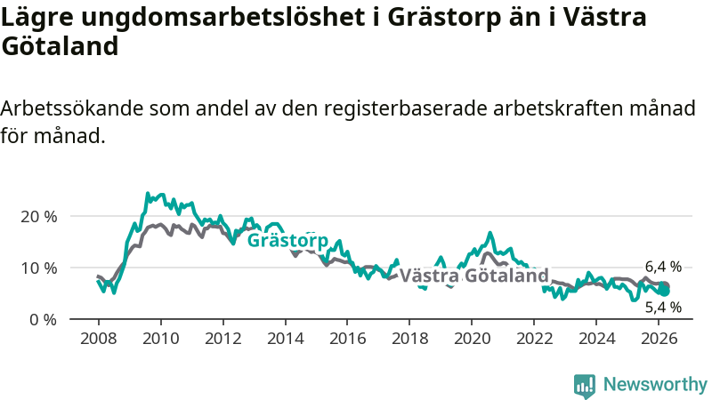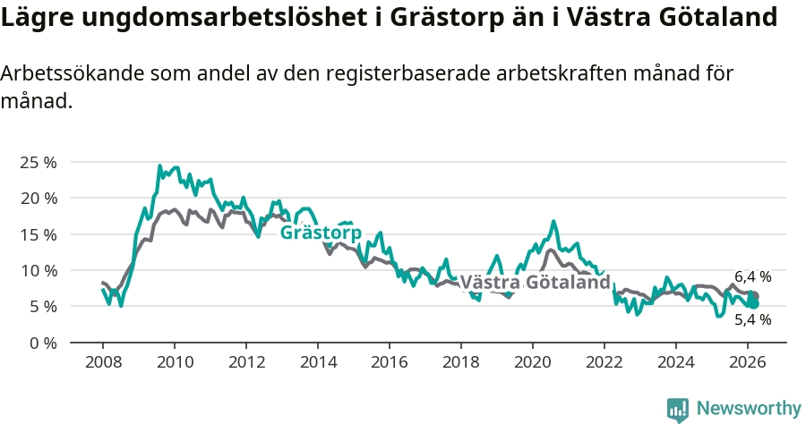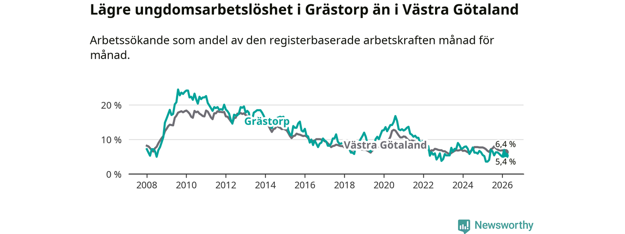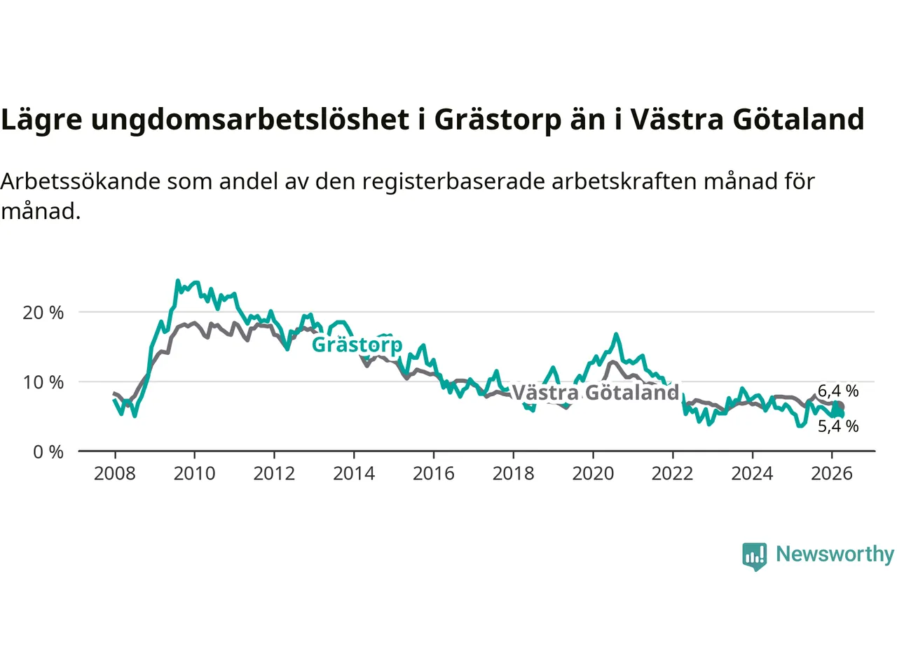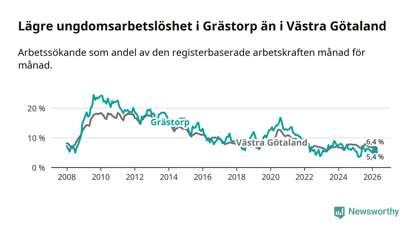 Precis som den totala arbetslösheten ligger ungdomsarbetslösheten i Grästorp lägre än i Västra Götaland som helhet. Skillnaden mellan kommunen och länet är 1,0 procentenheter.