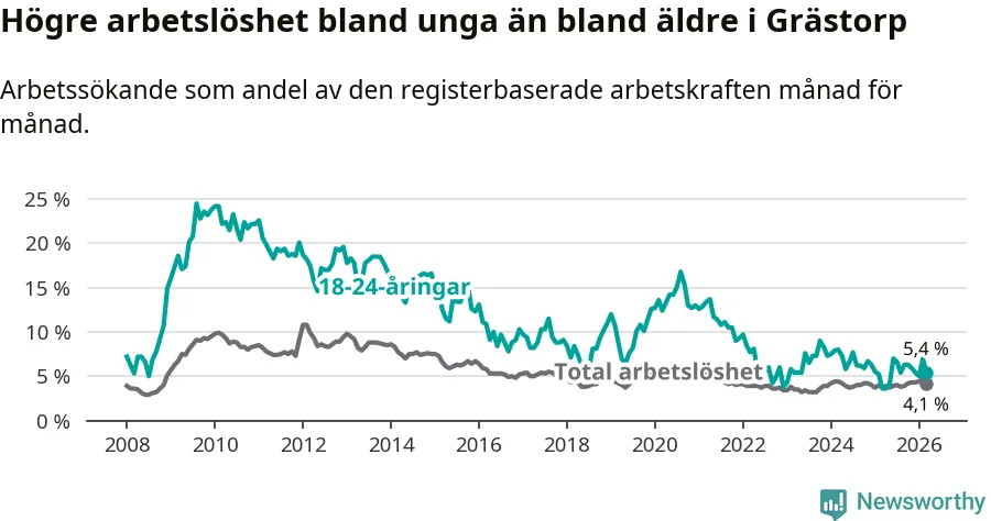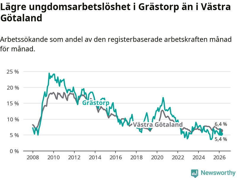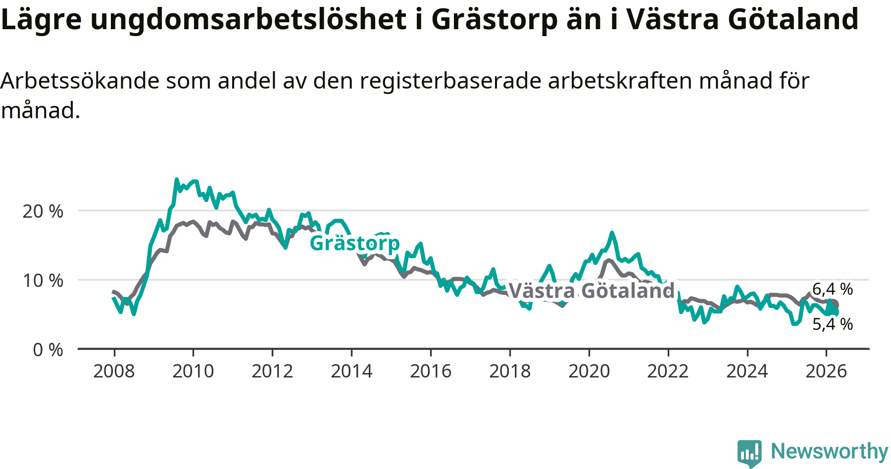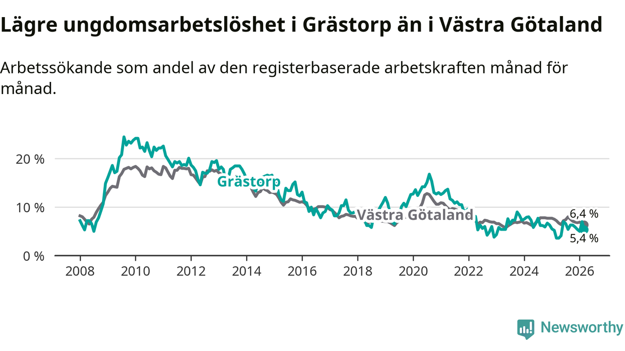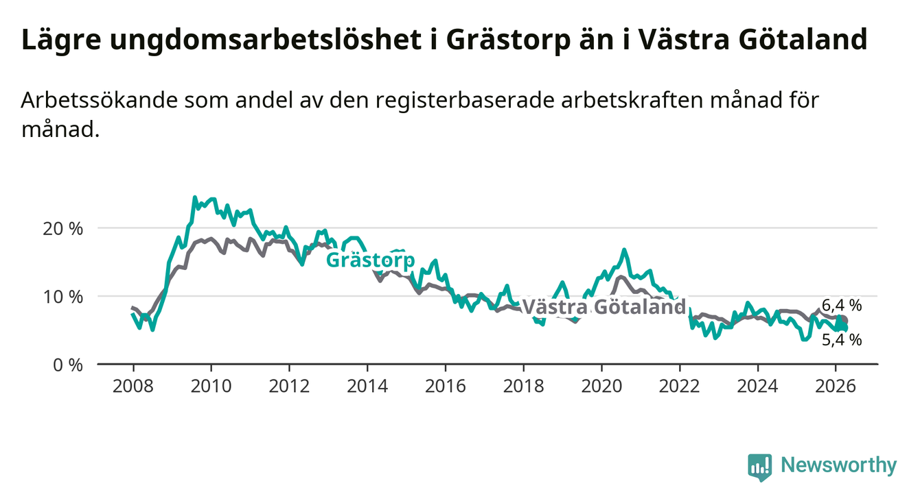 Precis som den totala arbetslösheten ligger ungdomsarbetslösheten i Grästorp lägre än i Västra Götaland som helhet. Skillnaden mellan kommunen och länet är 1,0 procentenheter.