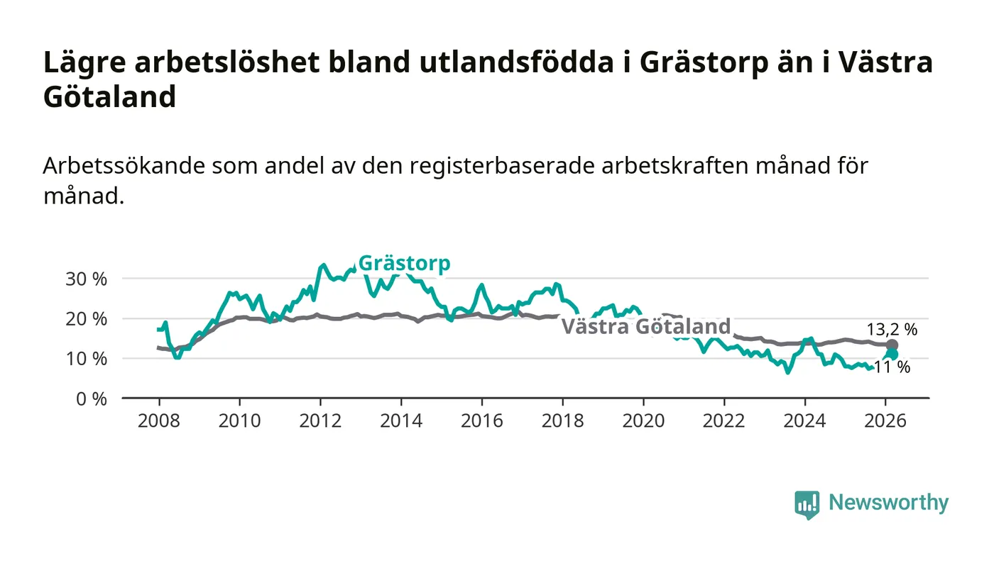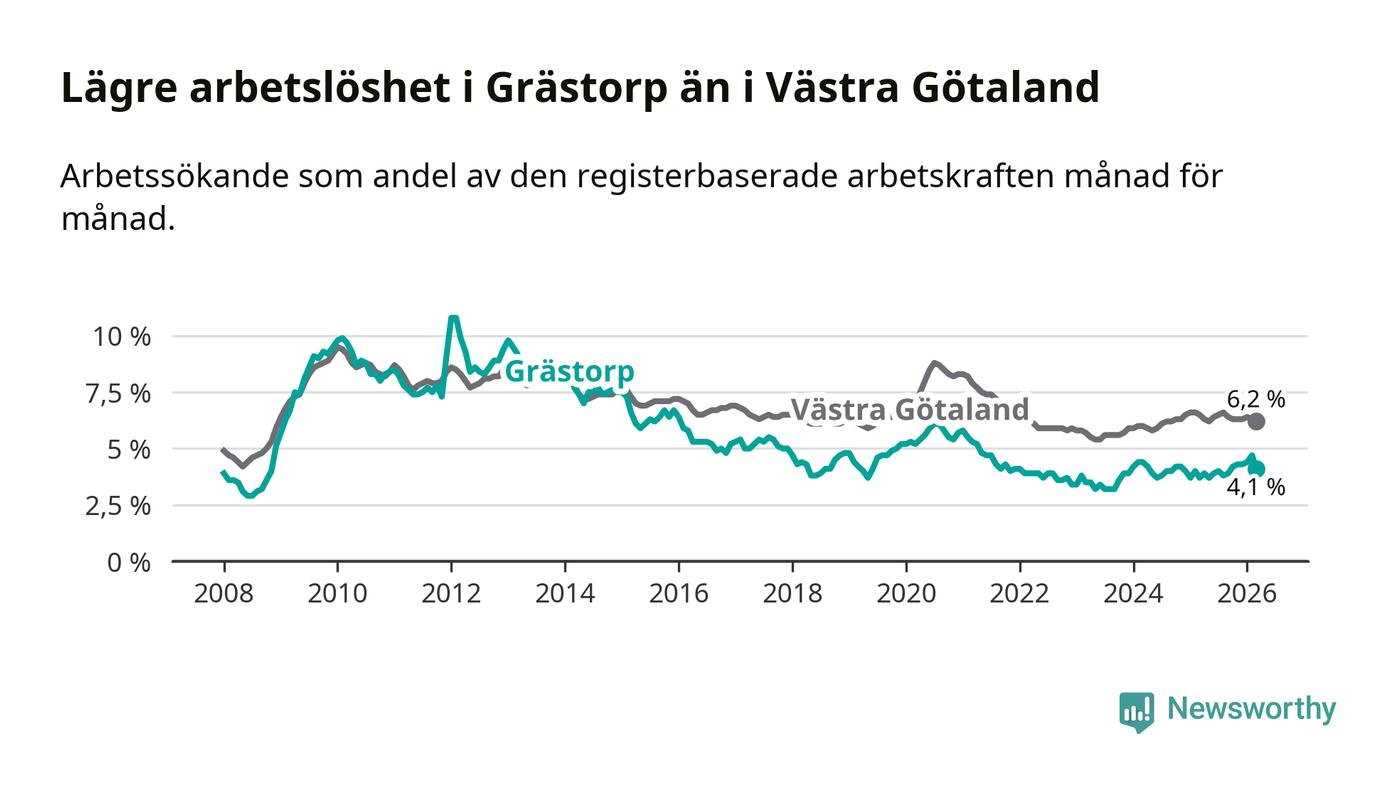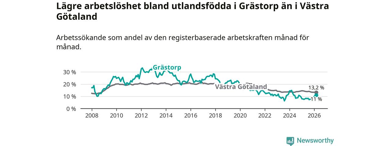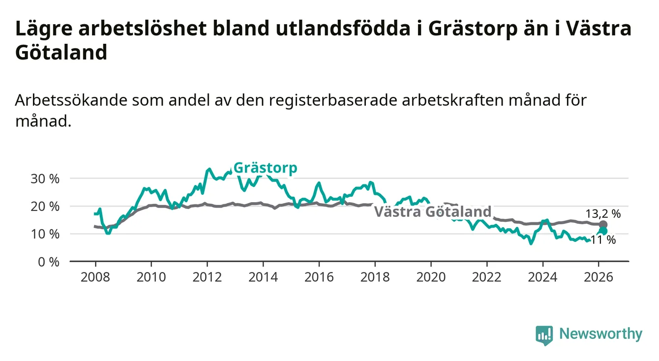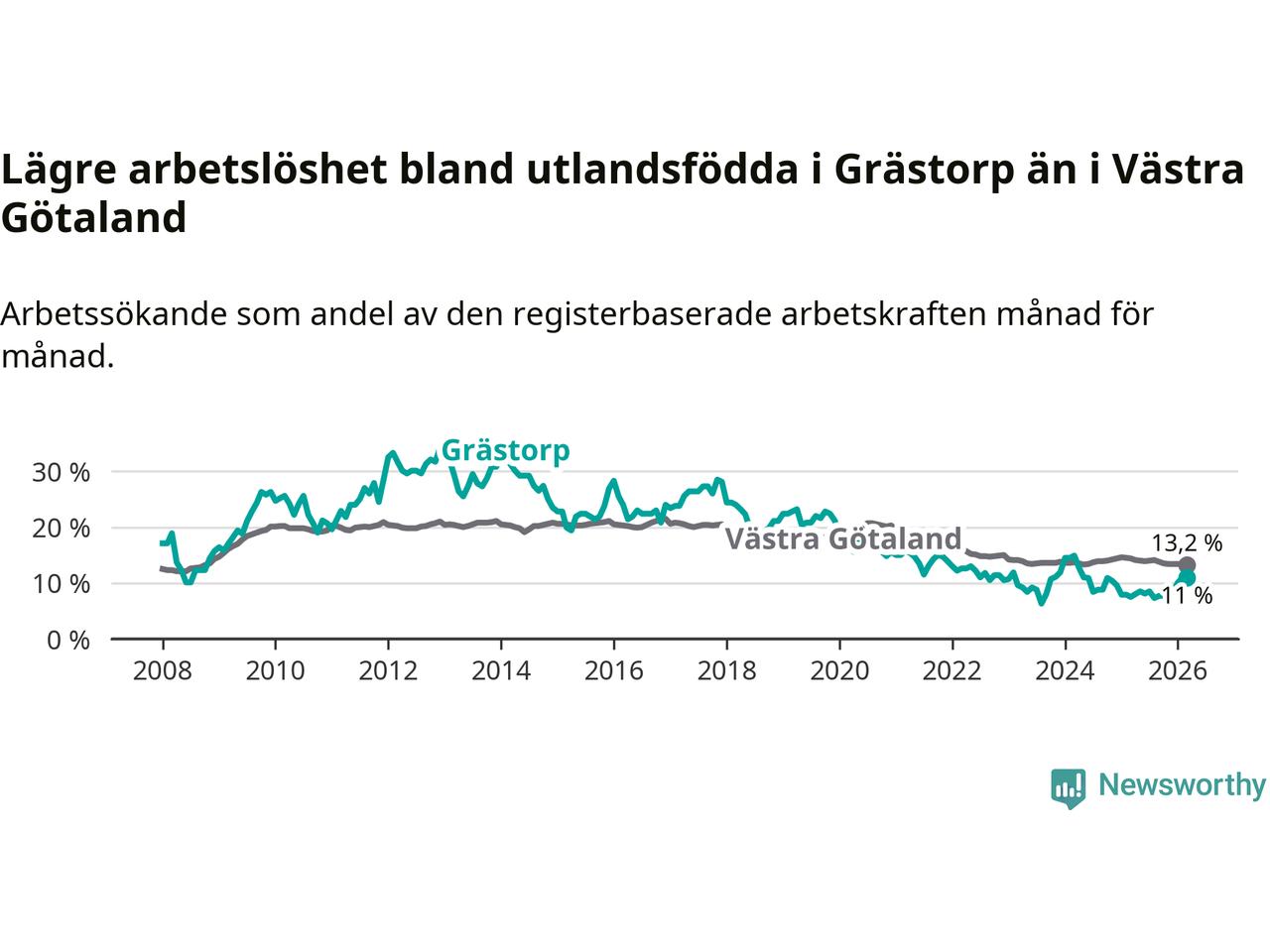 Medan arbetslösheten bland utlandsfödda alltså ökar i Grästorp så minskar den i Västra Götaland. Jämfört med mars förra året har andelen arbetslösa utlandsfödda i länet minskat med 1,2 procentenheter (till 13,2 procent). Trots den senaste uppgången har Grästorp med andra ord fortfarande lägre arbetslöshet bland utlandsfödda än Västra Götaland.