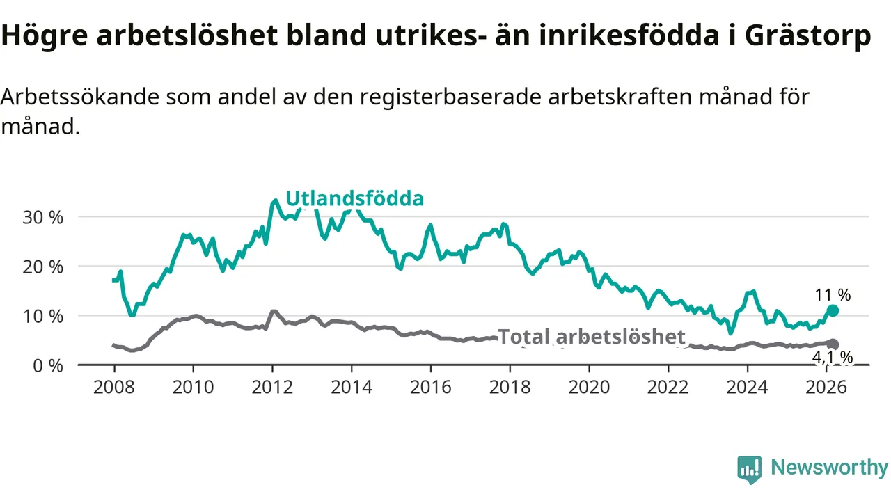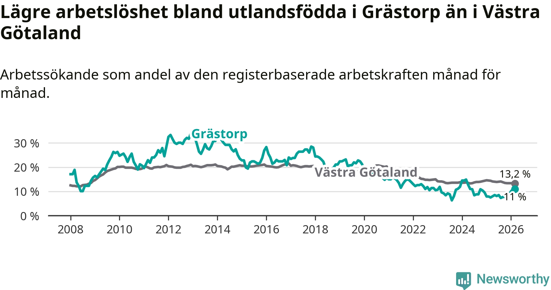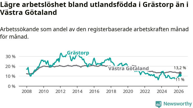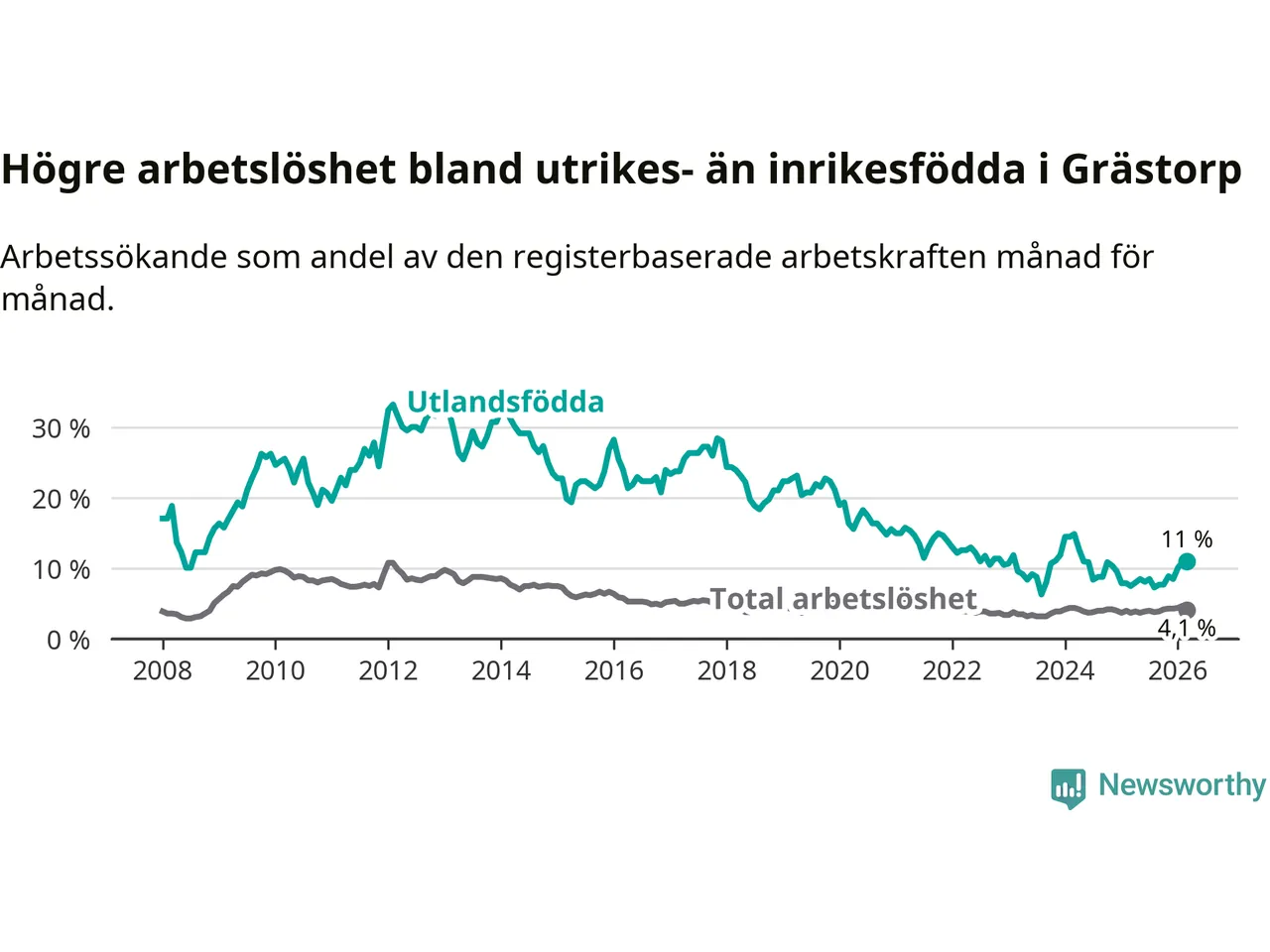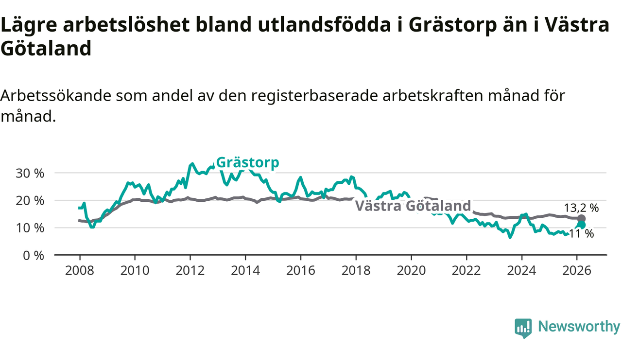 Medan arbetslösheten bland utlandsfödda alltså ökar i Grästorp så minskar den i Västra Götaland. Jämfört med mars förra året har andelen arbetslösa utlandsfödda i länet minskat med 1,2 procentenheter (till 13,2 procent). Trots den senaste uppgången har Grästorp med andra ord fortfarande lägre arbetslöshet bland utlandsfödda än Västra Götaland.
