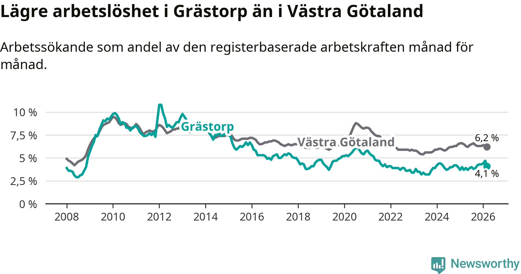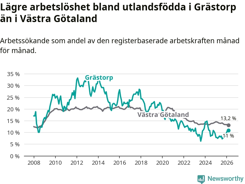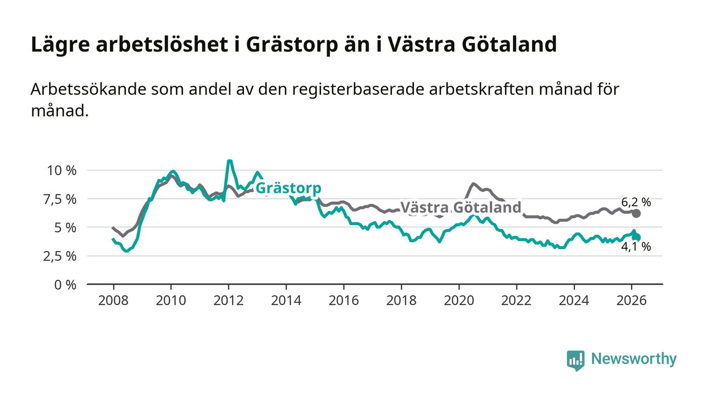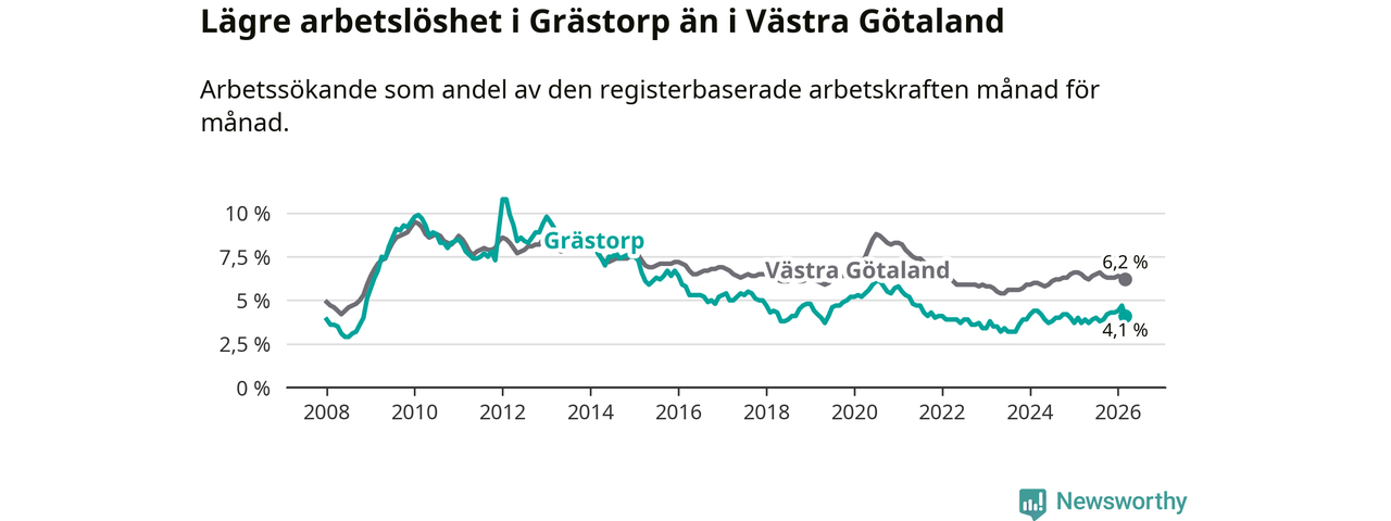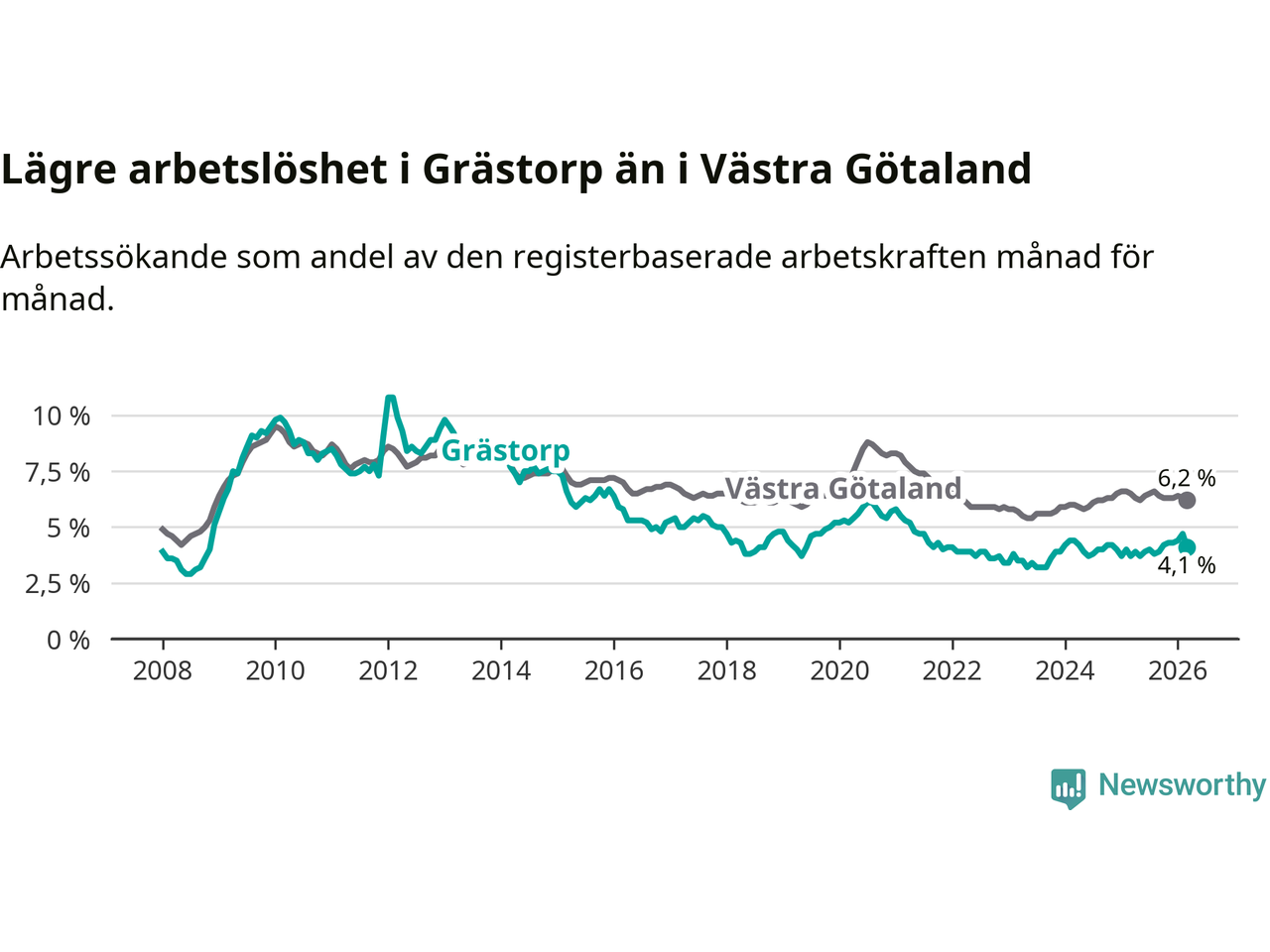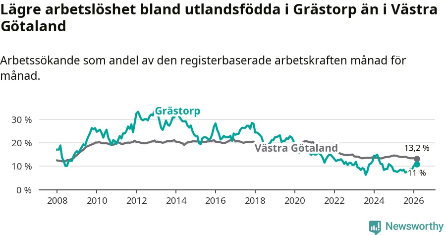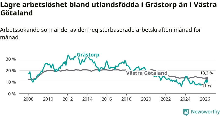 Medan arbetslösheten bland utlandsfödda alltså ökar i Grästorp så minskar den i Västra Götaland. Jämfört med mars förra året har andelen arbetslösa utlandsfödda i länet minskat med 1,2 procentenheter (till 13,2 procent). Trots den senaste uppgången har Grästorp med andra ord fortfarande lägre arbetslöshet bland utlandsfödda än Västra Götaland.